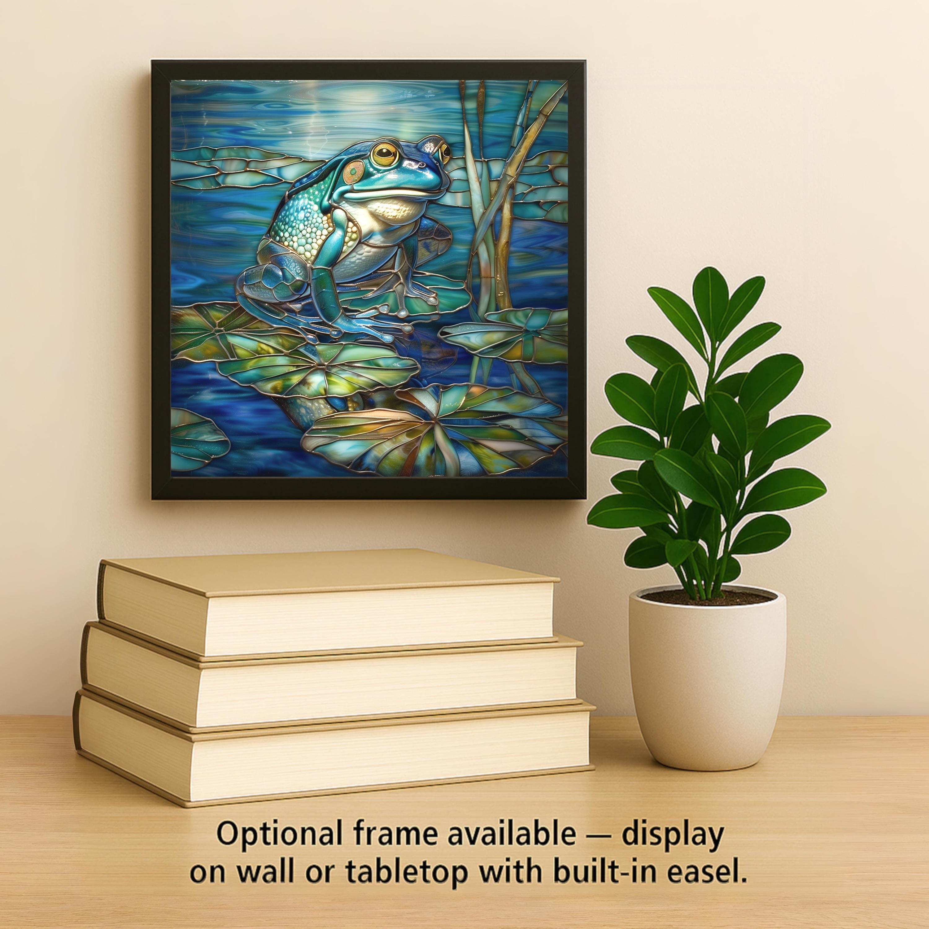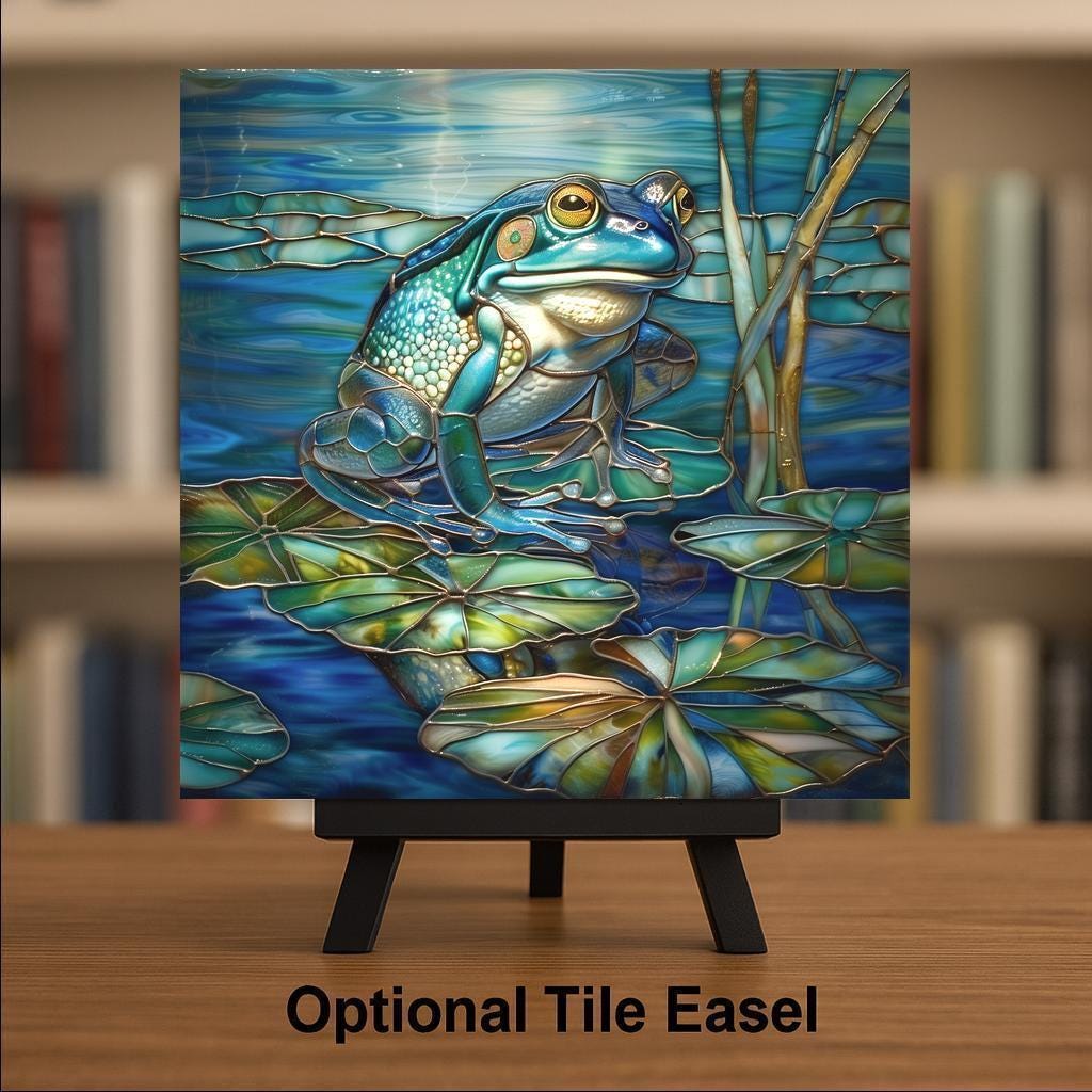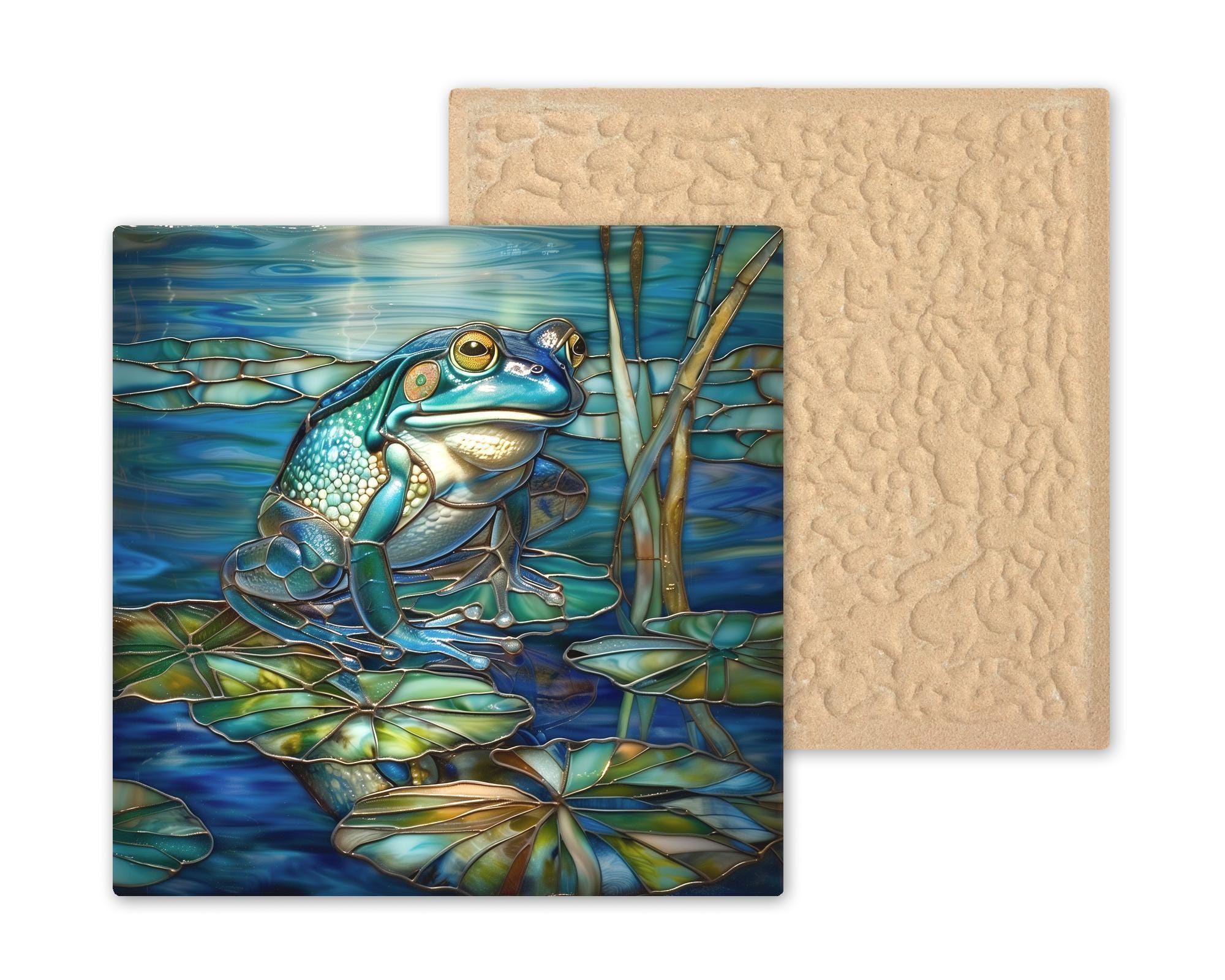 This Blue Frog Ceramic Tile Wall Art brings the tranquil charm of a water garden into your living space. Designed in a luminous stained-glass-inspired style, the frog’s turquoise hues shimmer against rich teal waters and glowing green lily pads. The intricate detail and color depth are infused directly into ceramic through sublimation, producing a glossy, fade-resistant finish that captures light beautifully.