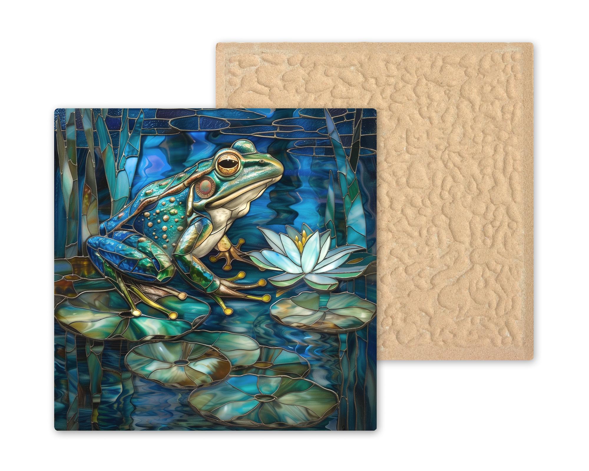 Bring a touch of natural magic into your home with this Frog Ceramic Tile Wall Art. Inspired by the peaceful stillness of a lily pond, the design features a richly detailed blue-green frog among floating pads and a blooming lotus flower. The stained-glass-style illustration creates a captivating play of light and color, glowing beautifully when placed near sunlight.