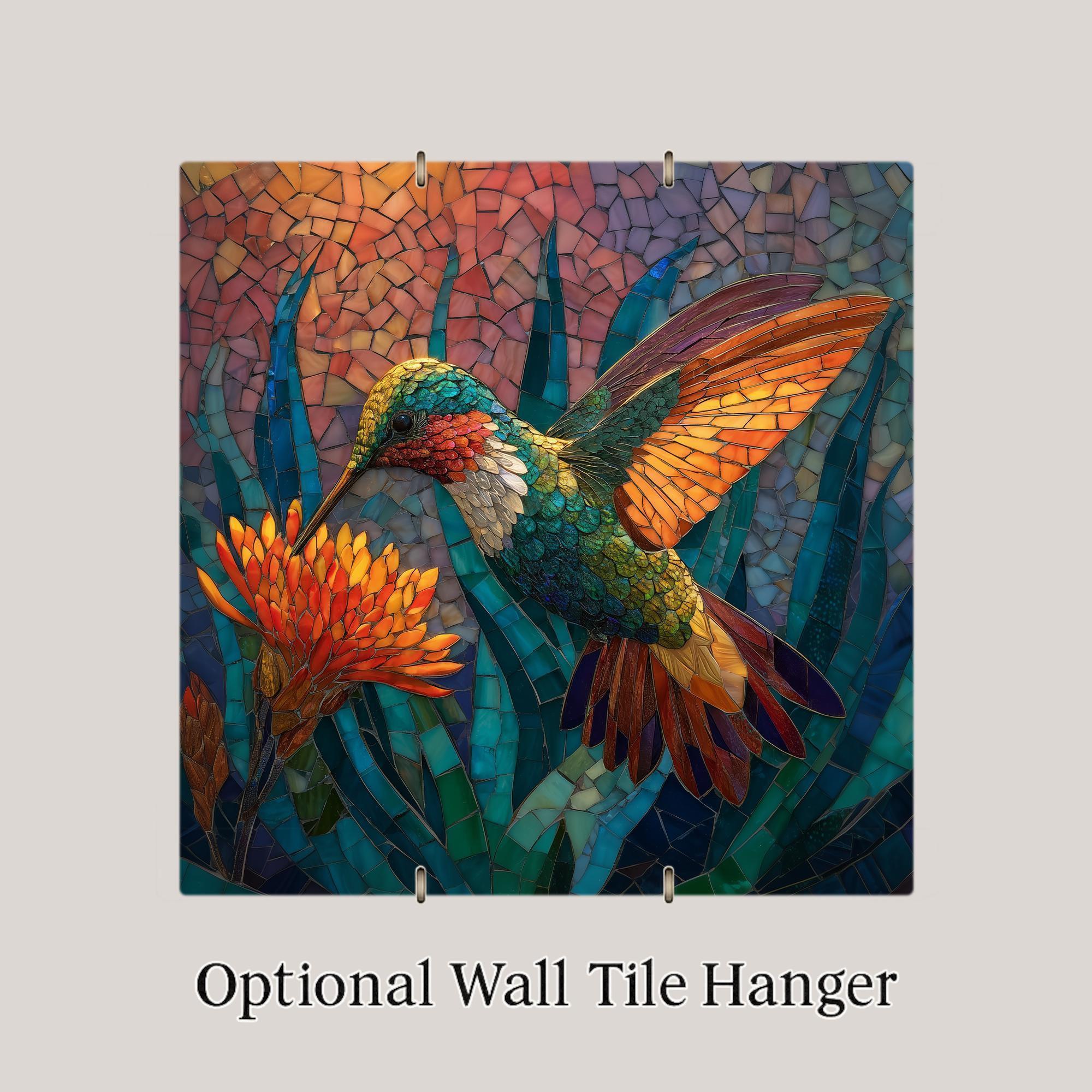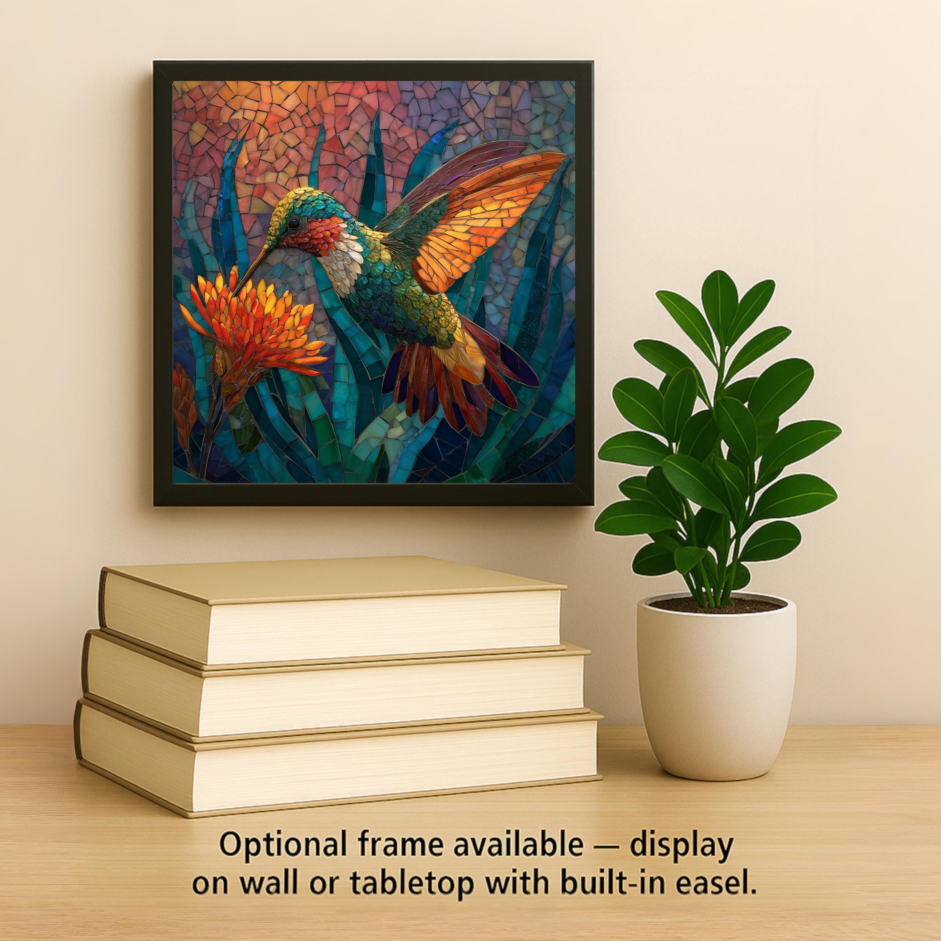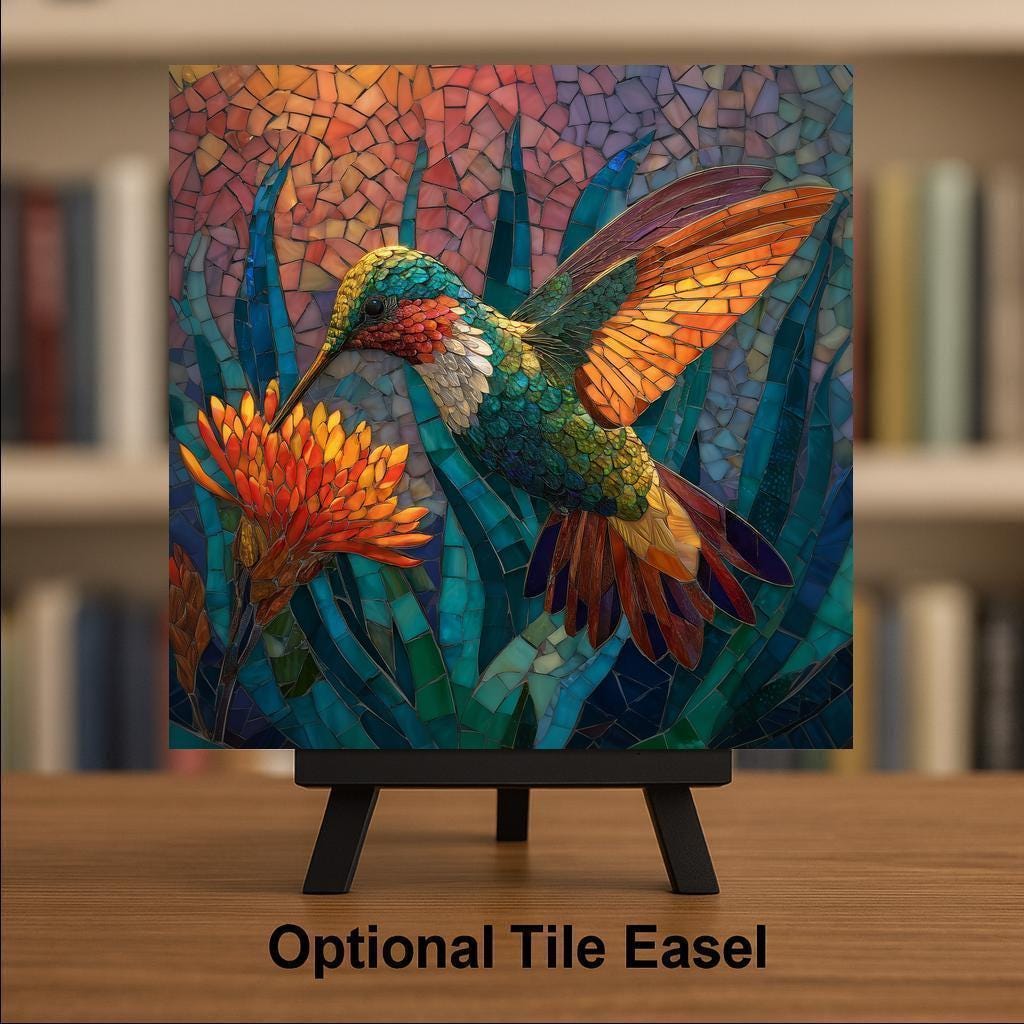 Whether hung near a window, displayed on a stand, or framed, the hummingbird tile changes subtly with the light—making it feel alive and dynamic. Optional upgrades include a tile wall hanger, easel tile stand, cork backing, and a premium frame for flexible display.
