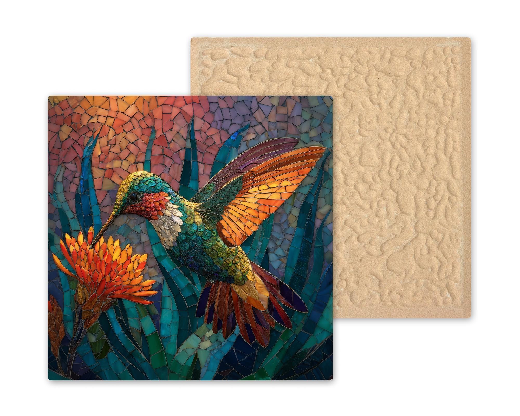 Add color and elegance to your space with this Stained Glass Style Hummingbird Ceramic Tile Art. Featuring a golden-winged hummingbird hovering over glowing orange flowers, this artwork radiates warmth and joy. The vivid sunset palette of teal, coral, and gold adds life to any room, creating an uplifting, nature-inspired centerpiece.