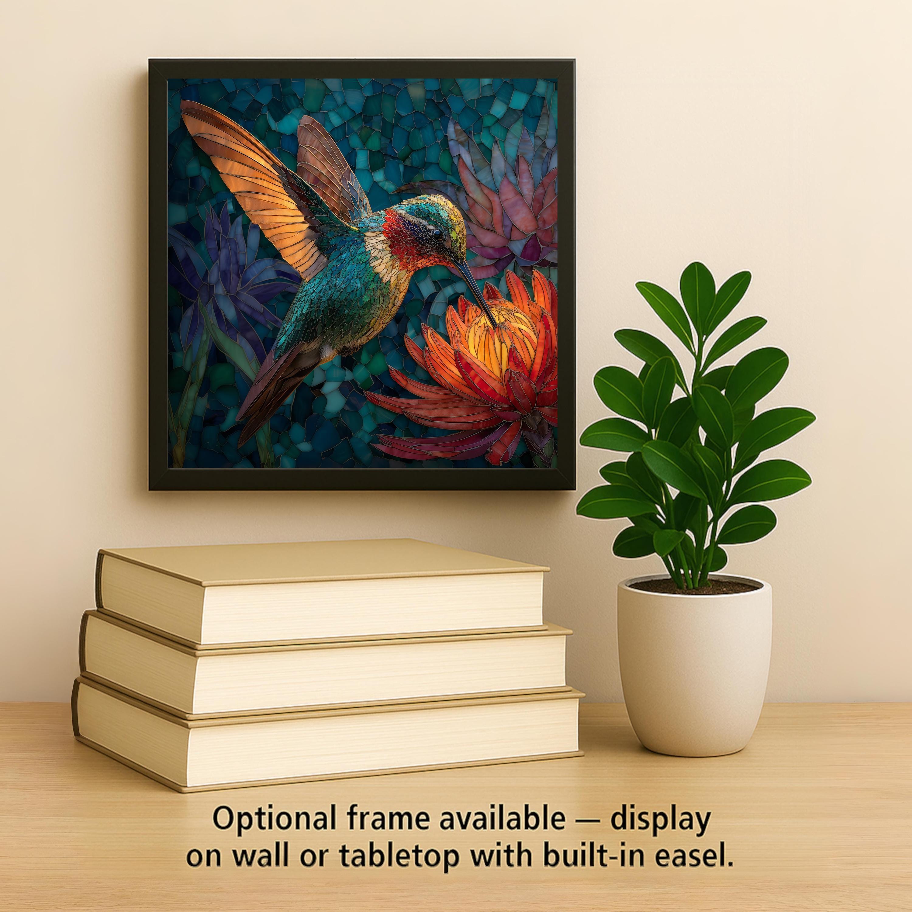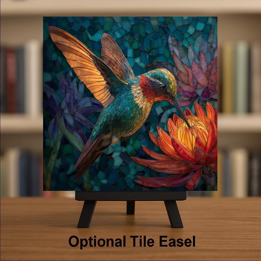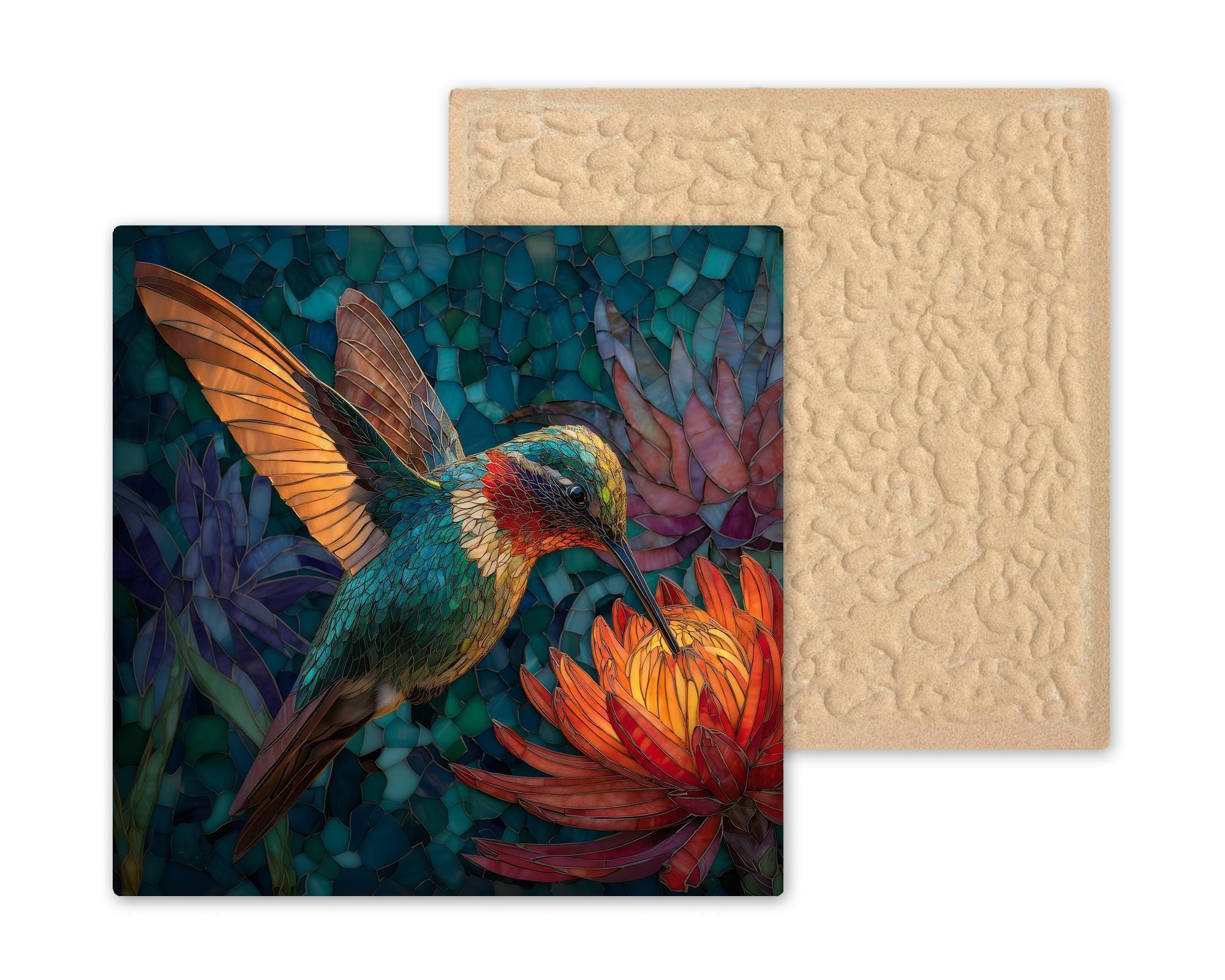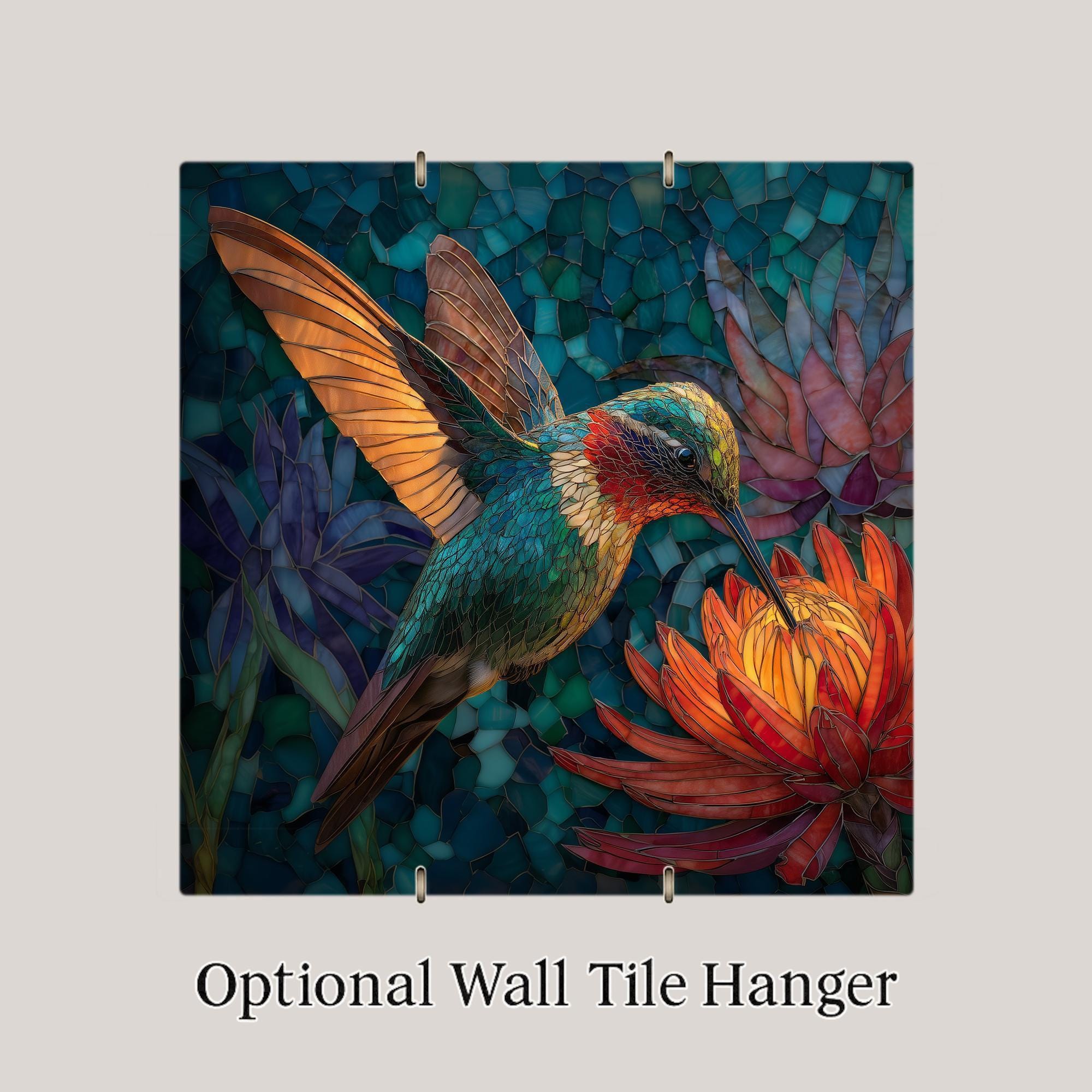 Celebrate the elegance and energy of nature with this Stained Glass Style Hummingbird Ceramic Tile Art. A radiant hummingbird hovers over a glowing orange flower, rendered in rich jewel tones that shift beautifully with the light. Created with precision and care, the image is permanently infused into ceramic using sublimation printing, ensuring long-lasting brilliance and detail.