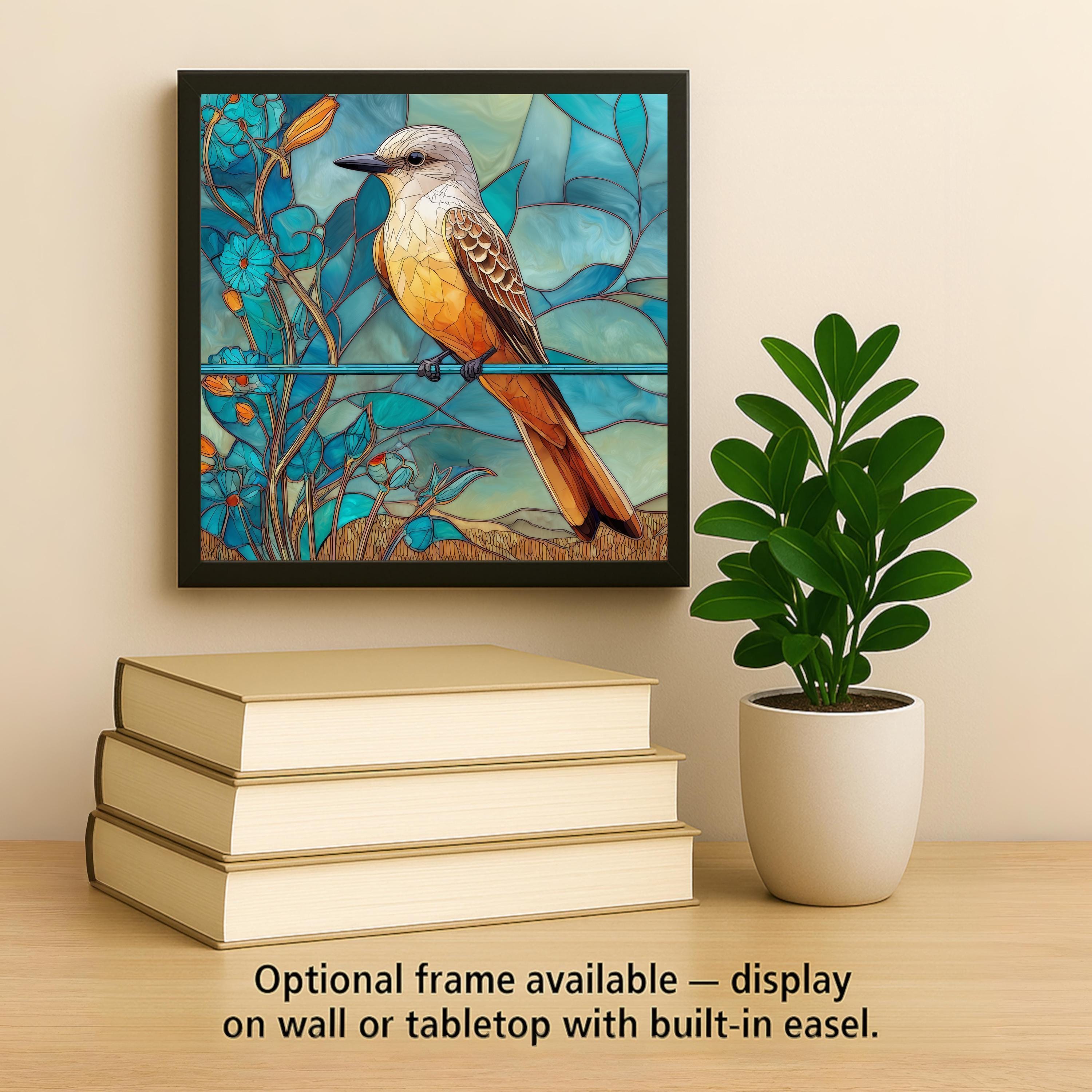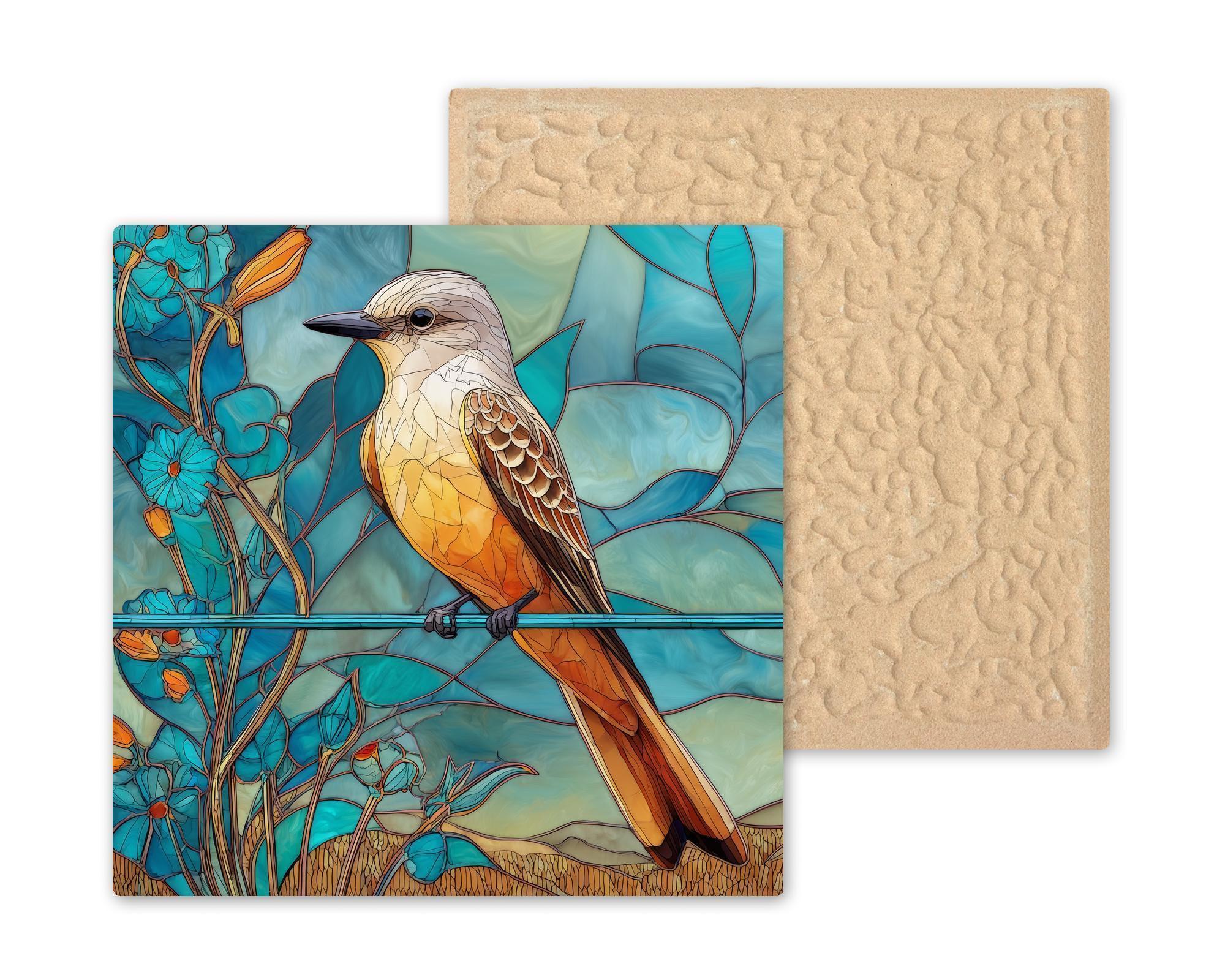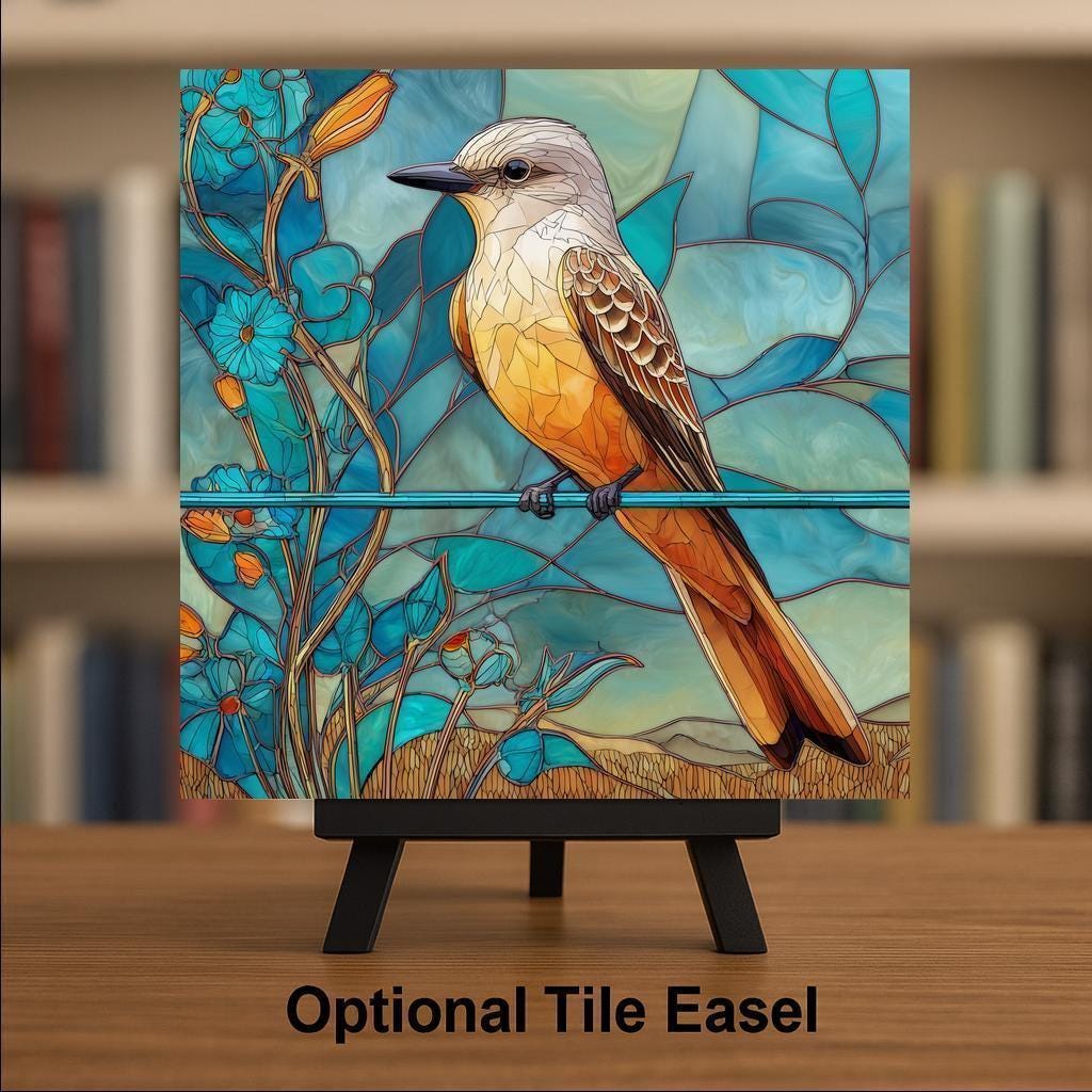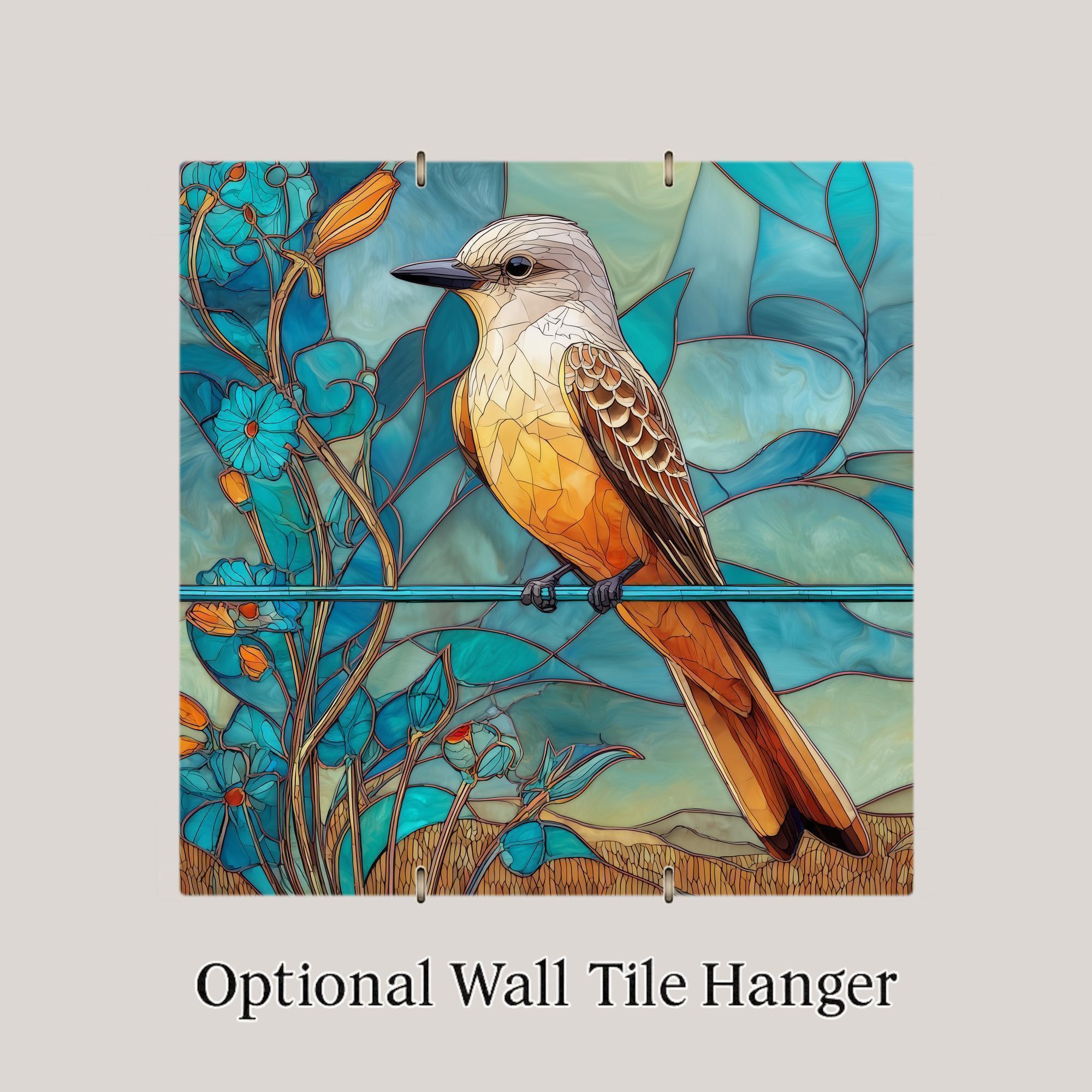 Bring the beauty of the skies indoors with this Scissor-tailed Flycatcher (Swallowtail Flycatcher) Ceramic Tile Wall Art. Known for its long, elegant tail and radiant plumage, this bird symbolizes freedom and grace. The glowing sunset hues and stained-glass look make this artwork a captivating focal point for any room.