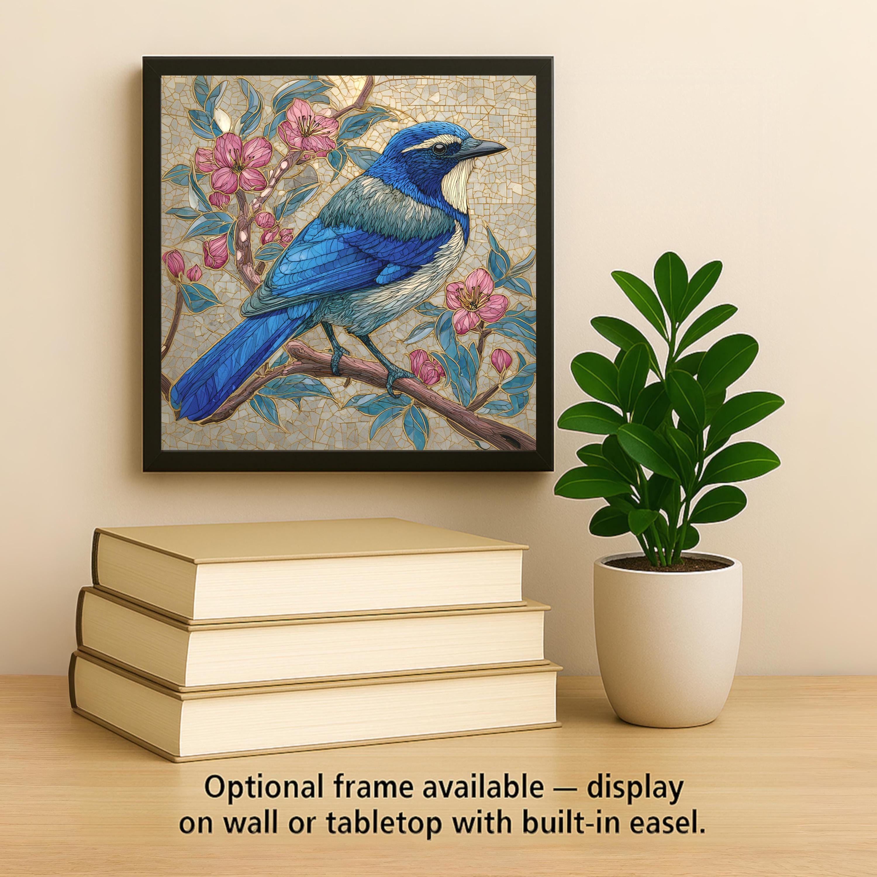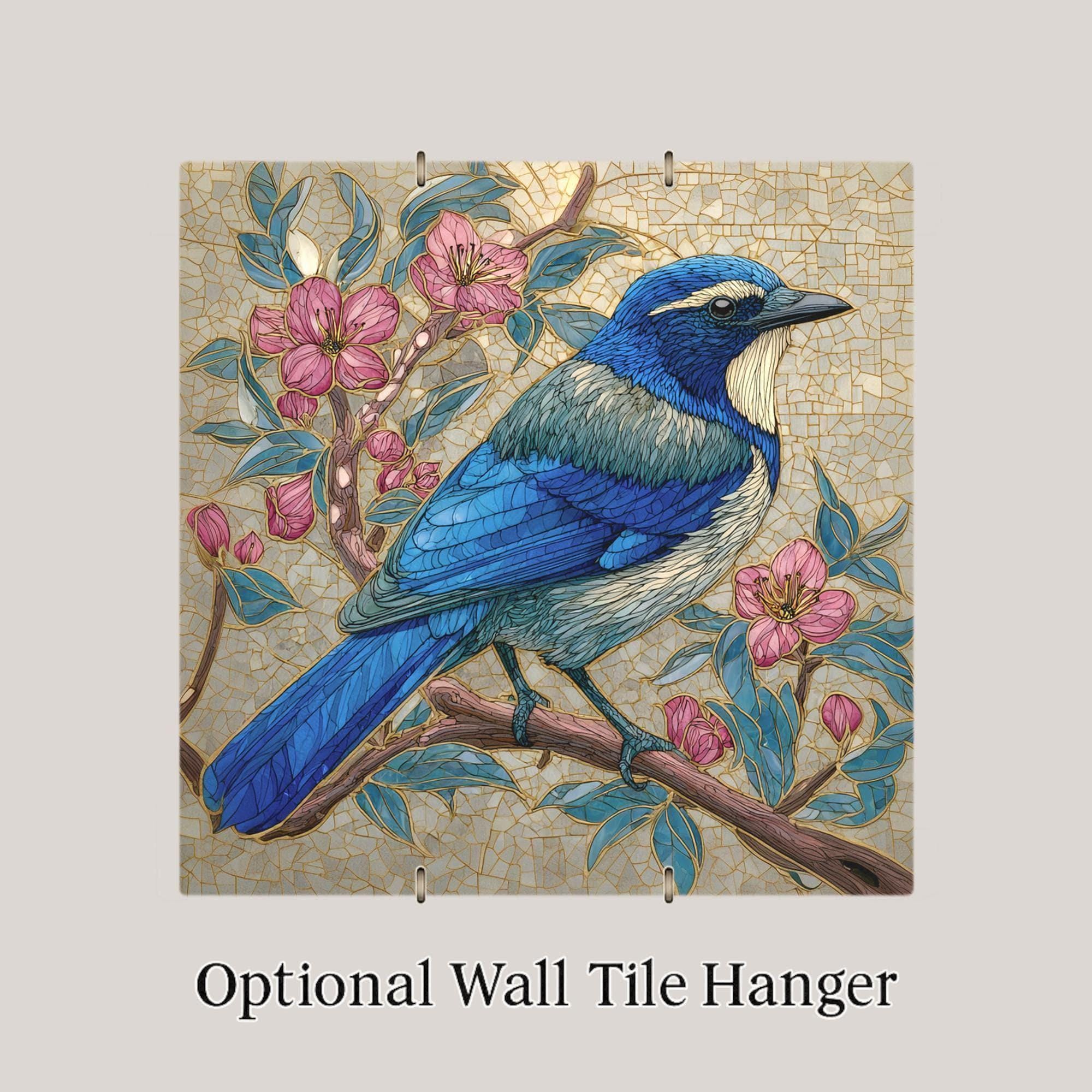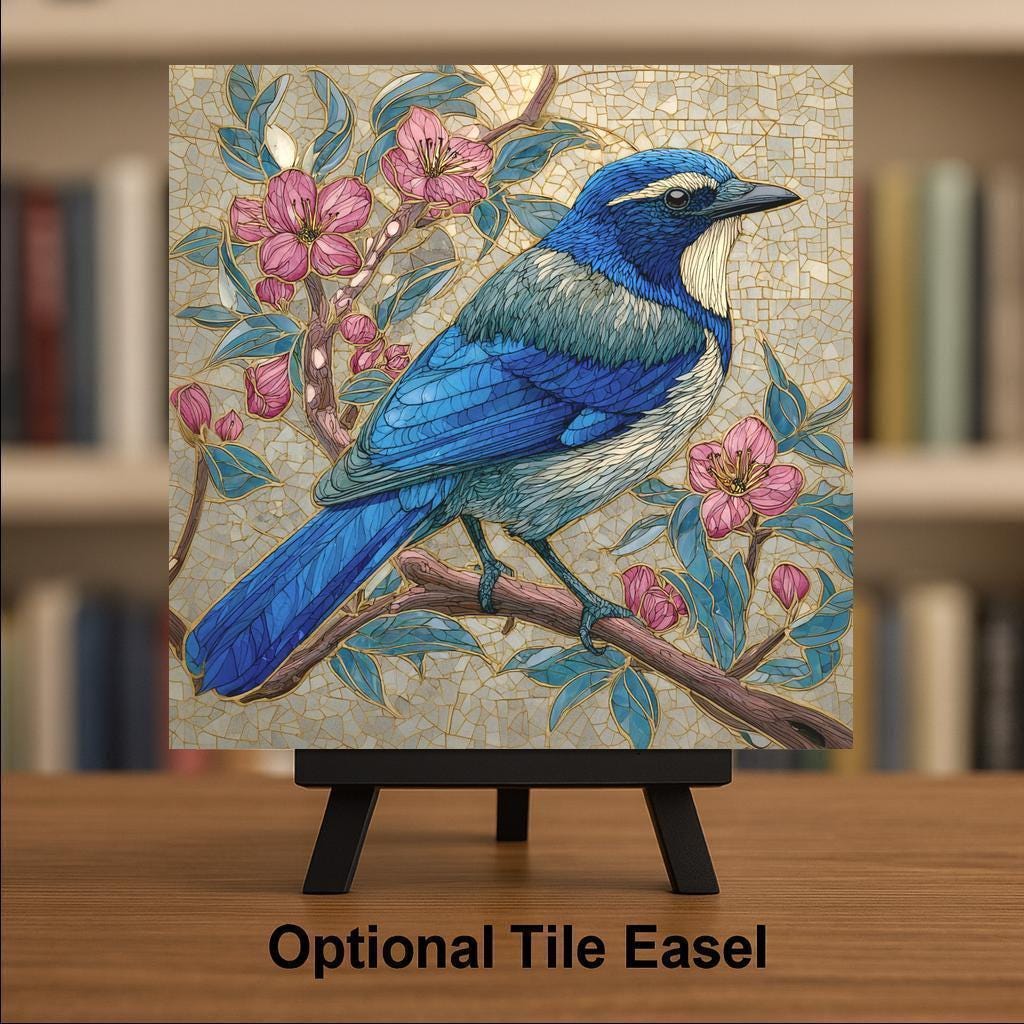 Bright, detailed, and elegant, this Stained Glass Style California Scrub Jay Tile Art brings the peaceful energy of nature indoors. The bluebird rests gracefully on a flowering branch, surrounded by rosy pink blooms and golden light. The harmonious mix of teal, indigo, and blush tones makes it a perfect statement piece for your wall art, wall decor, or tabletop display.