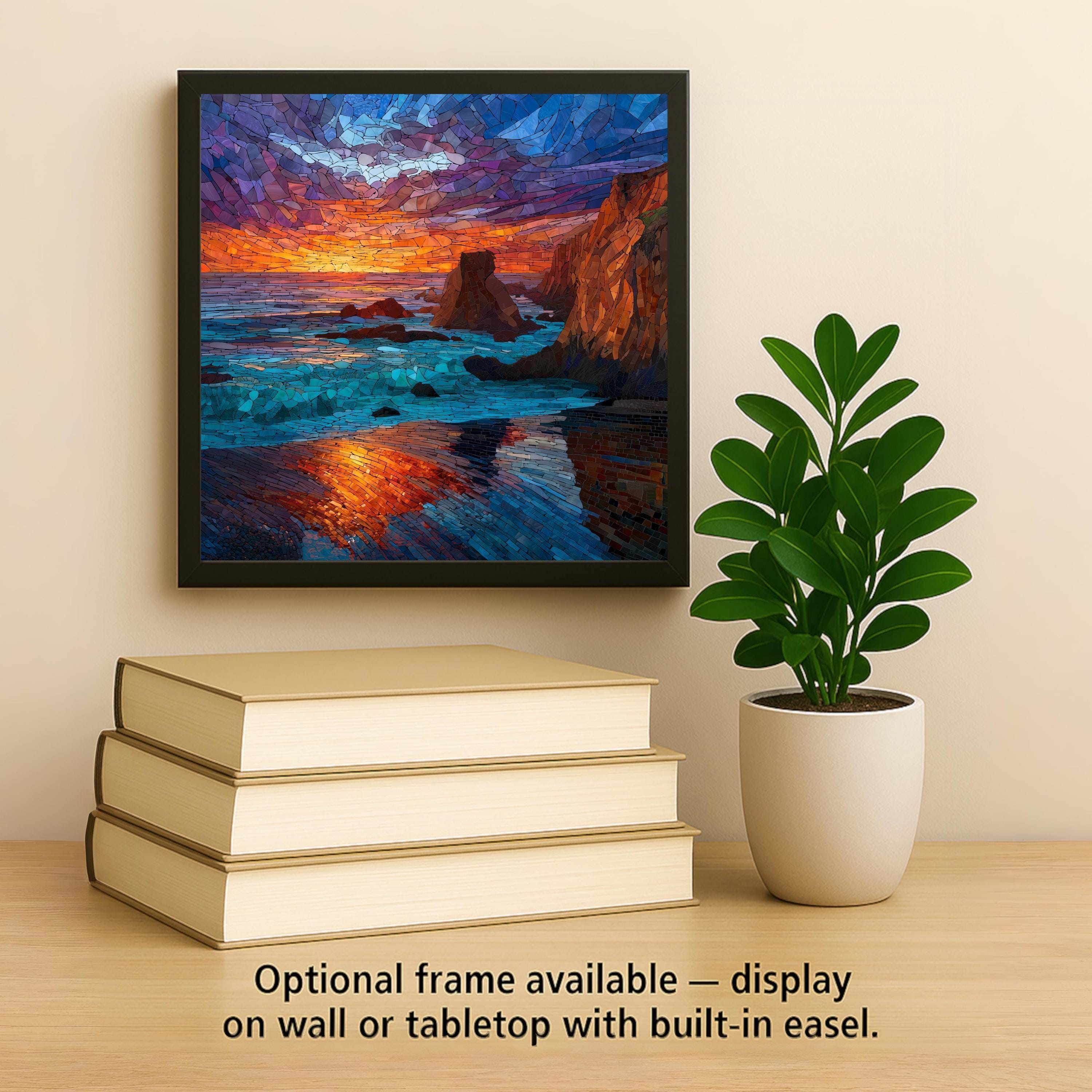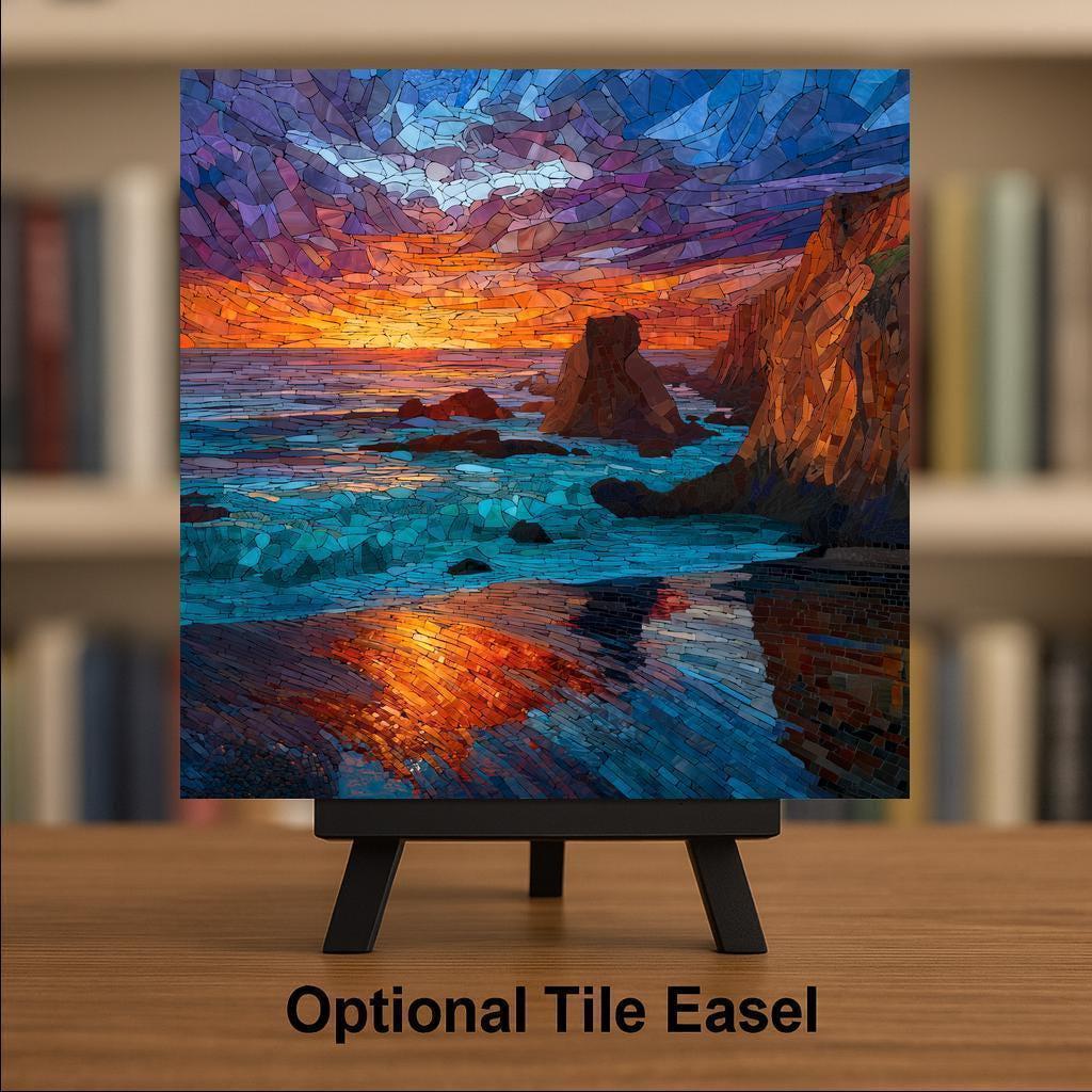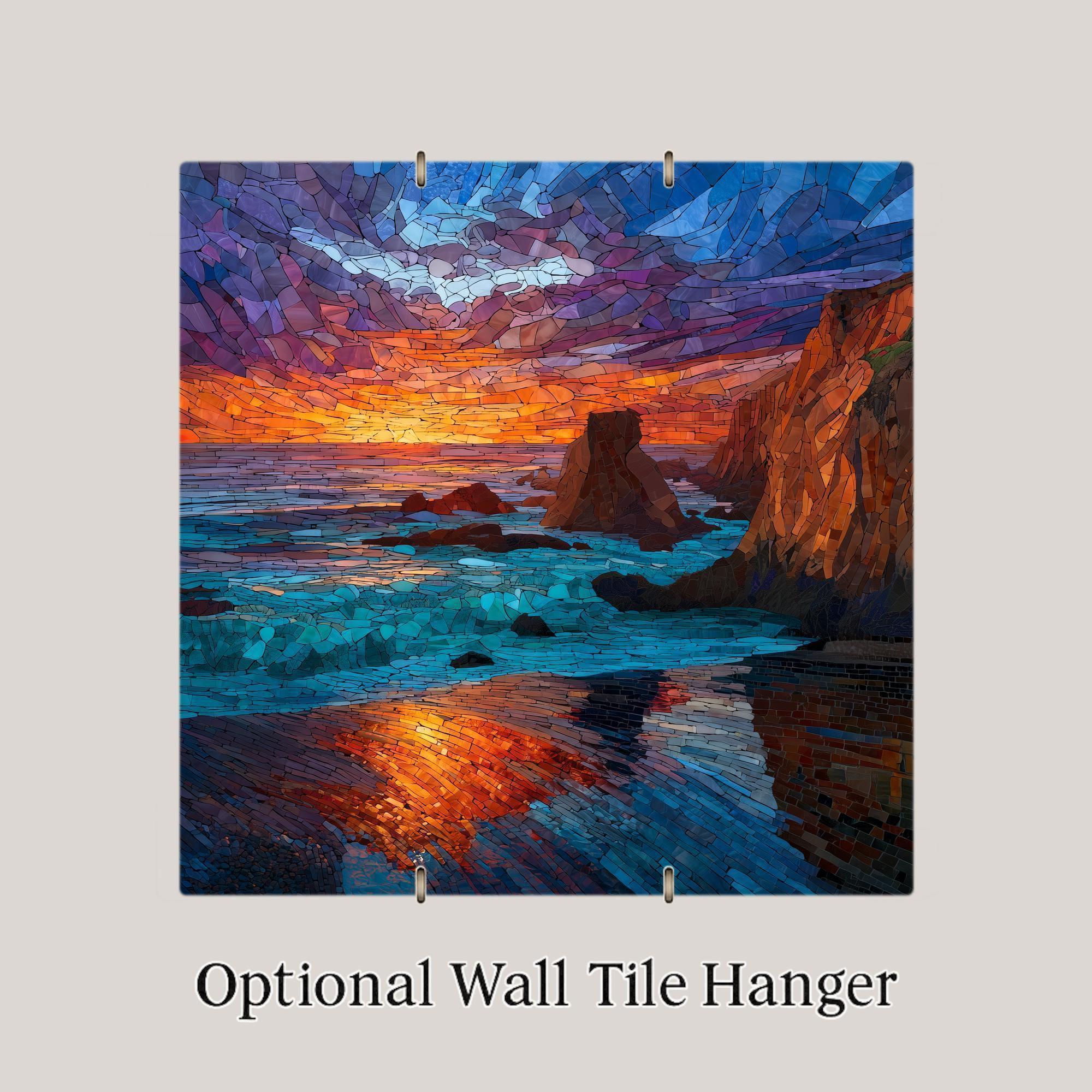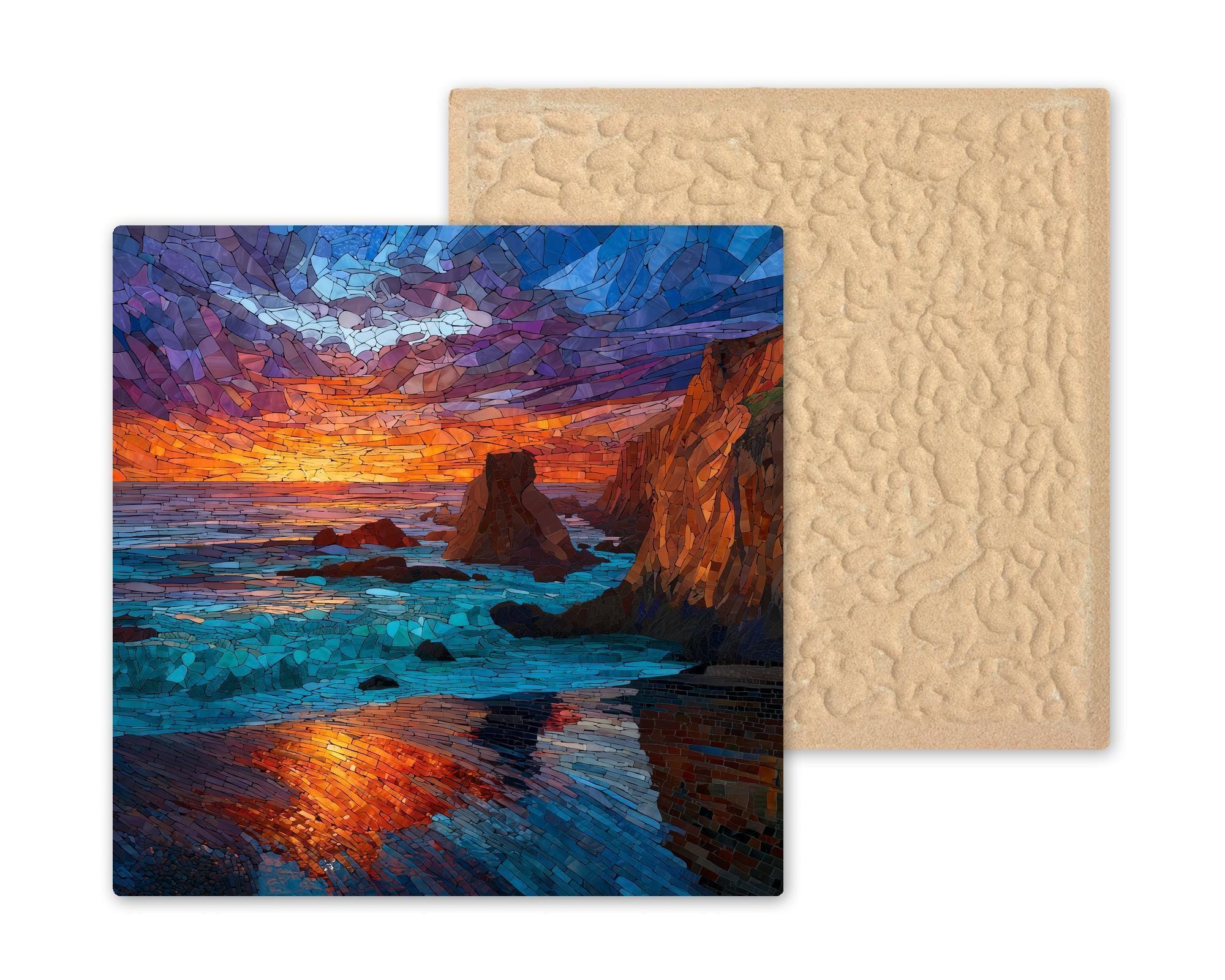 Bring the dramatic beauty of California’s Big Sur coast into your home with this luminous stained glass-style ceramic tile. Inspired by the cliffs and surf at sunset, this piece blends ocean blues, fiery oranges, and violet skies into a glowing mosaic that catches light beautifully. The intricate design feels handcrafted, yet the durable sublimation process ensures lasting color and fine detail for years to come.