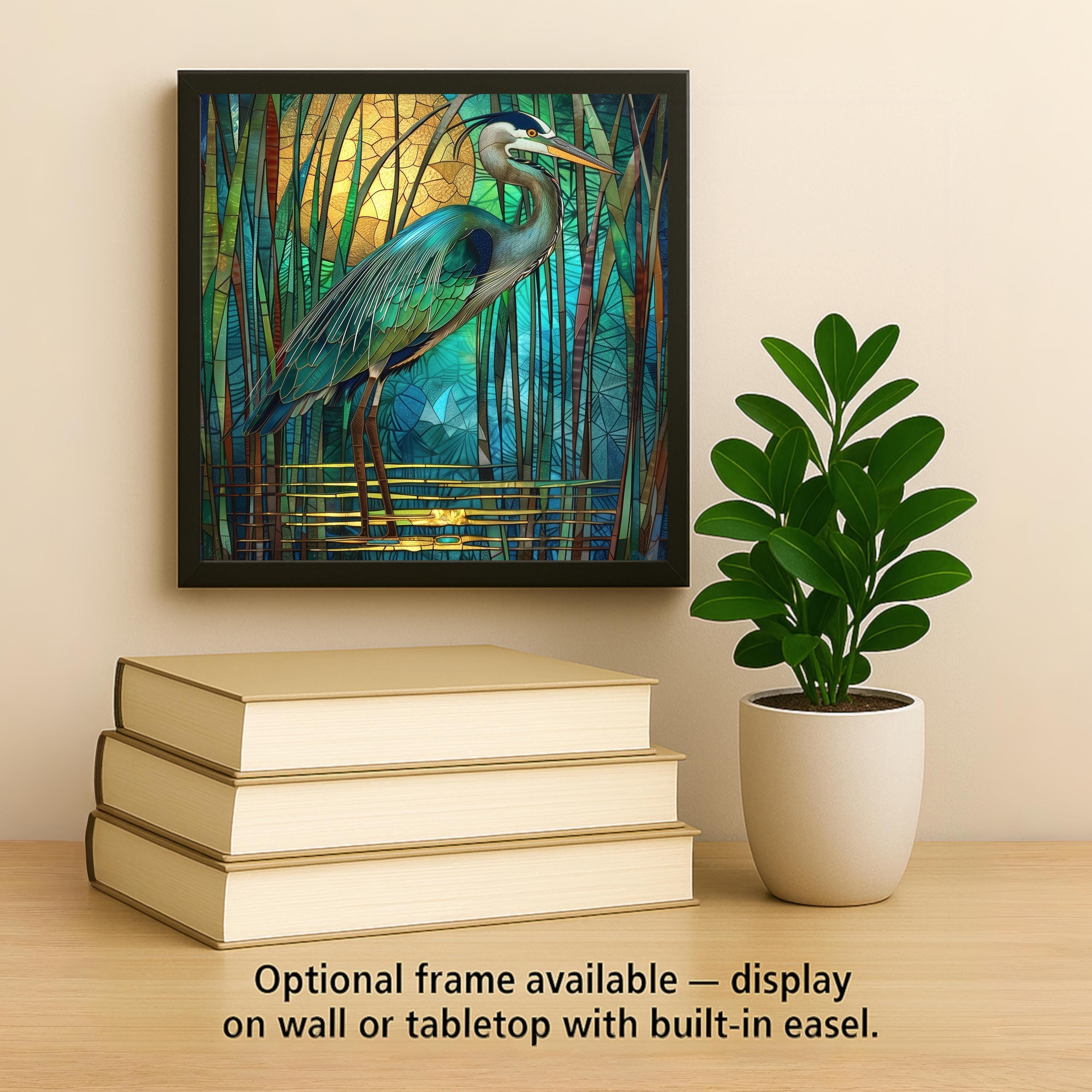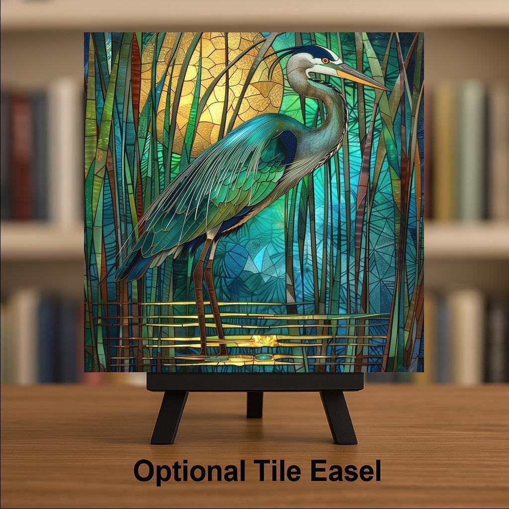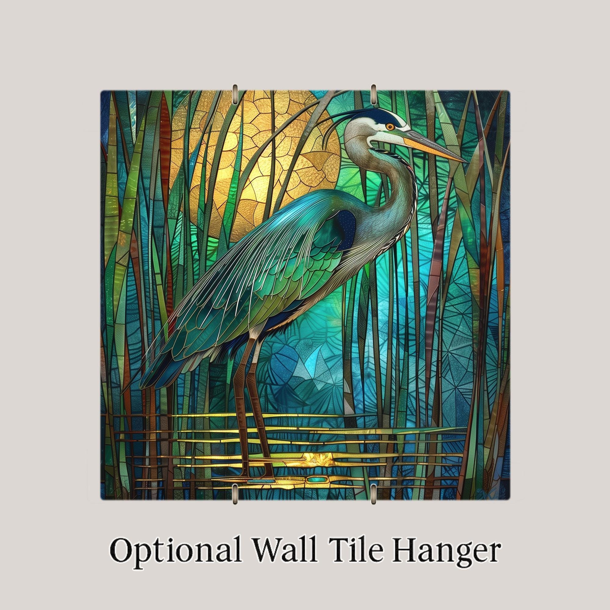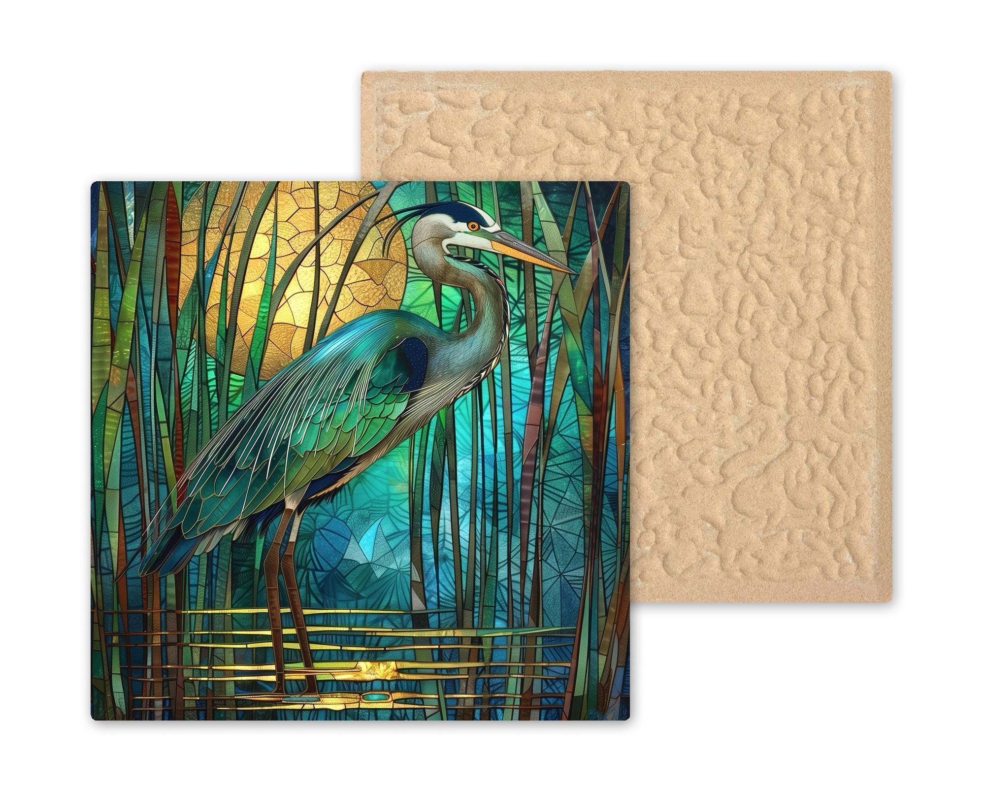 Capture the tranquil beauty of the marshlands with this Great Blue Heron Stained Glass-Style Ceramic Tile. This luminous artwork depicts a heron wading through reeds at sunset, glowing in jewel tones of turquoise, gold, and emerald. Every detail evokes the calm of the water and the artistry of traditional mosaic glass.