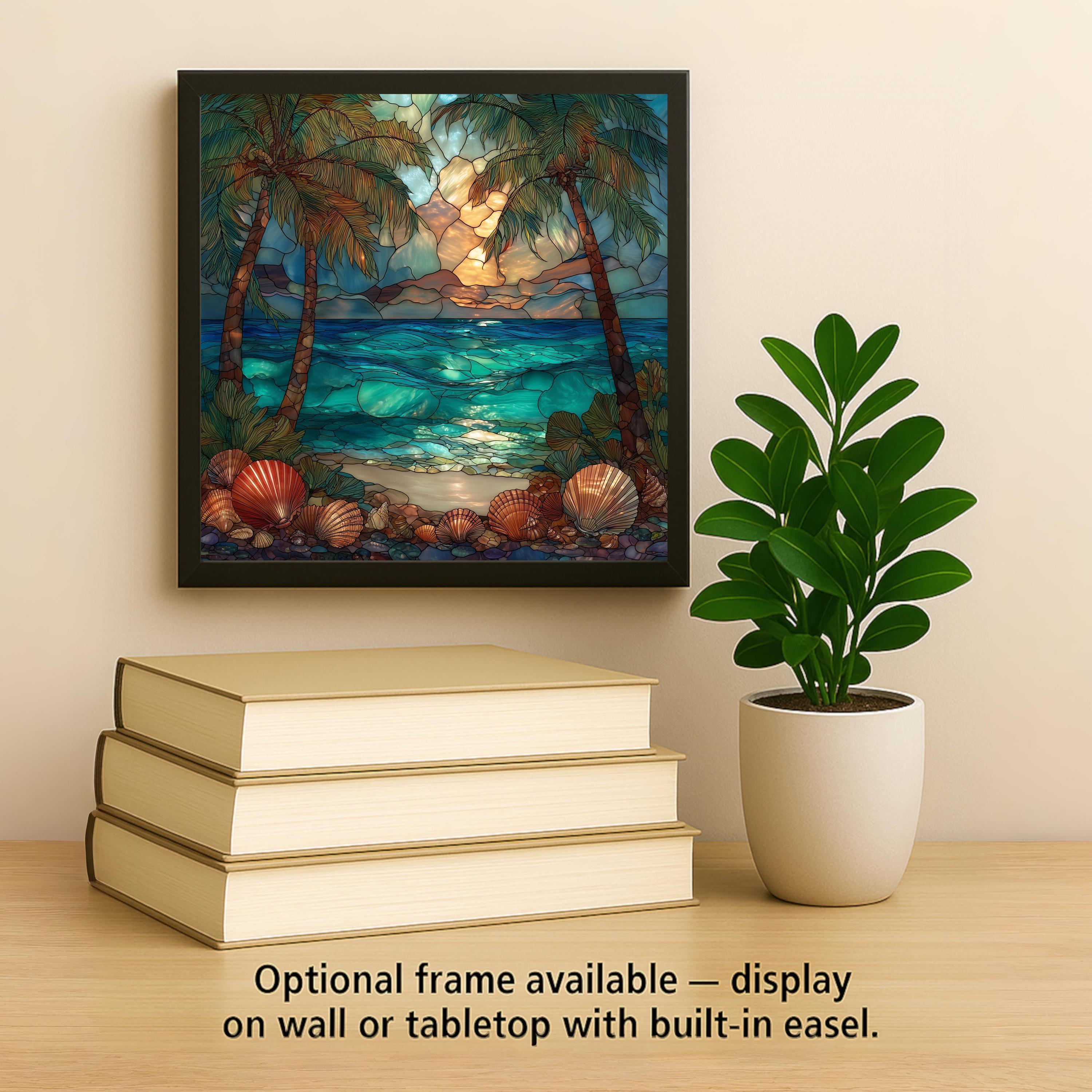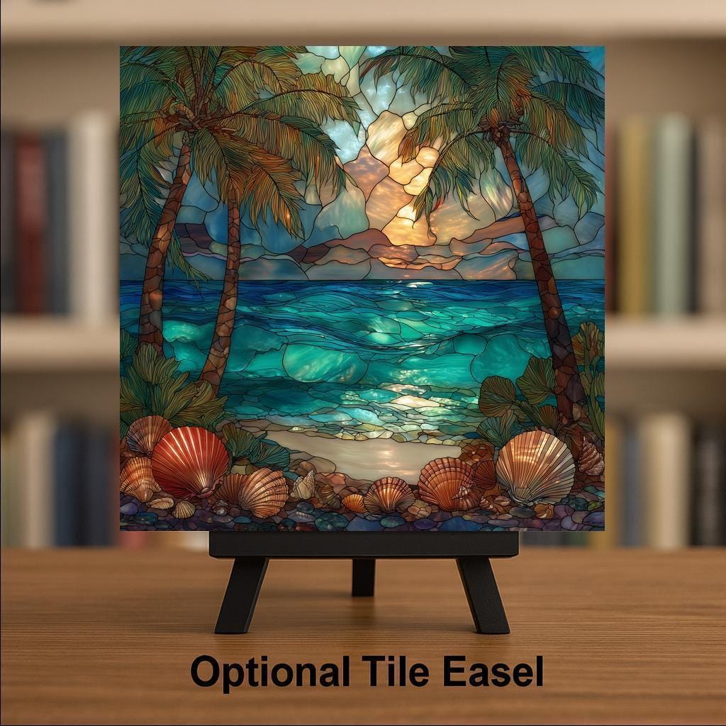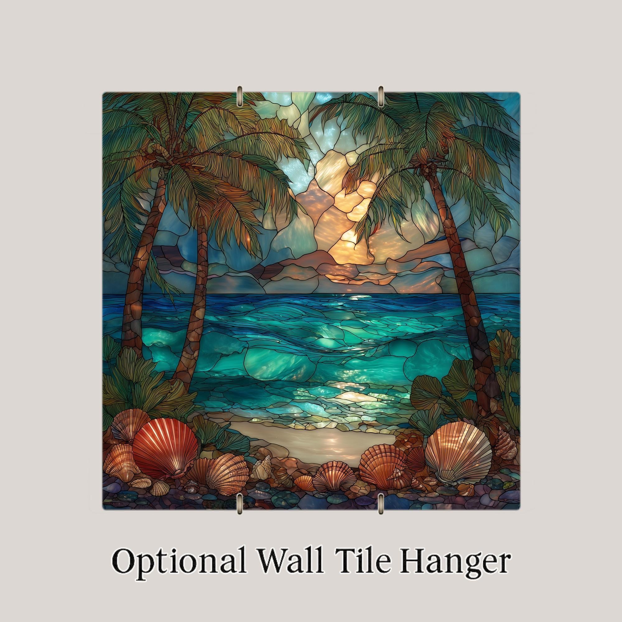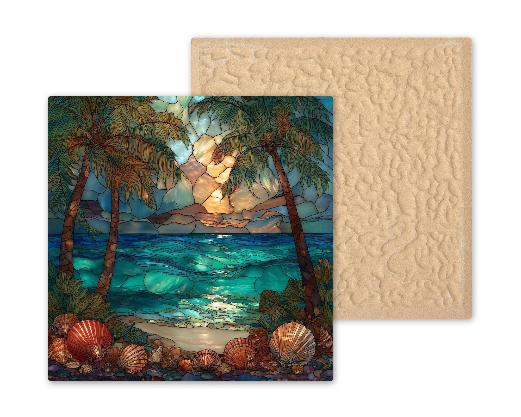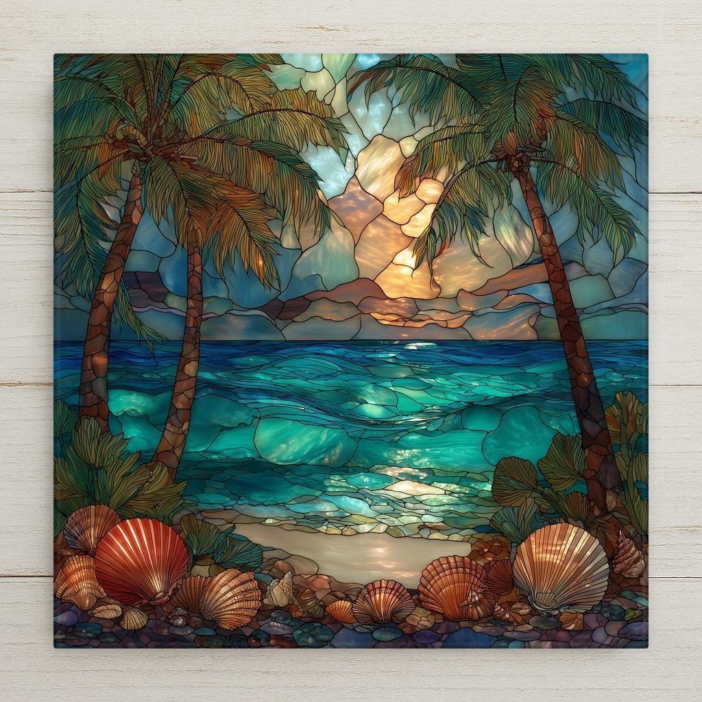 Capture the feeling of a Florida sunrise with this Stained Glass Style Beach Ceramic Tile, featuring swaying palm trees, glowing seashells, and turquoise waves illuminated by warm sunlight. This stunning coastal wall art transforms your space into a seaside retreat, bringing the vibrant colors of the ocean and sky indoors.