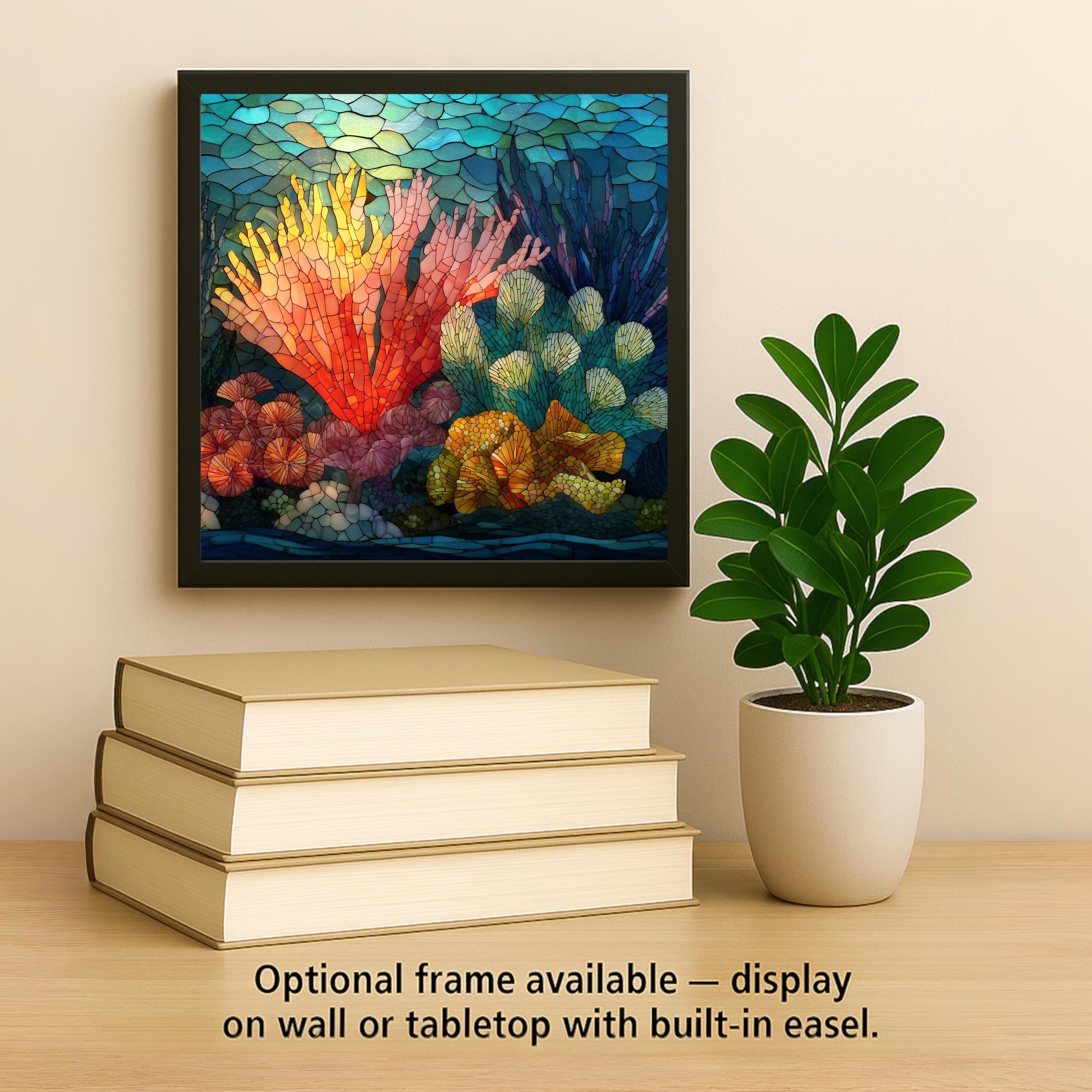 Transform your décor with the luminous beauty of this stained glass-style Coral Reef Ceramic Tile. Inspired by vibrant underwater coral gardens, this handcrafted design blends jewel-toned blues, teals, and golds to reflect the captivating motion of ocean waves and the natural splendor of marine life.