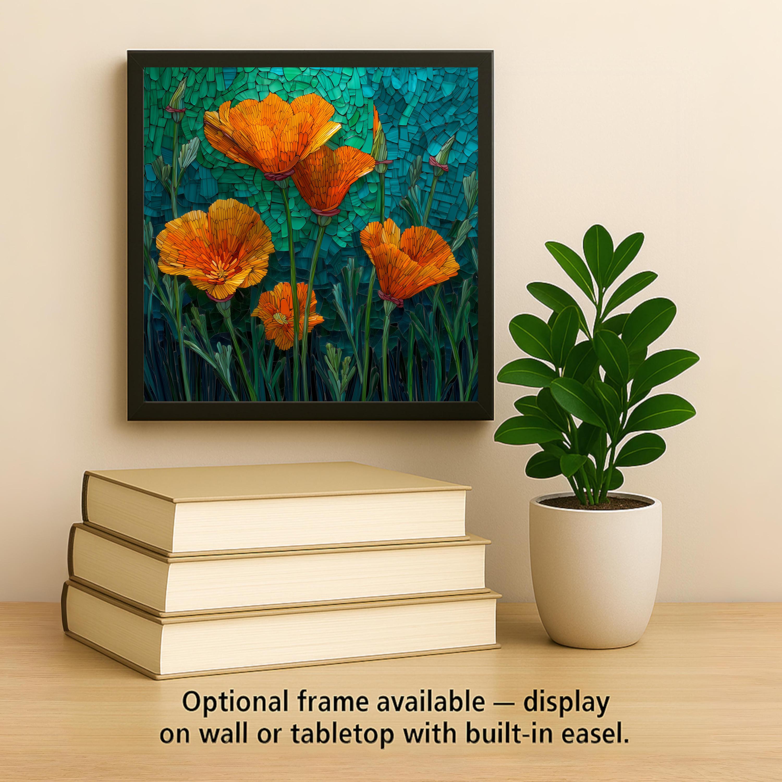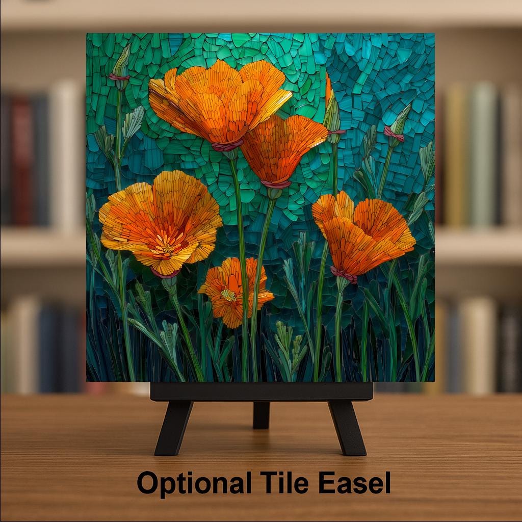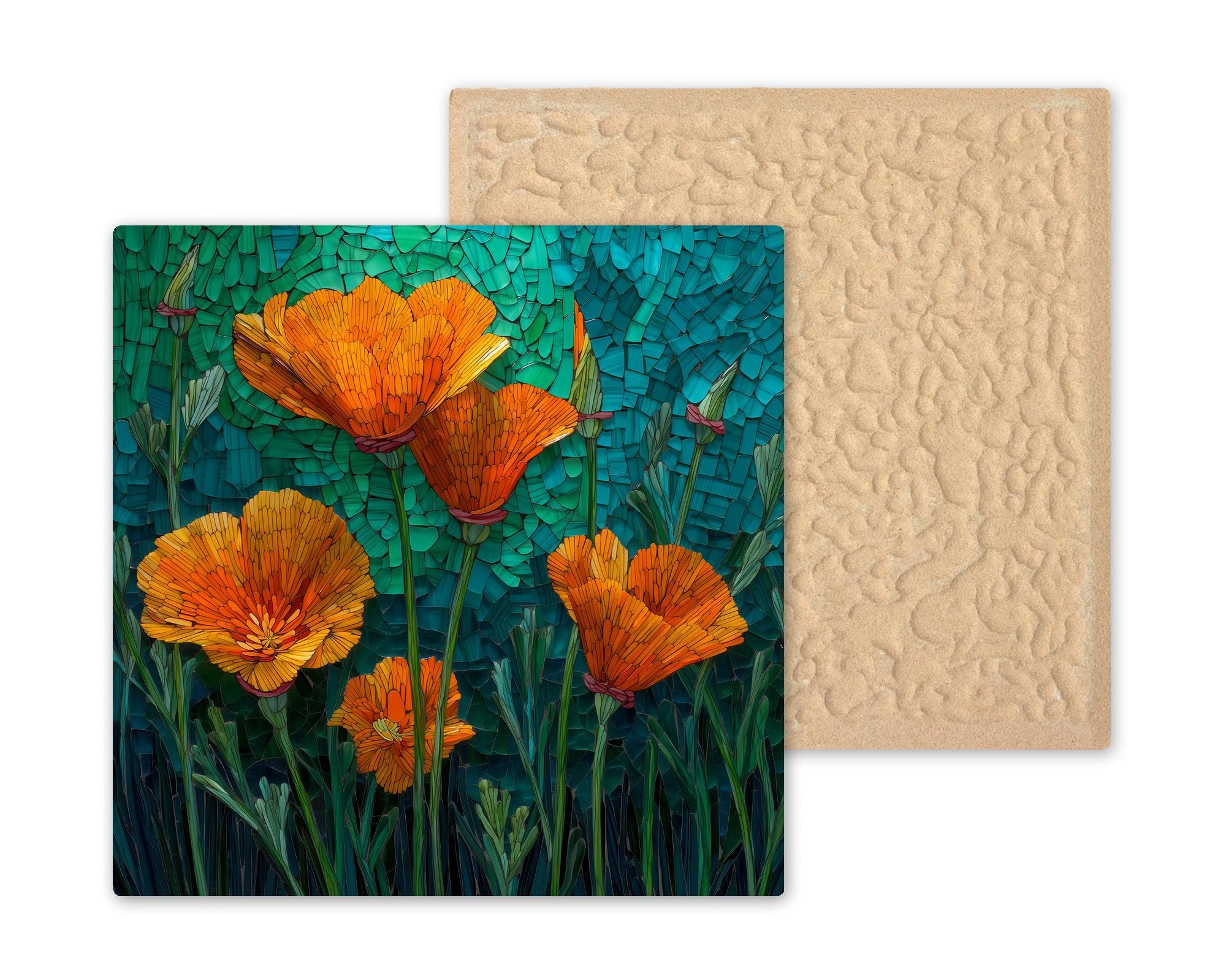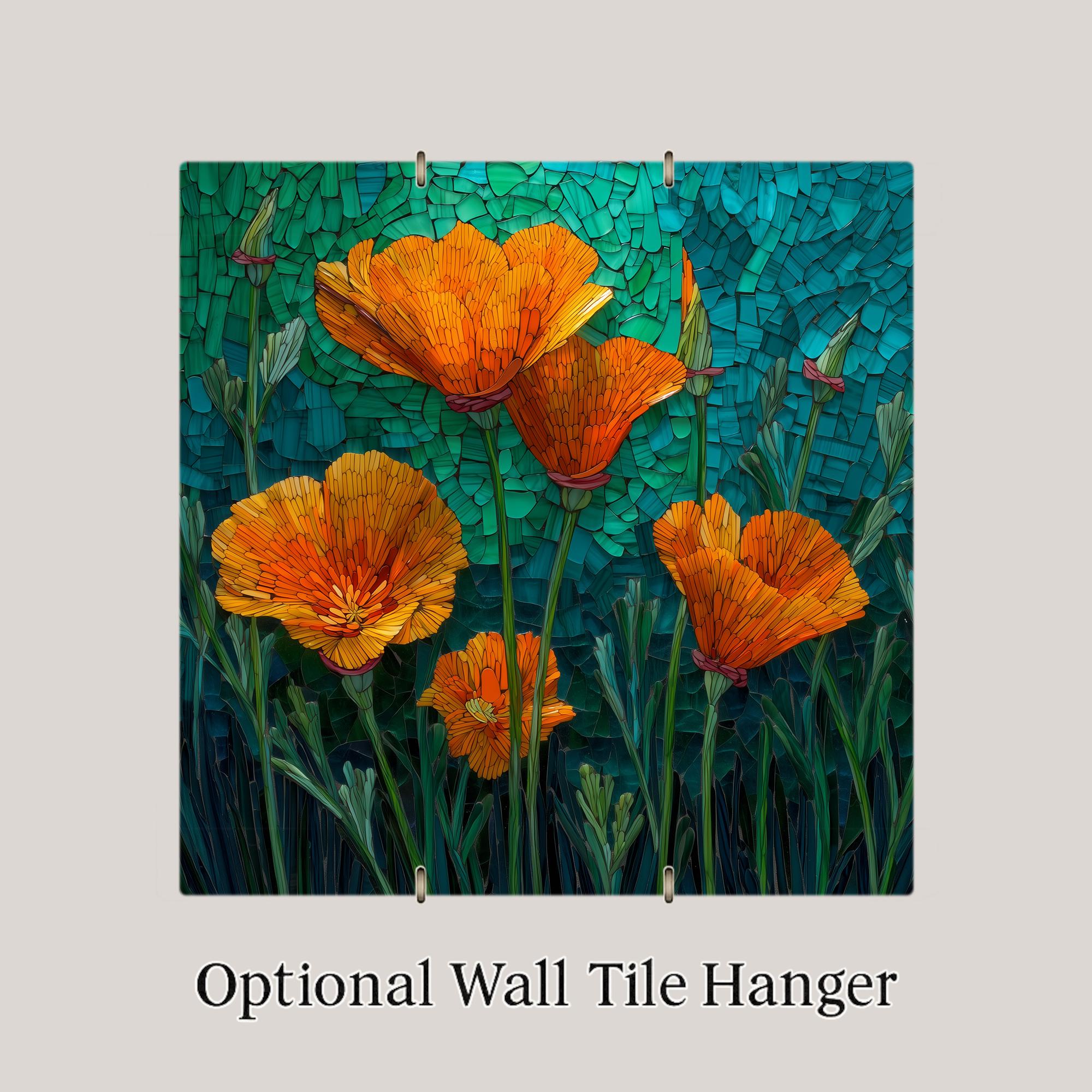 Bring the sunshine indoors with this Stained Glass Style California Poppy Ceramic Tile, featuring vivid orange blossoms set against a rich teal-green background. Each petal is illuminated with glowing highlights that mimic the beauty of real stained glass, offering an elegant and uplifting accent for any space.