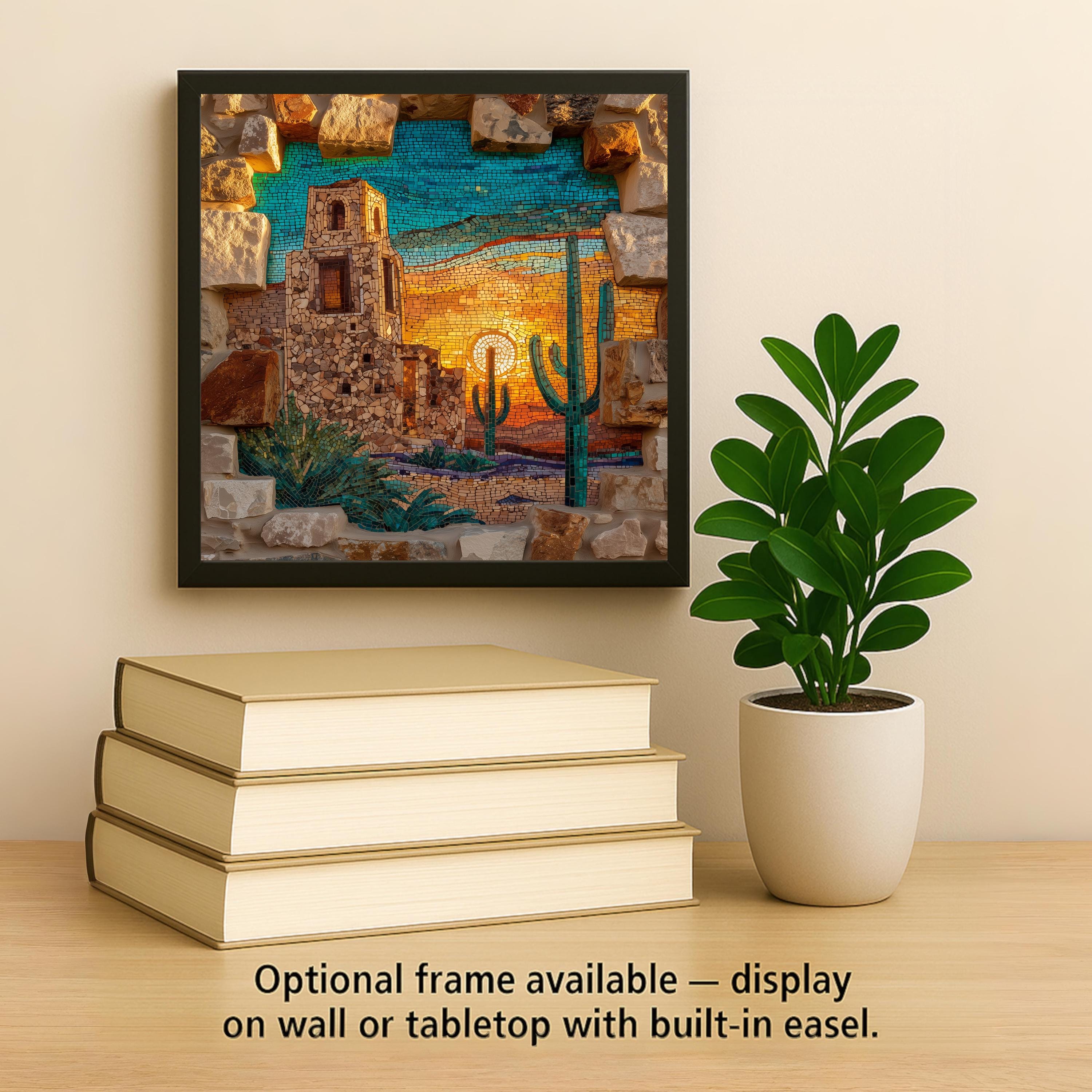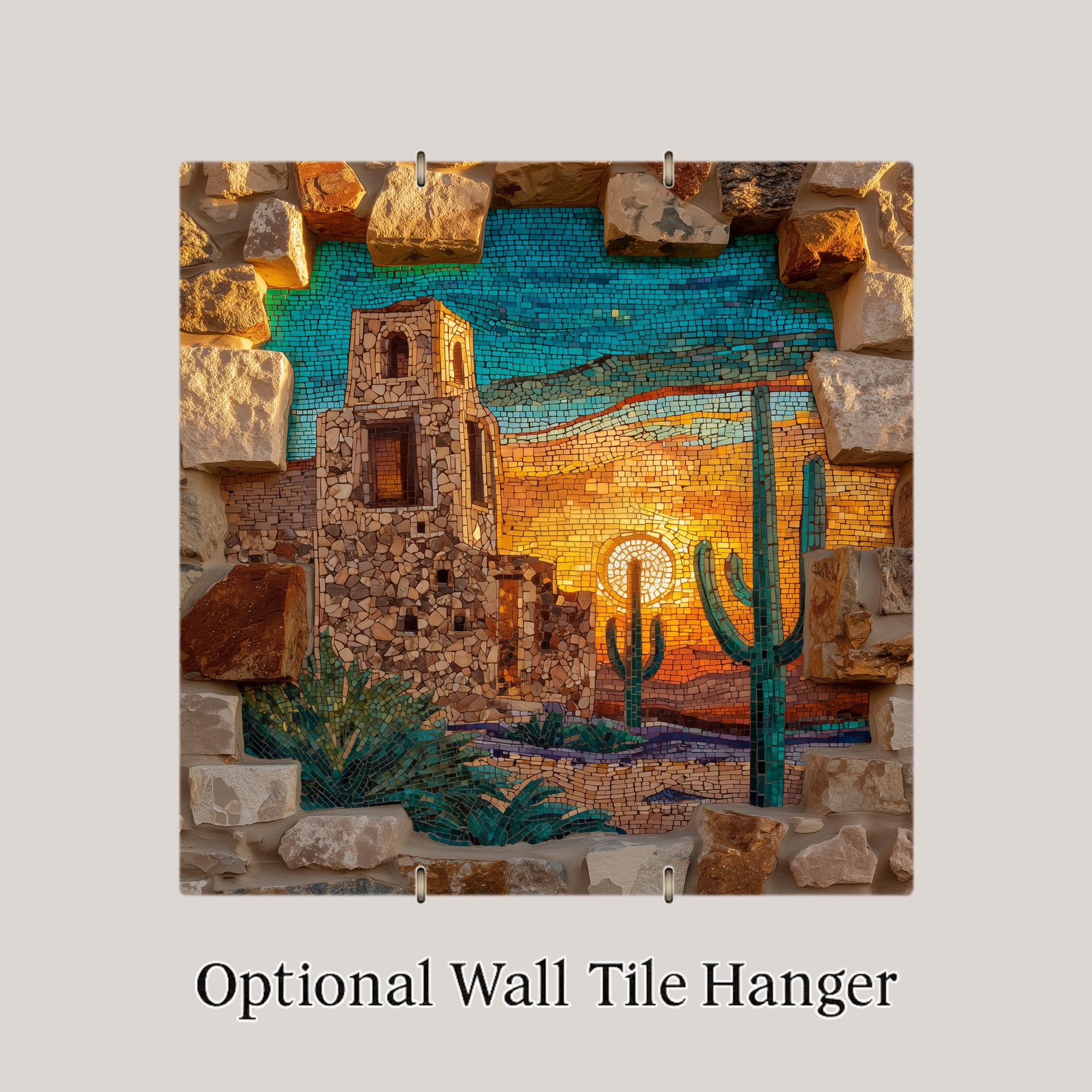 Experience the allure of the American Southwest with this Stained Glass Style Texas Mission Ceramic Tile Art. This vibrant piece captures a rustic stone mission framed by desert cacti and a glowing sunset sky, rendered in rich mosaic-like detail. Shades of gold, teal, and sandstone combine to create a scene that feels both historic and timeless.