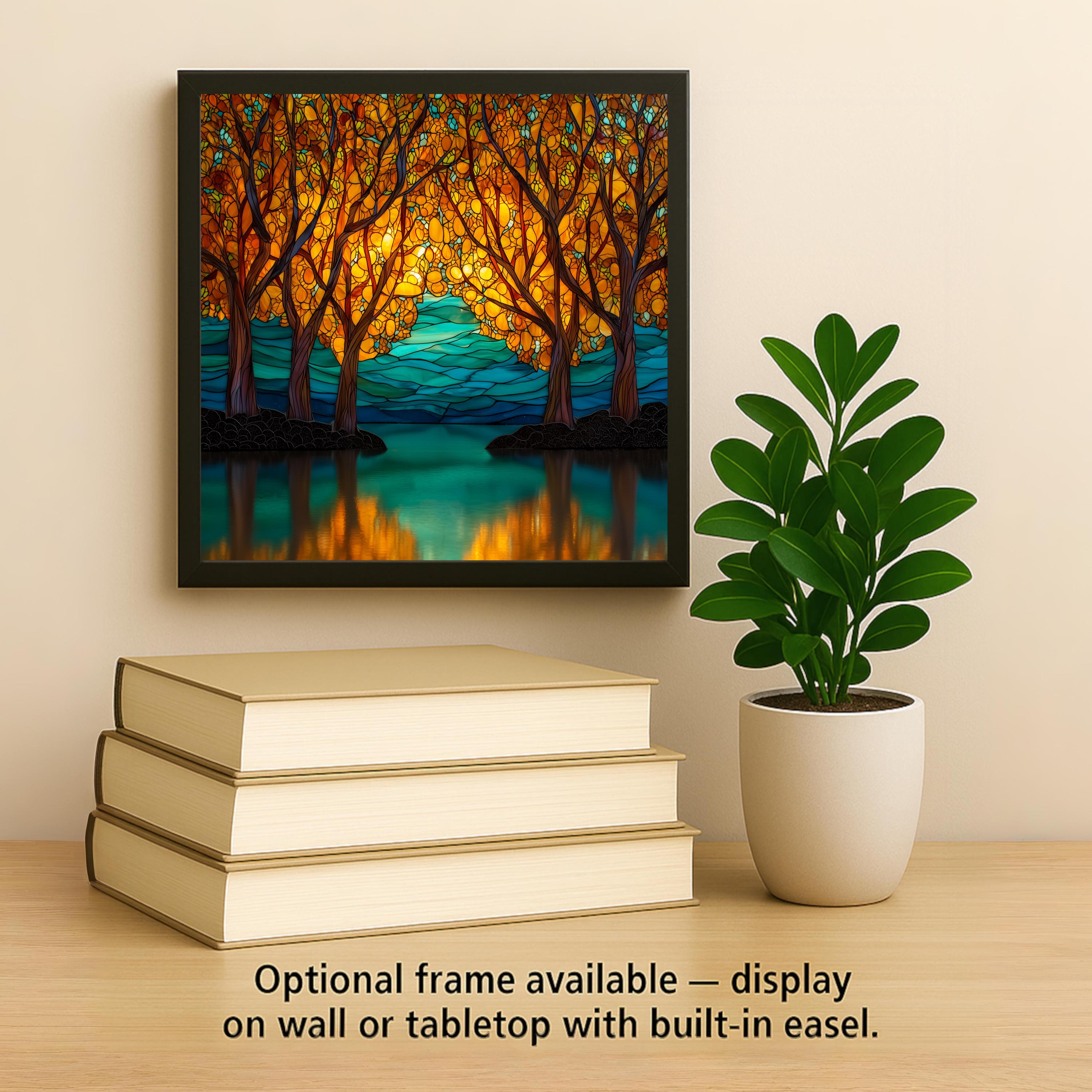 Experience the serene beauty of autumn with this stained-glass-style Central Park ceramic tile artwork. The design captures a breathtaking forest of amber and gold trees reflected in teal-blue waters, blending natural elegance with timeless craftsmanship. Perfect for adding warmth and sophistication to your wall decor, this piece brings a peaceful glow to any home decor style.