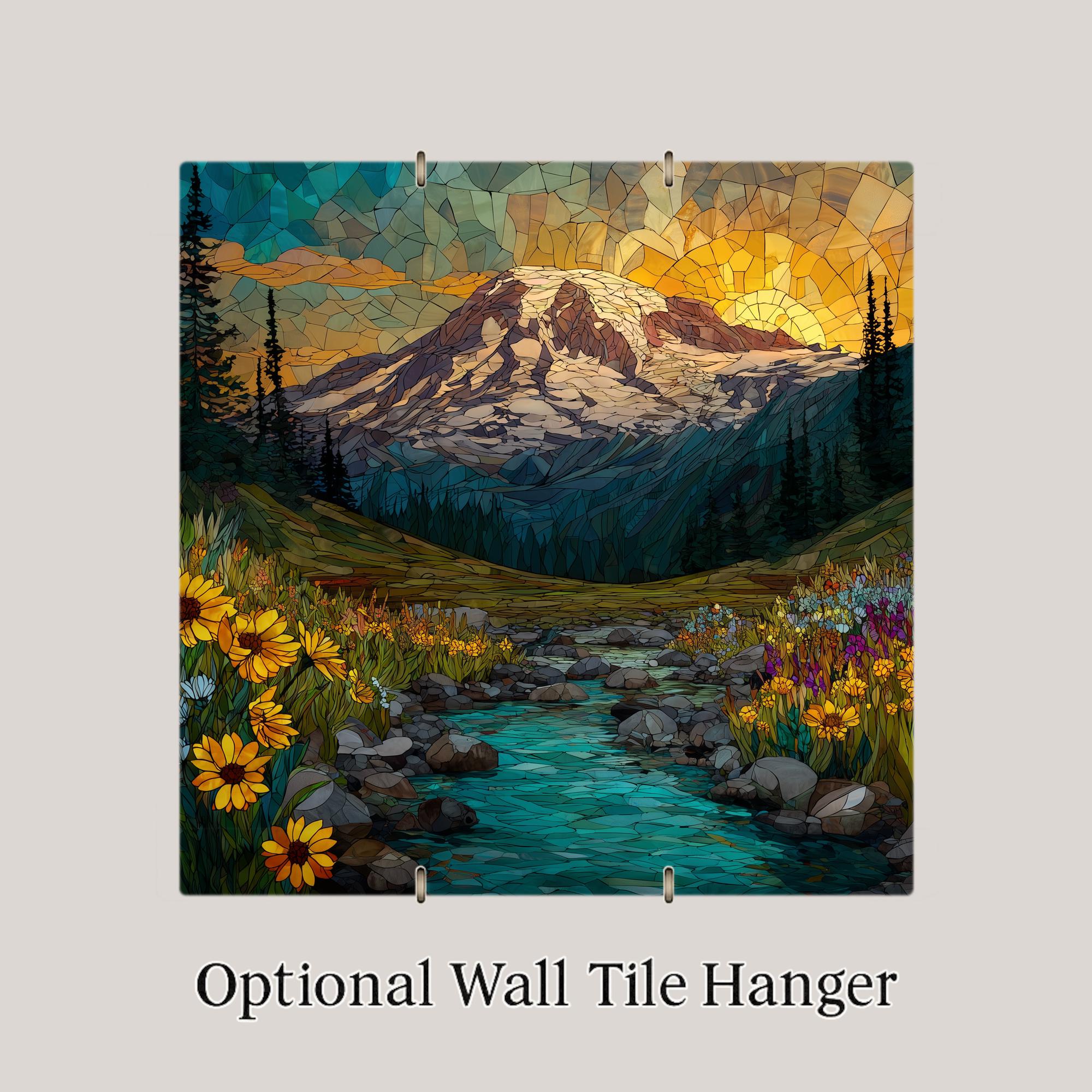 Celebrate the spirit of adventure and artistry with this Mount Rainier stained glass-style ceramic tile wall art. The mountain glows beneath a golden sky, surrounded by wildflowers and a tranquil turquoise stream. Each tile is produced using a premium printing process that ensures crisp detail, jewel-tone color, and lasting beauty.