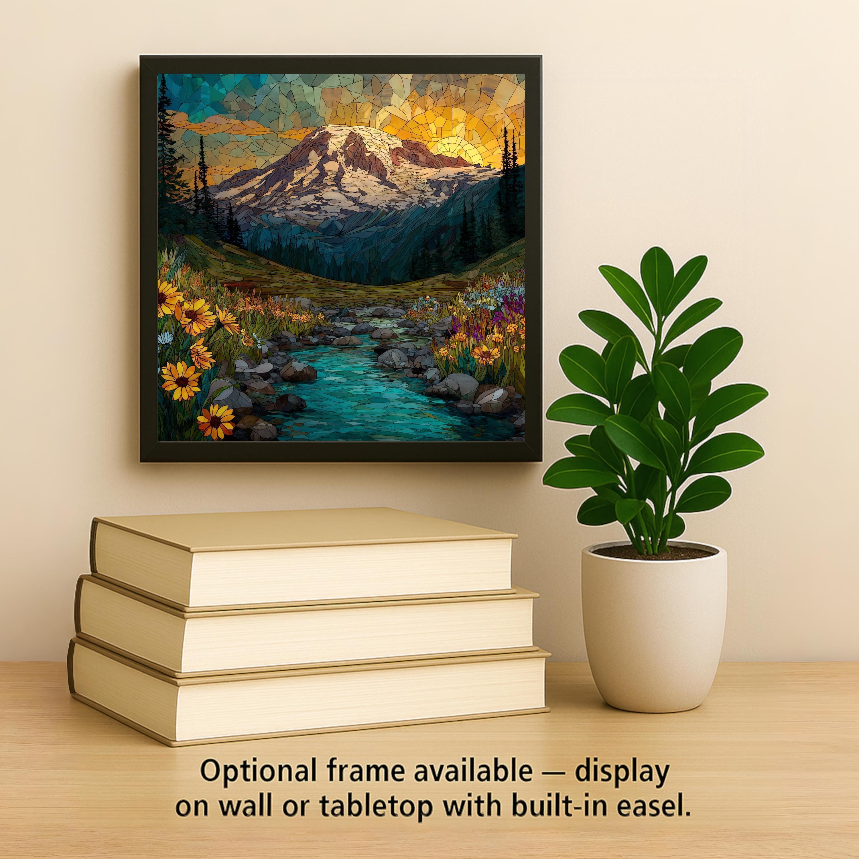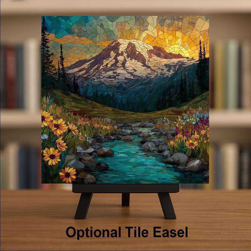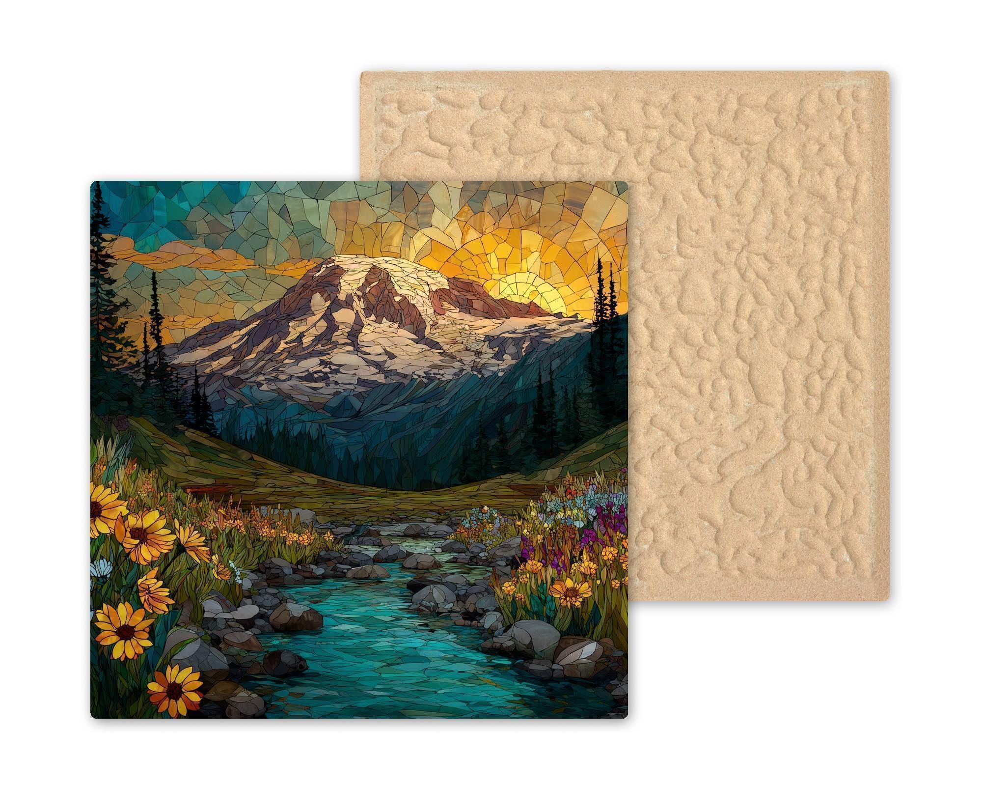 Celebrate the spirit of adventure and artistry with this Mount Rainier stained glass-style ceramic tile wall art. The mountain glows beneath a golden sky, surrounded by wildflowers and a tranquil turquoise stream. Each tile is produced using a premium printing process that ensures crisp detail, jewel-tone color, and lasting beauty.