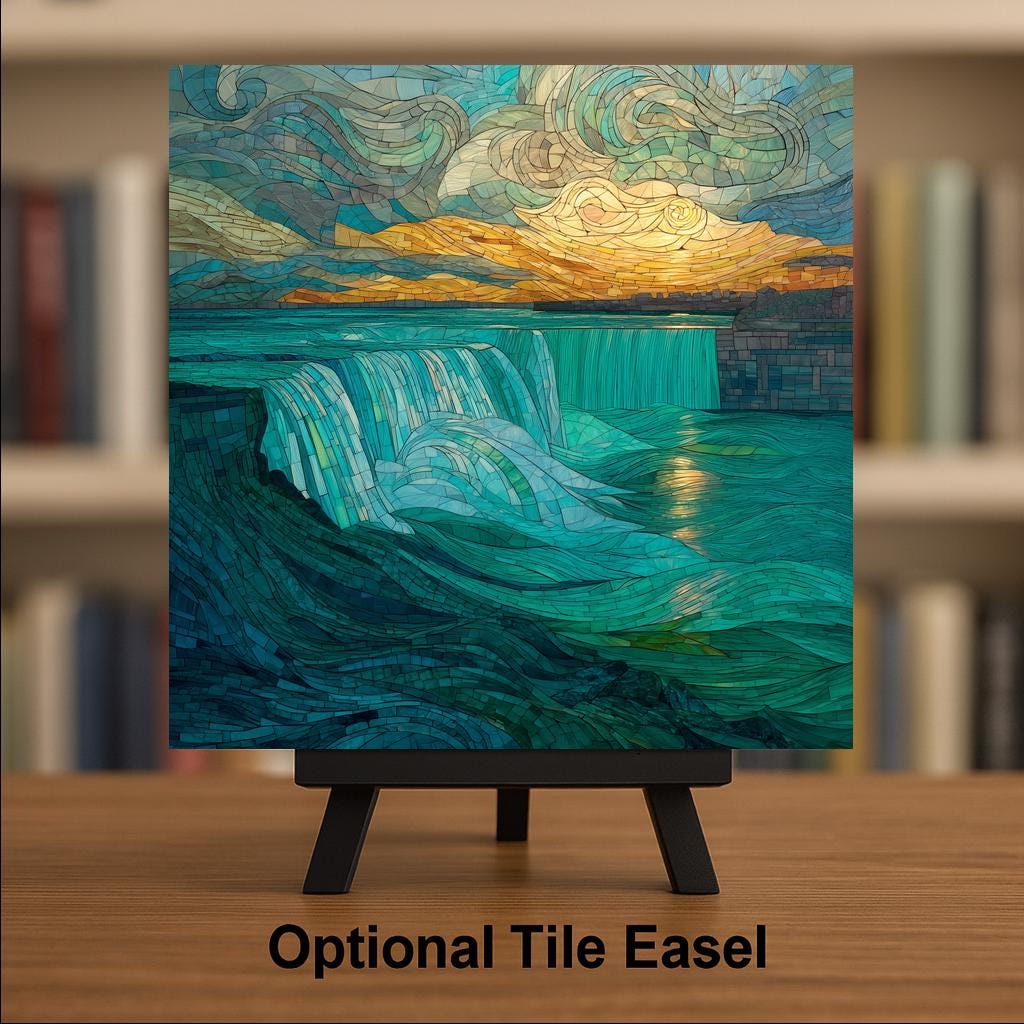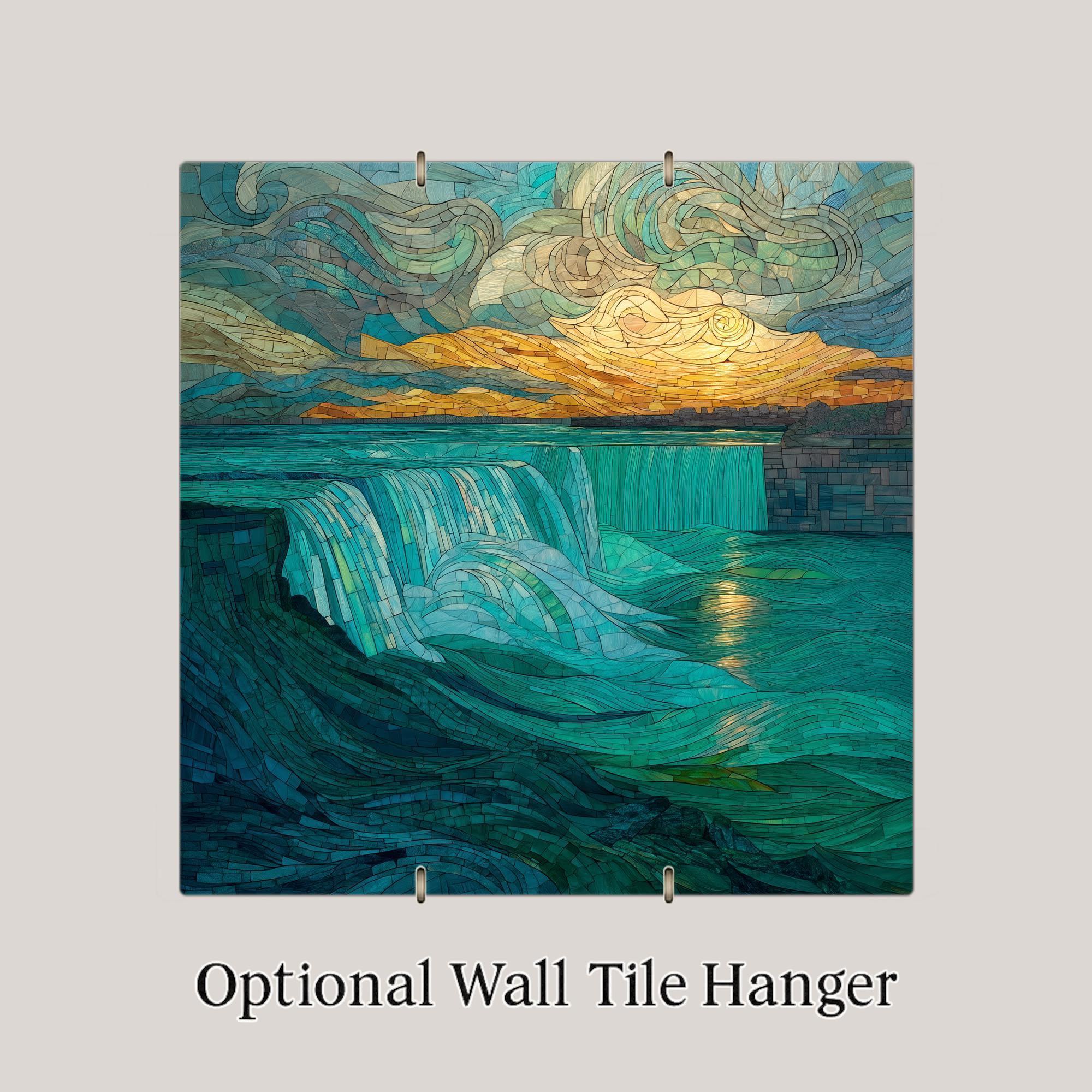 Bring the natural wonder of Niagara Falls into your home with this exquisite stained glass-style ceramic tile wall art. This piece features the cascading power of the falls rendered in brilliant turquoise, teal, and golden tones, swirling together in a mosaic-inspired design that evokes motion and light. Each tile is permanently printed for vibrant color, durability, and a sleek, glass-like finish.