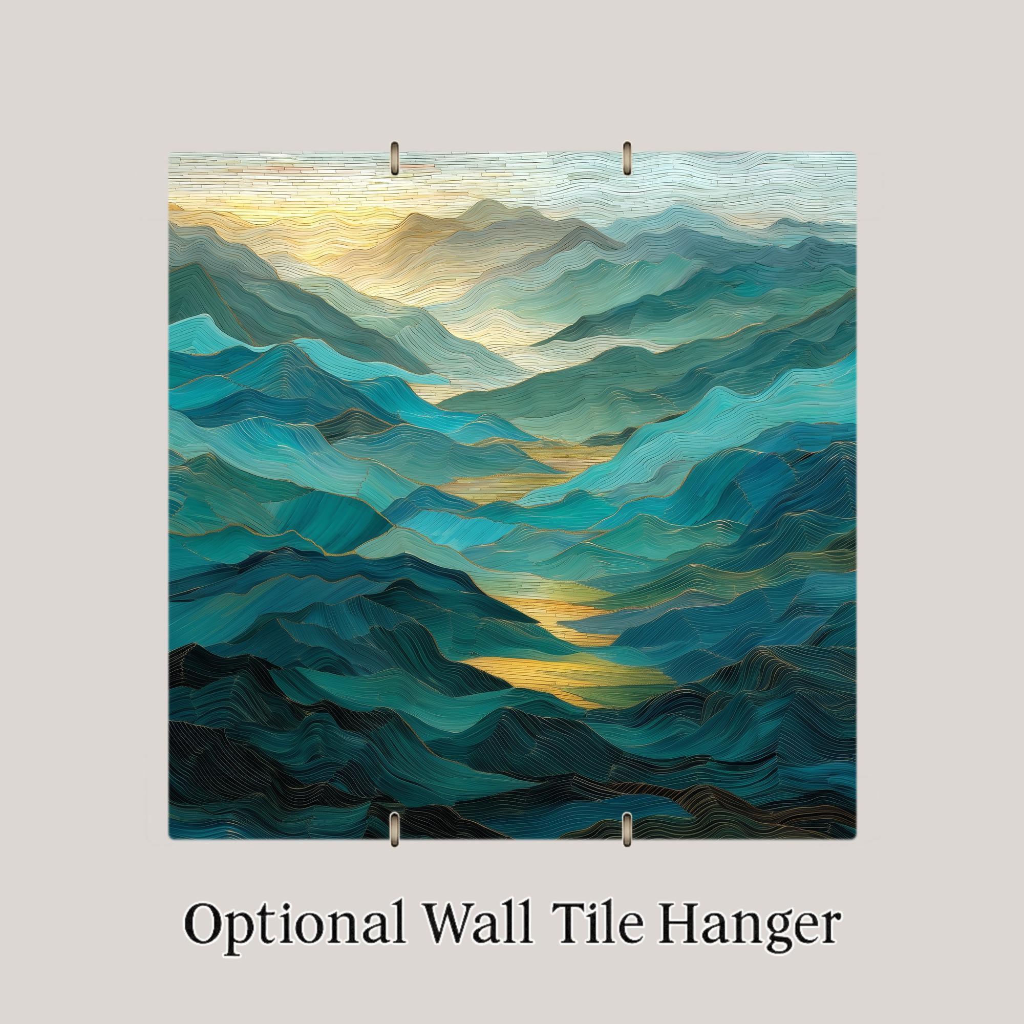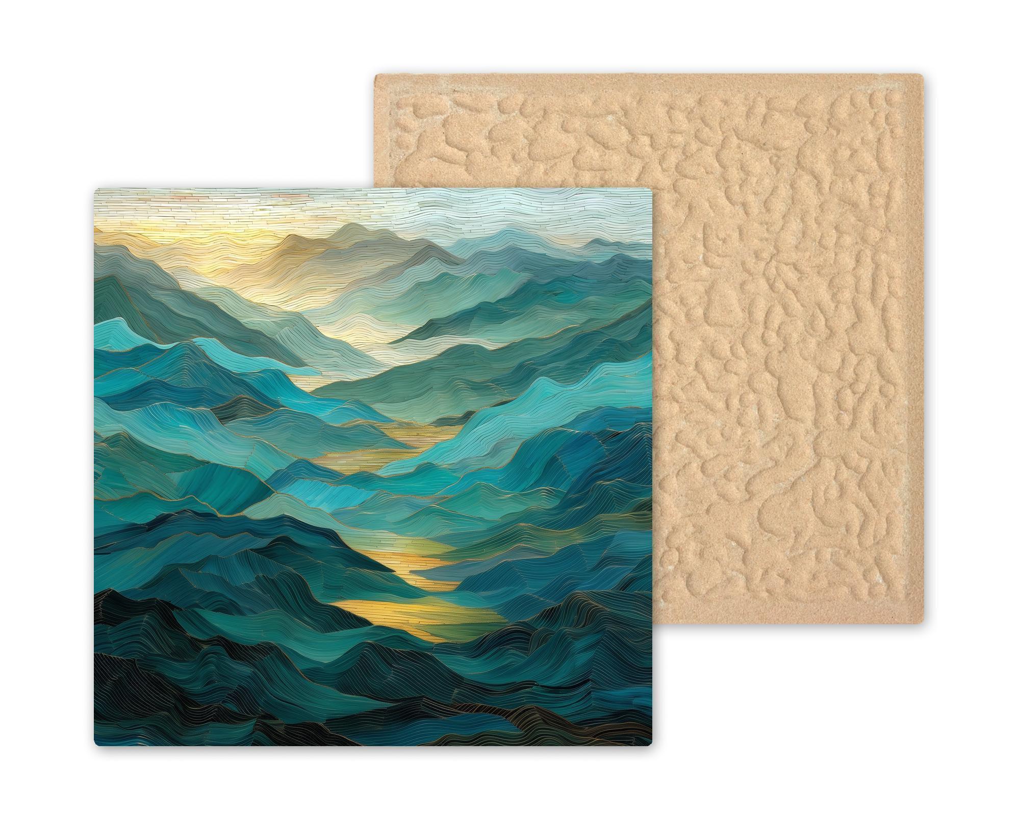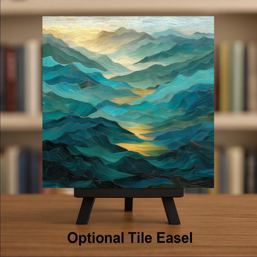 Celebrate the timeless beauty of the Smoky Mountains with this stained glass-style ceramic tile art. Layers of soft teal and sapphire ridges fade into golden light, creating a serene mosaic of color and form. The design is permanently printed on fine ceramic tile, producing a luminous finish that mimics the radiance of stained glass while remaining smooth, durable, and easy to maintain.