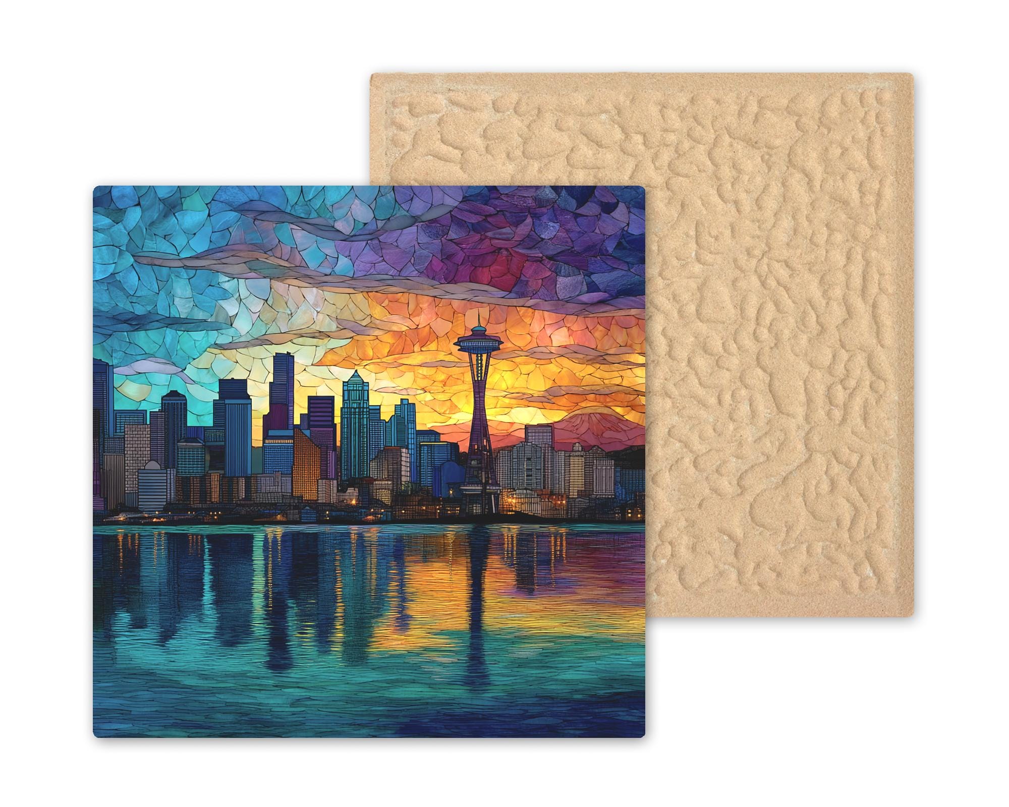 Perfect as a gift for city lovers, travelers, or anyone who adores Seattle’s skyline, this stained glass-style ceramic tile captures the city’s warmth, color, and energy.