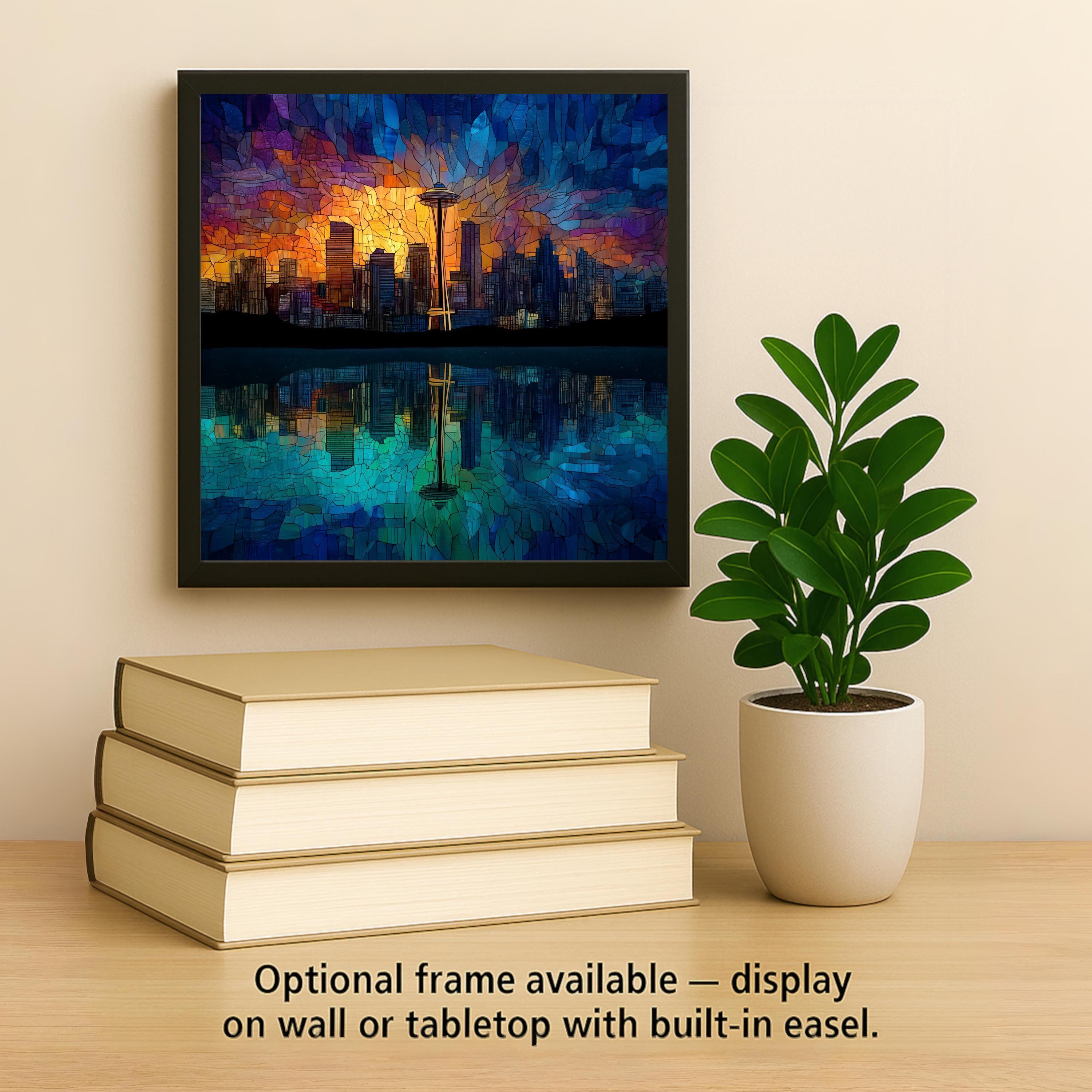 This Seattle cityscape wall art complements both modern and coastal interiors, adding a colorful yet refined touch to your living room, hallway, or workspace. Optional accessories include a tile wall hanger, an easel tile stand, or cork backing. You can also choose the premium frame option for a gallery-quality presentation that works beautifully for both wall and tabletop display.