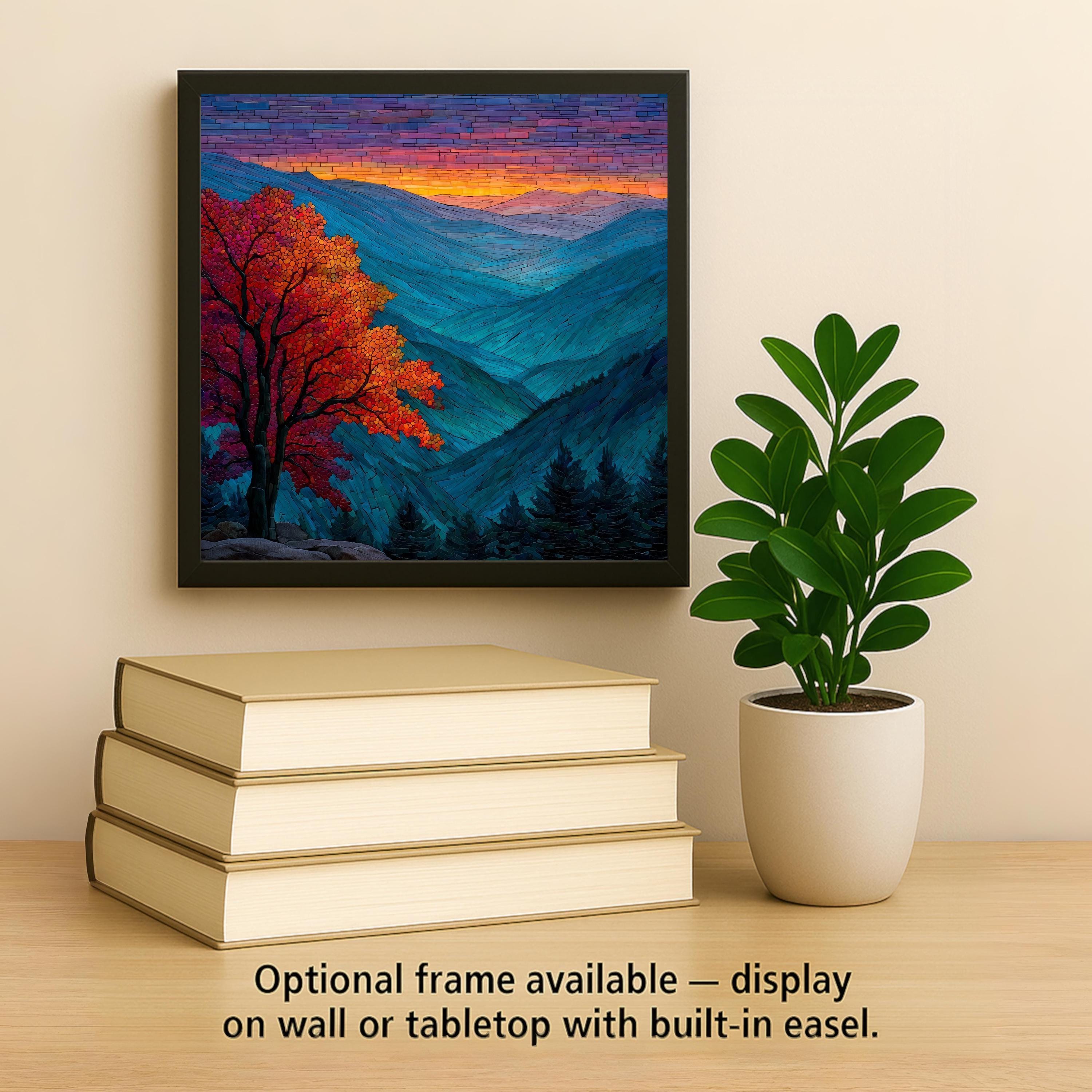 Celebrate the serene beauty of the Smoky Mountains with this luminous stained glass-style ceramic tile wall art. Layers of blue ridges fade into the distance beneath a glowing sunset sky, while an autumn tree in fiery reds and oranges stands in brilliant contrast. The mosaic-like texture and vibrant jewel tones give the artwork the look of handcrafted stained glass while remaining smooth, durable, and easy to clean.