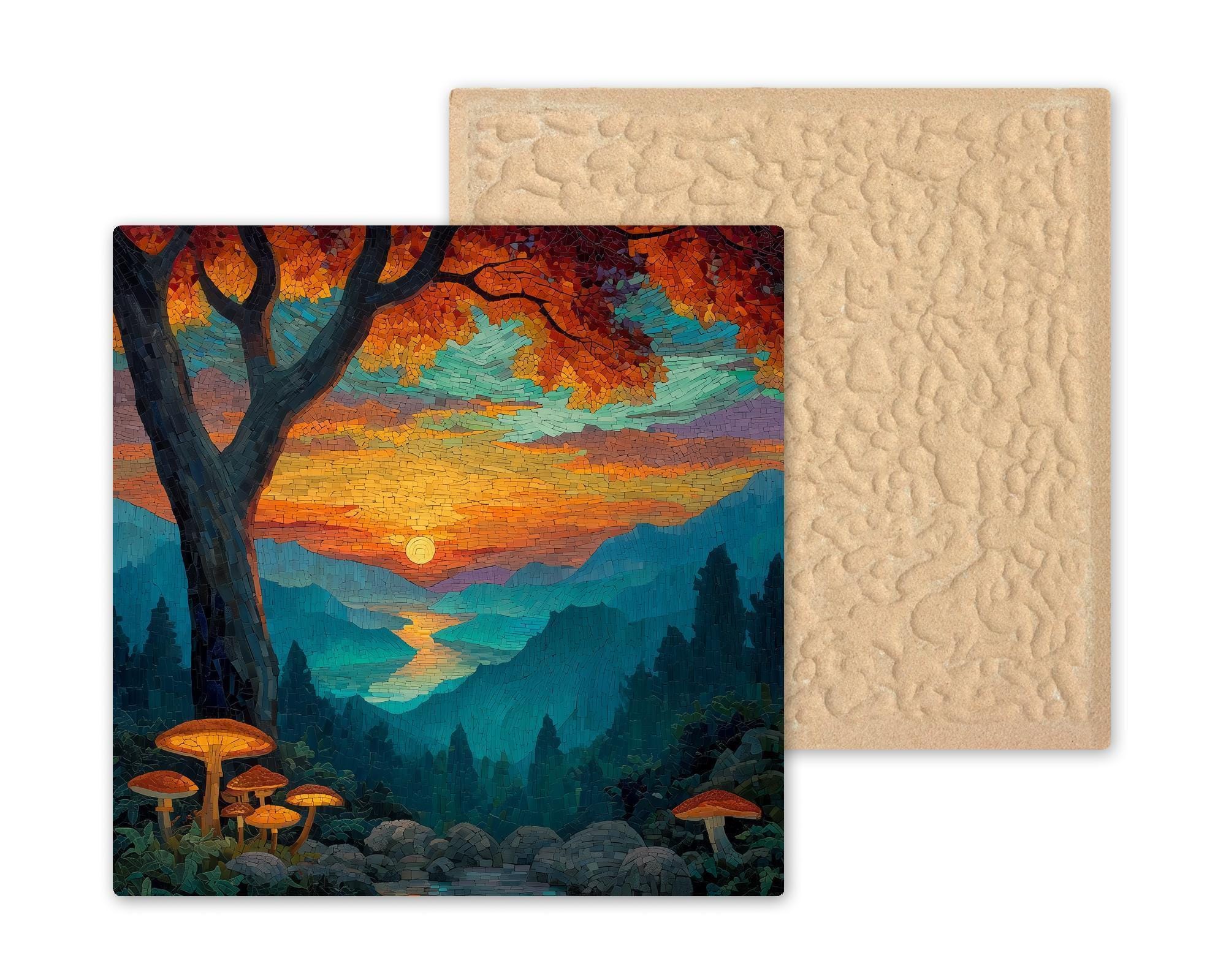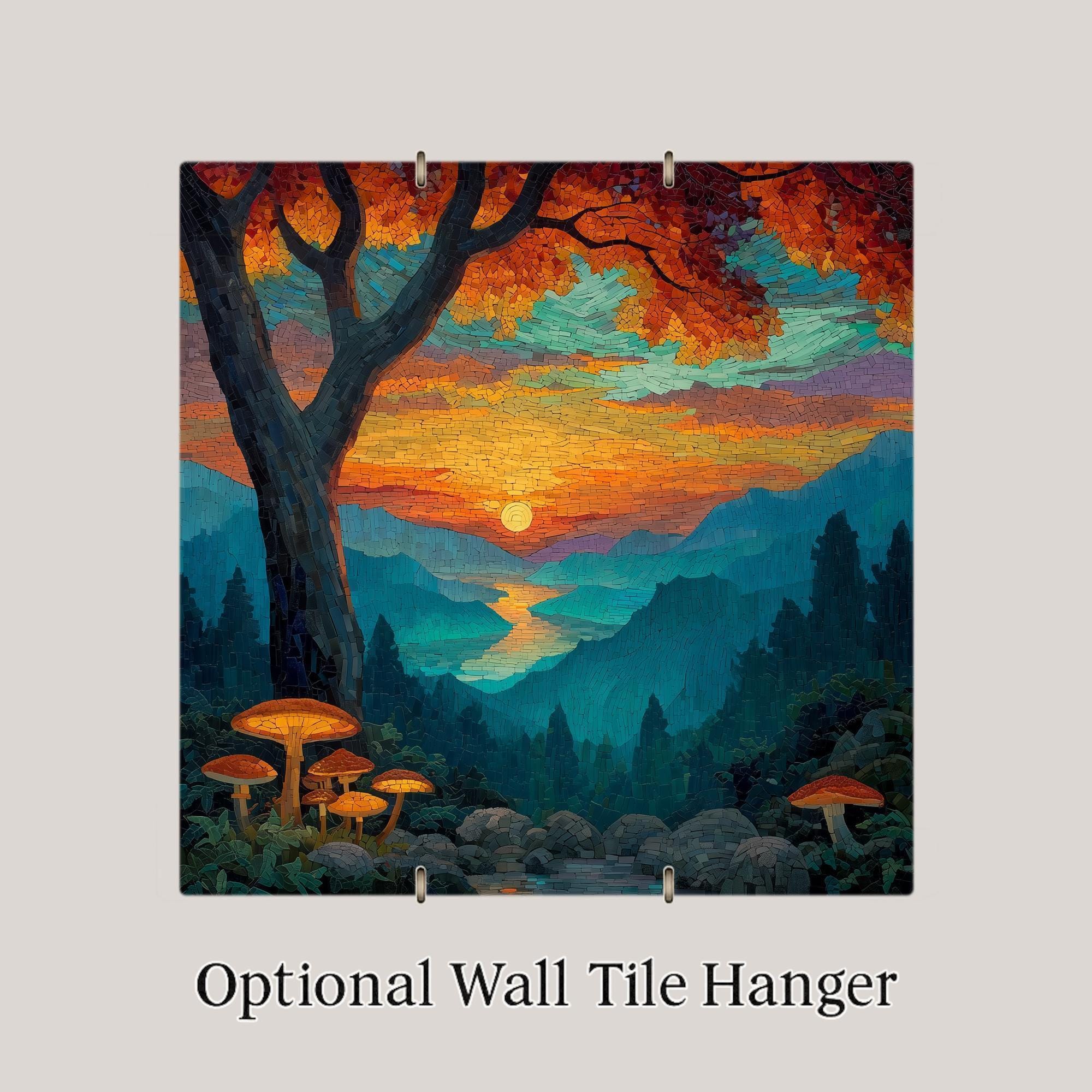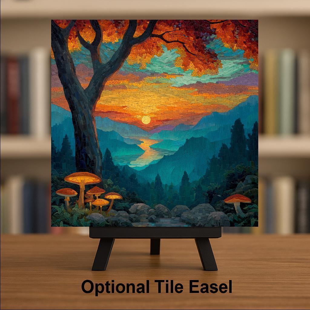 Celebrate the tranquil glow of sunset over the Blue Ridge Mountains with this stained glass-style ceramic tile wall art. The artwork radiates with vibrant jewel tones — amber, teal, violet, and turquoise — blending the calm of twilight with the warmth of the setting sun. Mushrooms illuminated at the forest’s edge add a touch of quiet enchantment, while layered mountain ridges stretch into the horizon in a breathtaking mosaic of color.