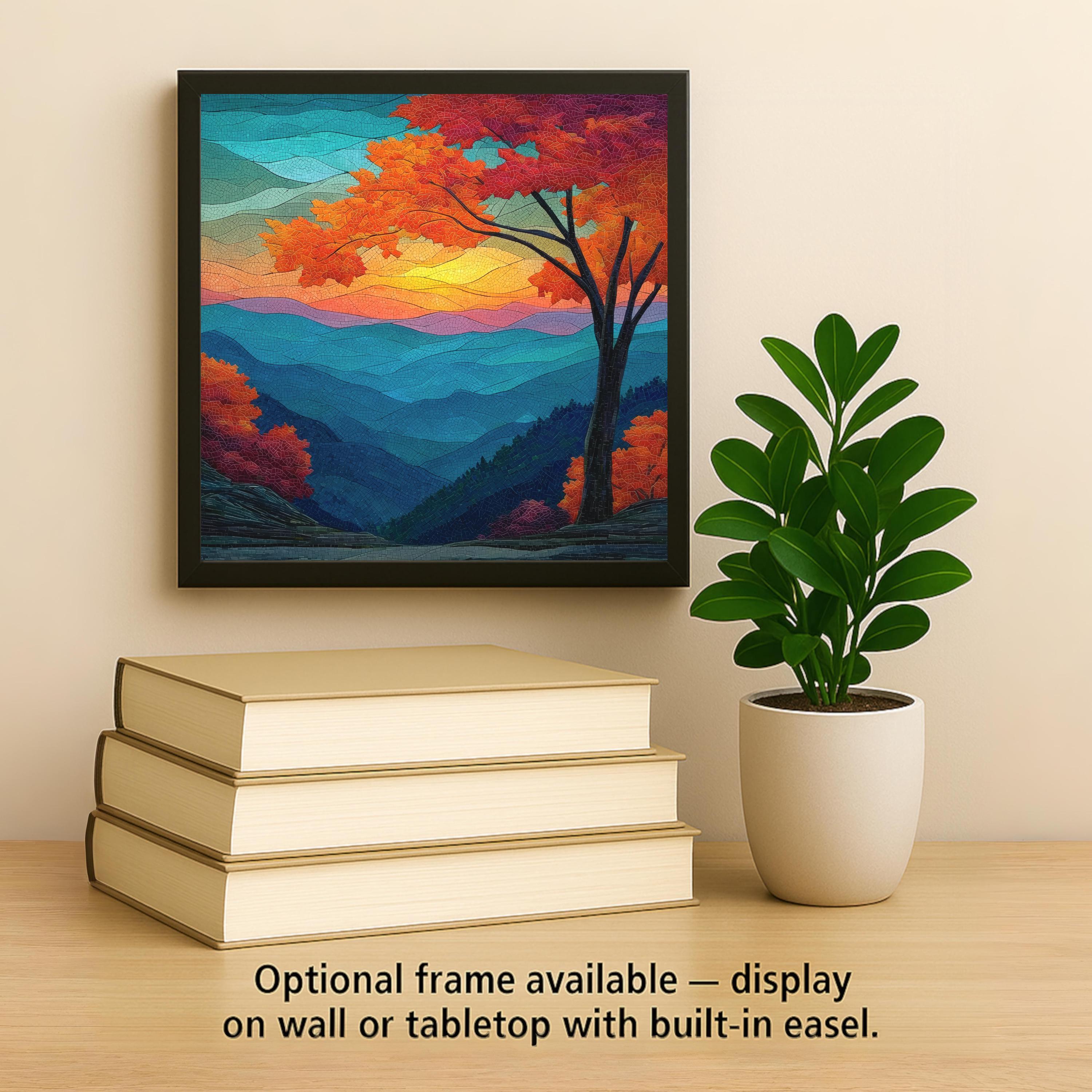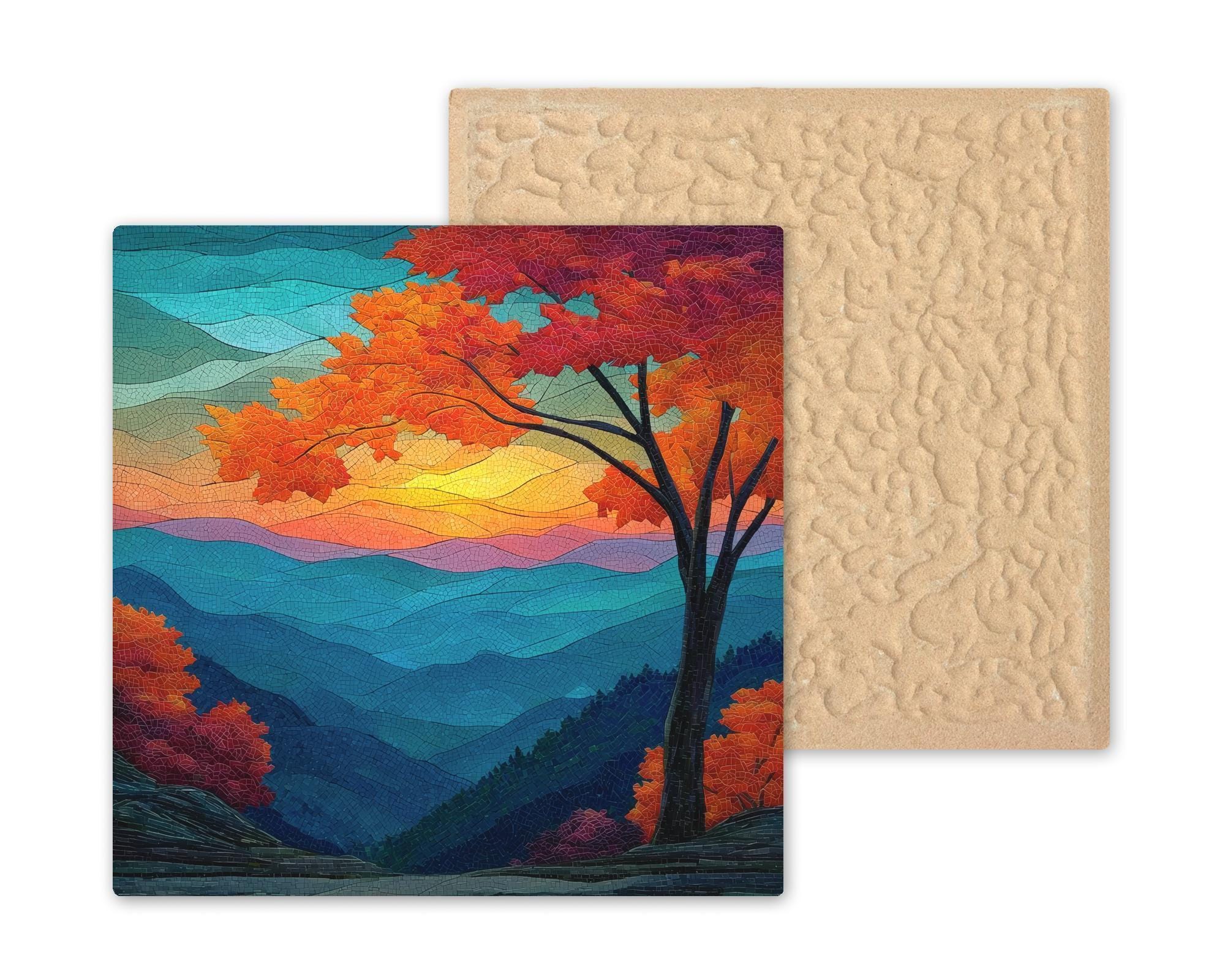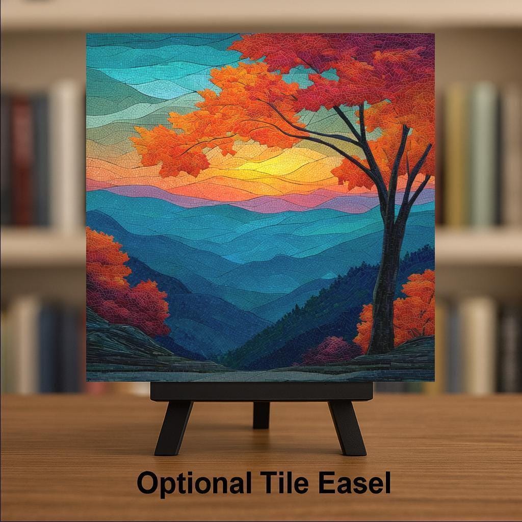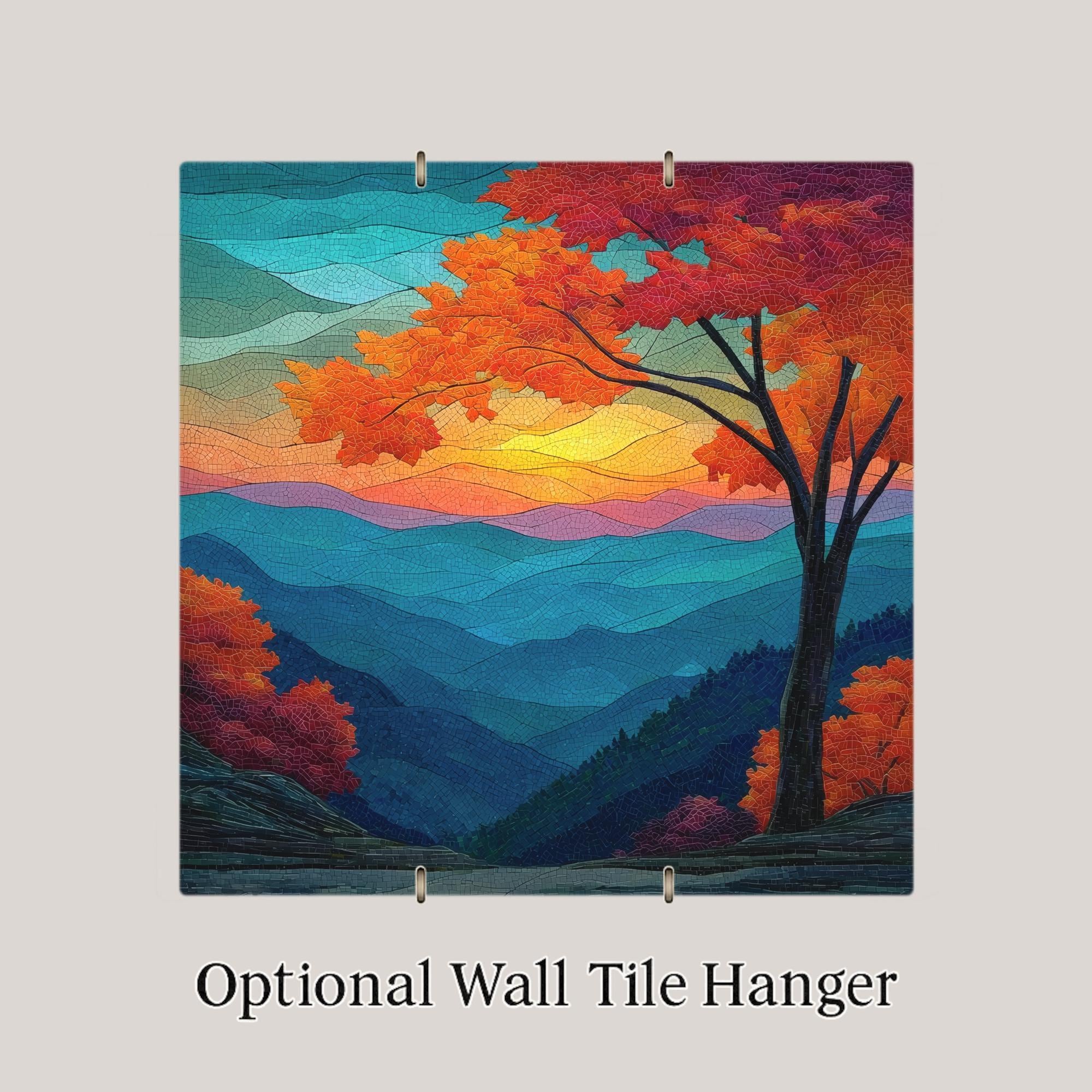 Bring the stunning colors of the Smoky Mountains sunset into your home with this stained glass-style ceramic tile wall art. Featuring layers of rolling blue ridges, glowing amber skies, and a tree adorned in vibrant autumn hues, this piece radiates light and serenity. The mosaic-inspired texture and intricate detail create the illusion of handcrafted stained glass, adding an elegant and timeless quality to your decor.