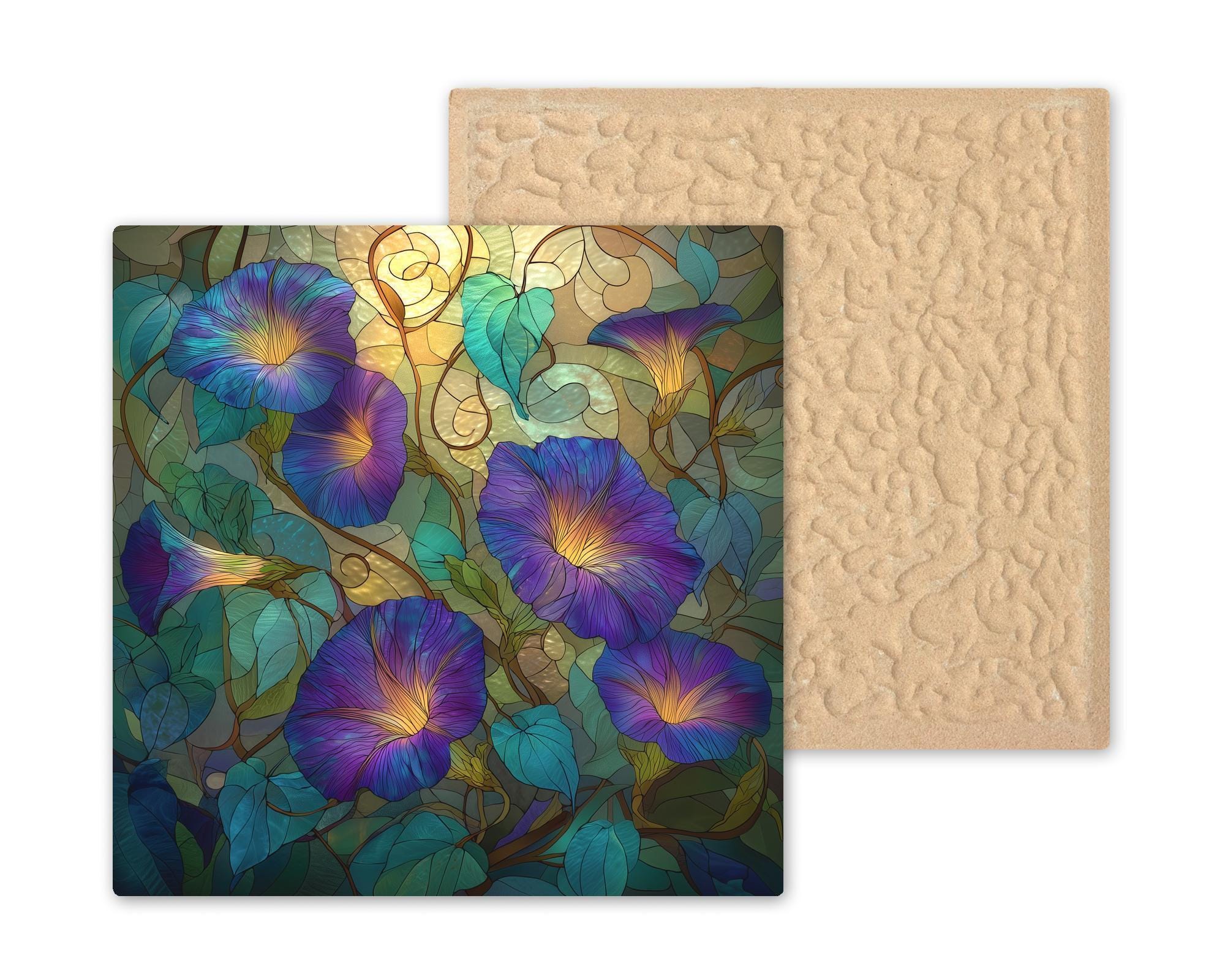 Celebrate the beauty of the morning light with this stained glass-style Morning Glory ceramic tile. Radiant blues, purples, and teals intertwine in an elegant floral pattern accented by warm golden tones. The intricate vine design and luminous color palette create a peaceful, uplifting atmosphere—ideal for wall art, wall decor, and botanical home decor.
