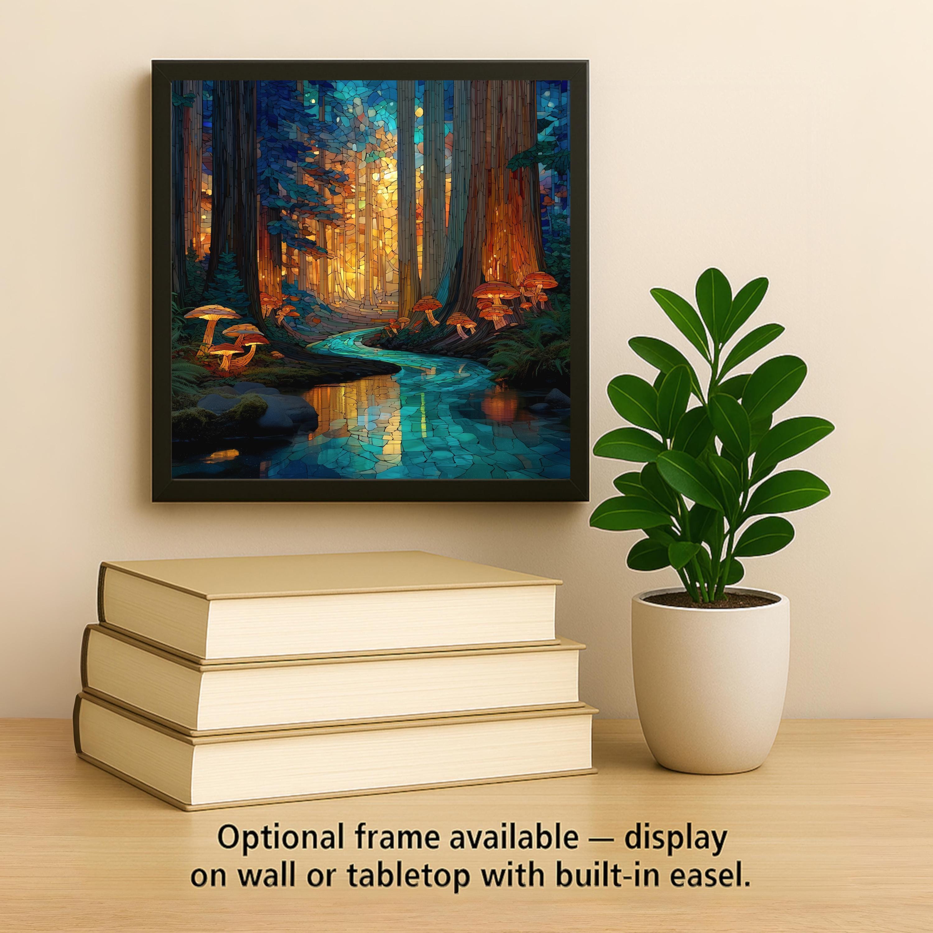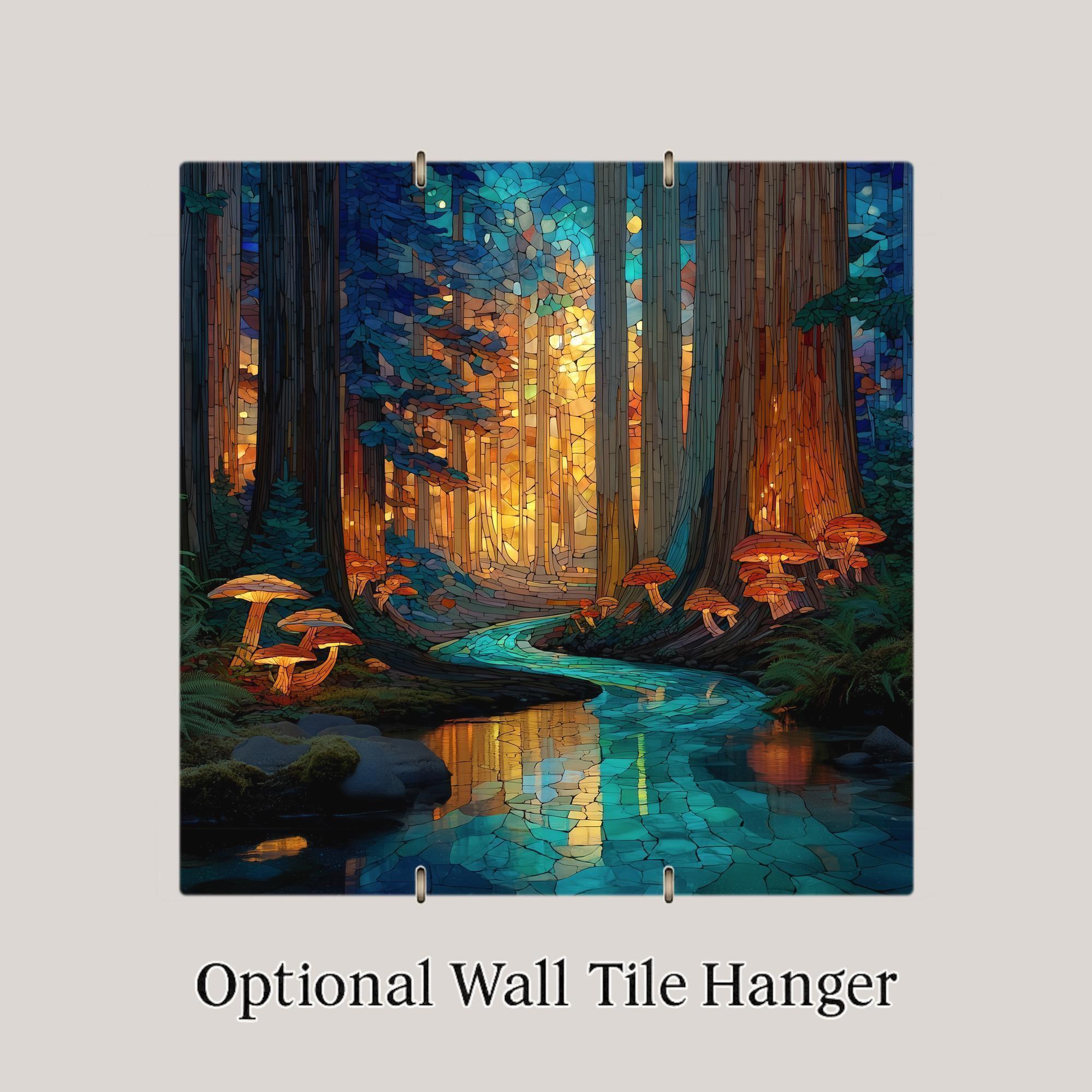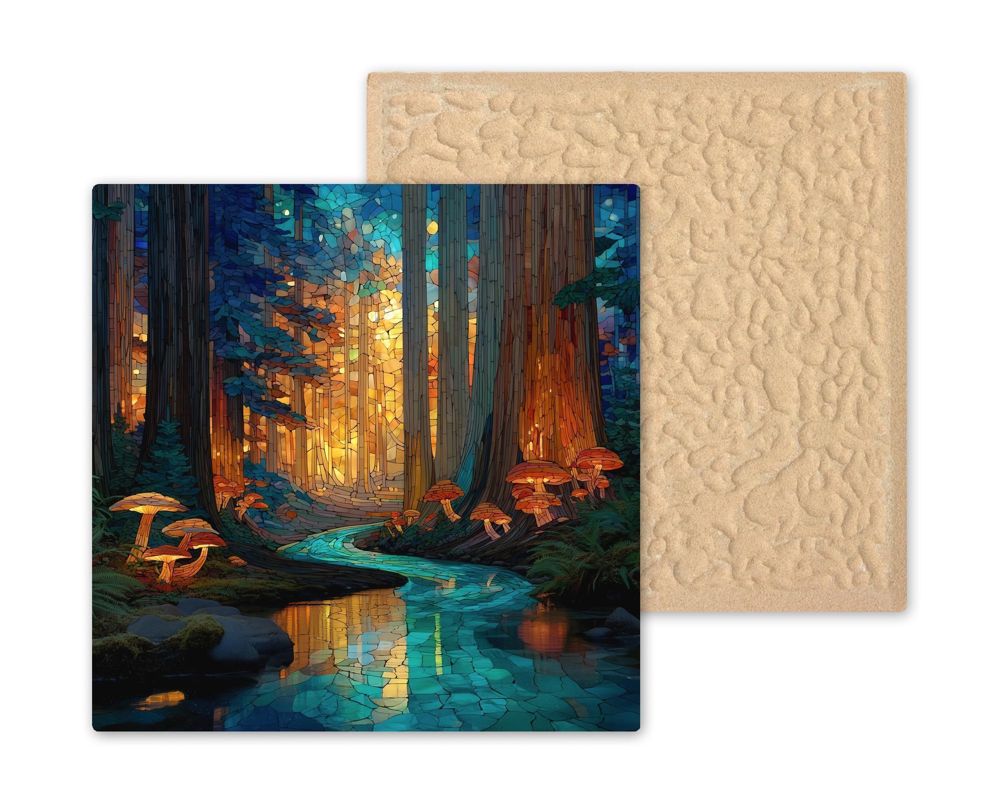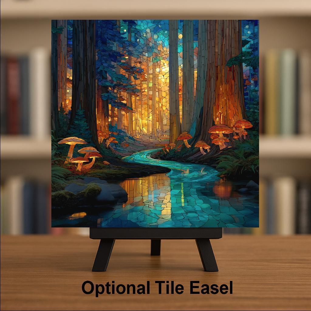 Bring the mystery and majesty of the redwoods into your space with this stained glass-style ceramic tile artwork. Featuring warm amber light streaming through forest canopies and a shimmering blue creek winding through mossy roots and glowing mushrooms, this design feels alive with color and calm. Perfect as wall art, wall decor, or an accent piece in your home decor, it adds both tranquility and character to any room.