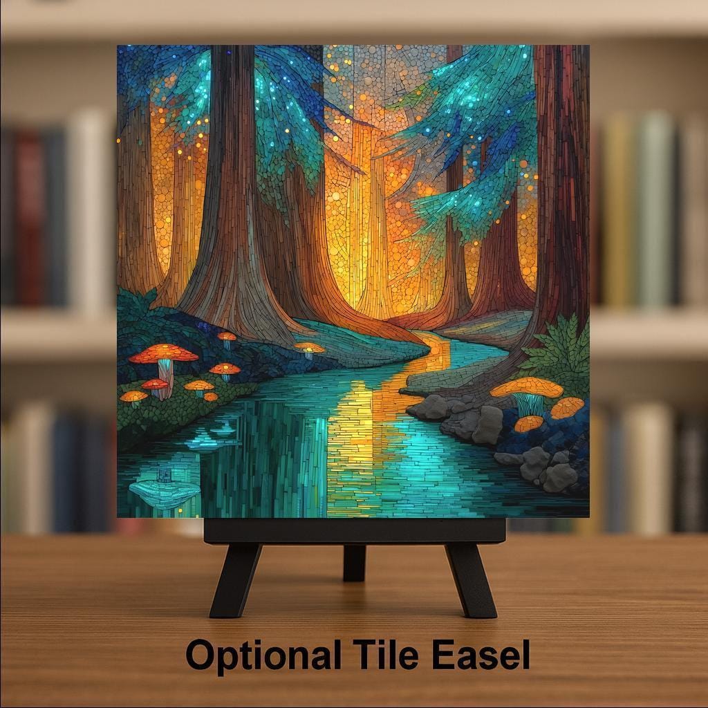 Bring the enchanting glow of the forest into your home with this stained glass-style ceramic tile artwork. Inspired by the redwoods at twilight, the piece features rich amber light filtering through towering trunks and glistening teal reflections in a peaceful creek. It’s the perfect piece of wall art for your home decor, offering warmth, depth, and serenity in every glance.
