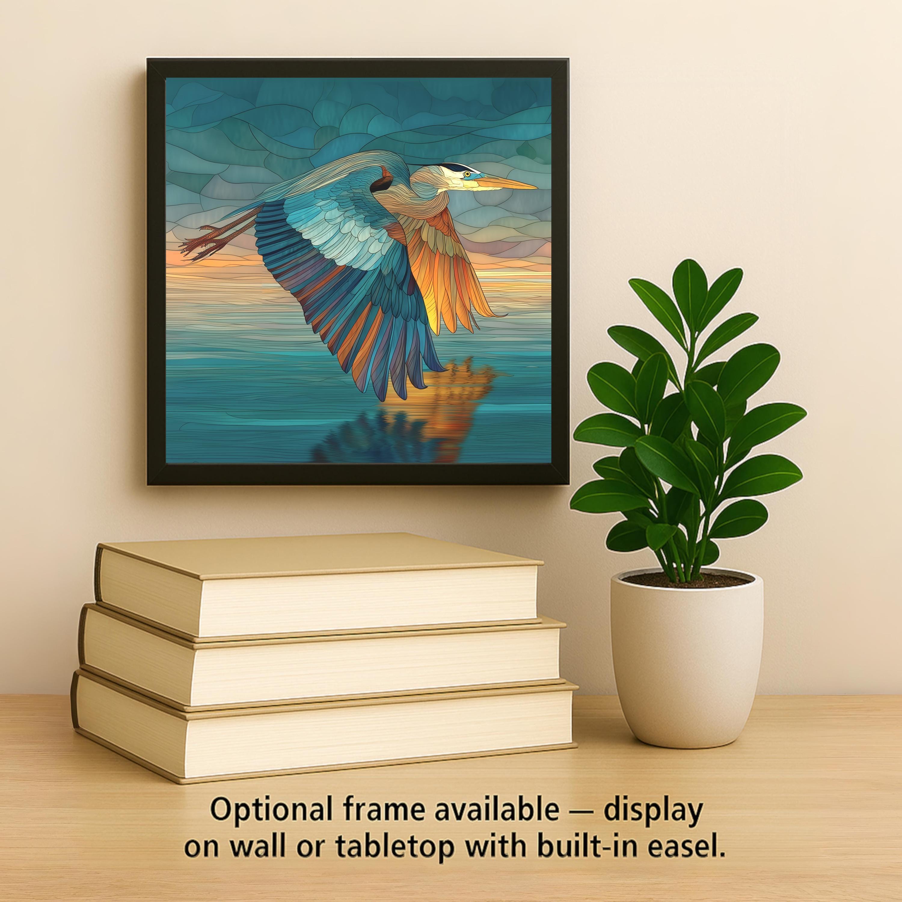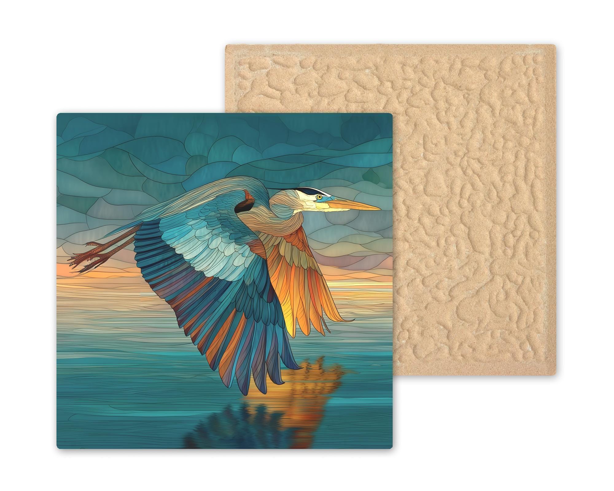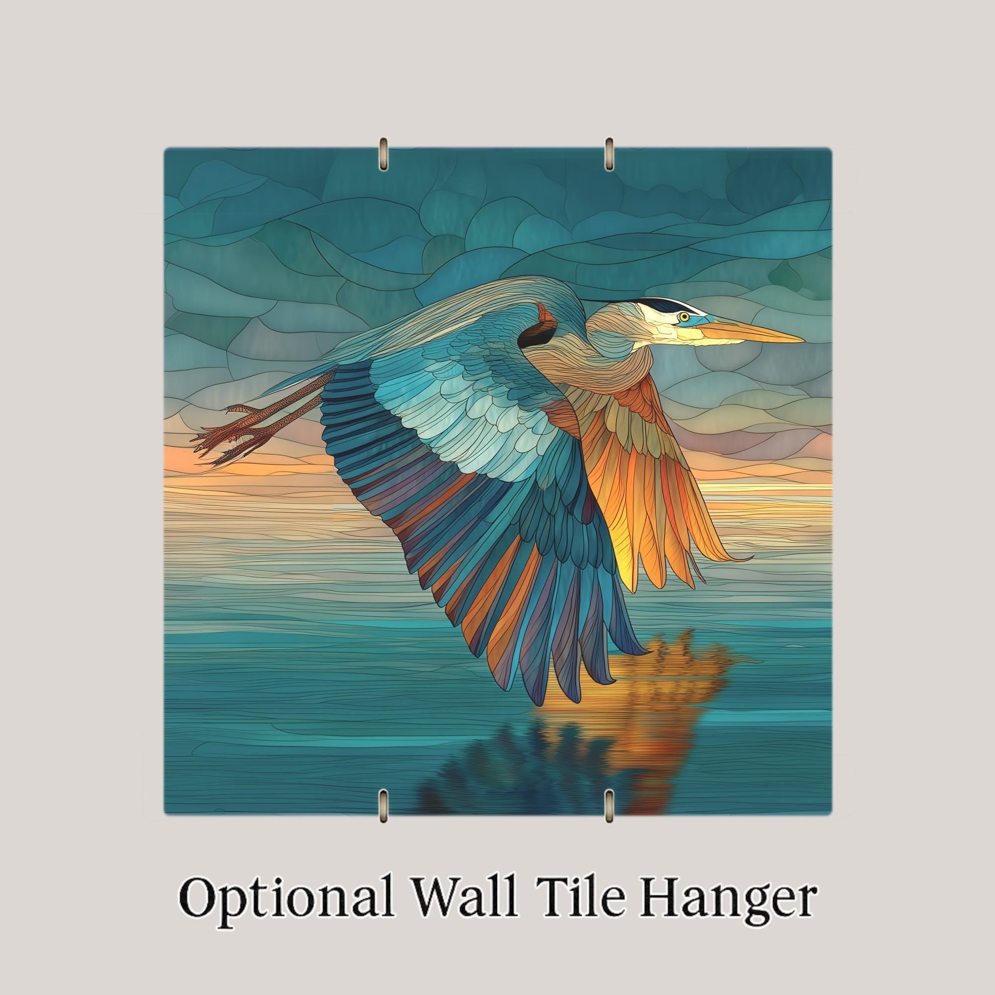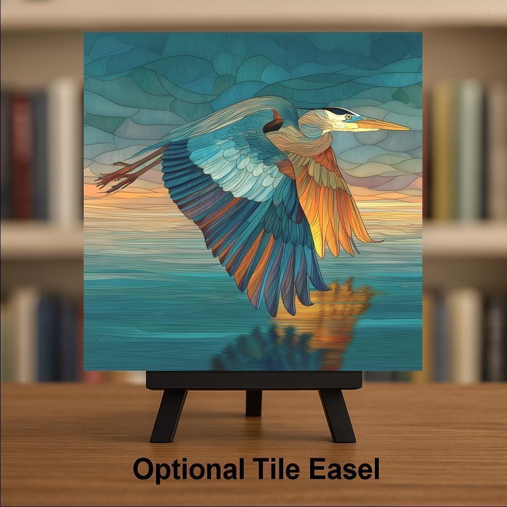 Celebrate the beauty of motion and nature’s tranquility with this stained glass-style flying heron ceramic tile. A majestic blue heron soars above a serene body of water, its wings shimmering in hues of teal, sapphire, and bronze against a golden horizon. This luminous art tile adds sophistication and warmth to any room, making it a standout piece for wall art, wall decor, or elegant home decor.