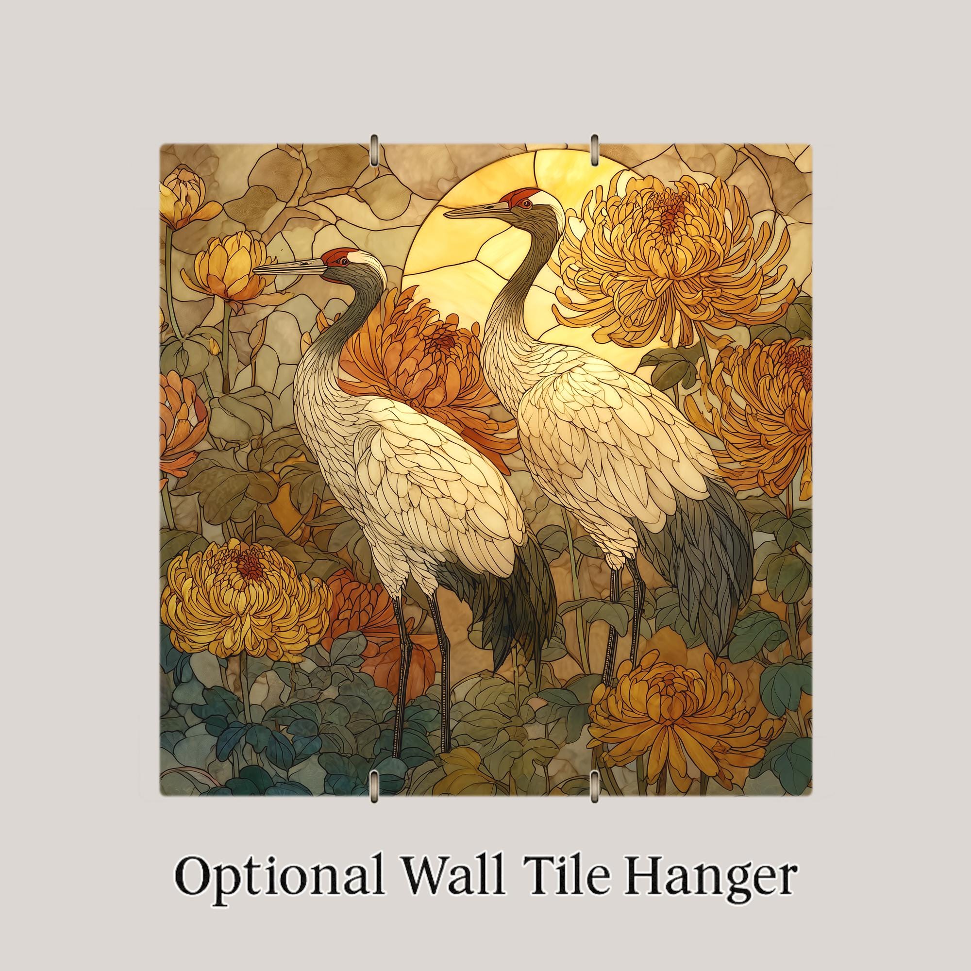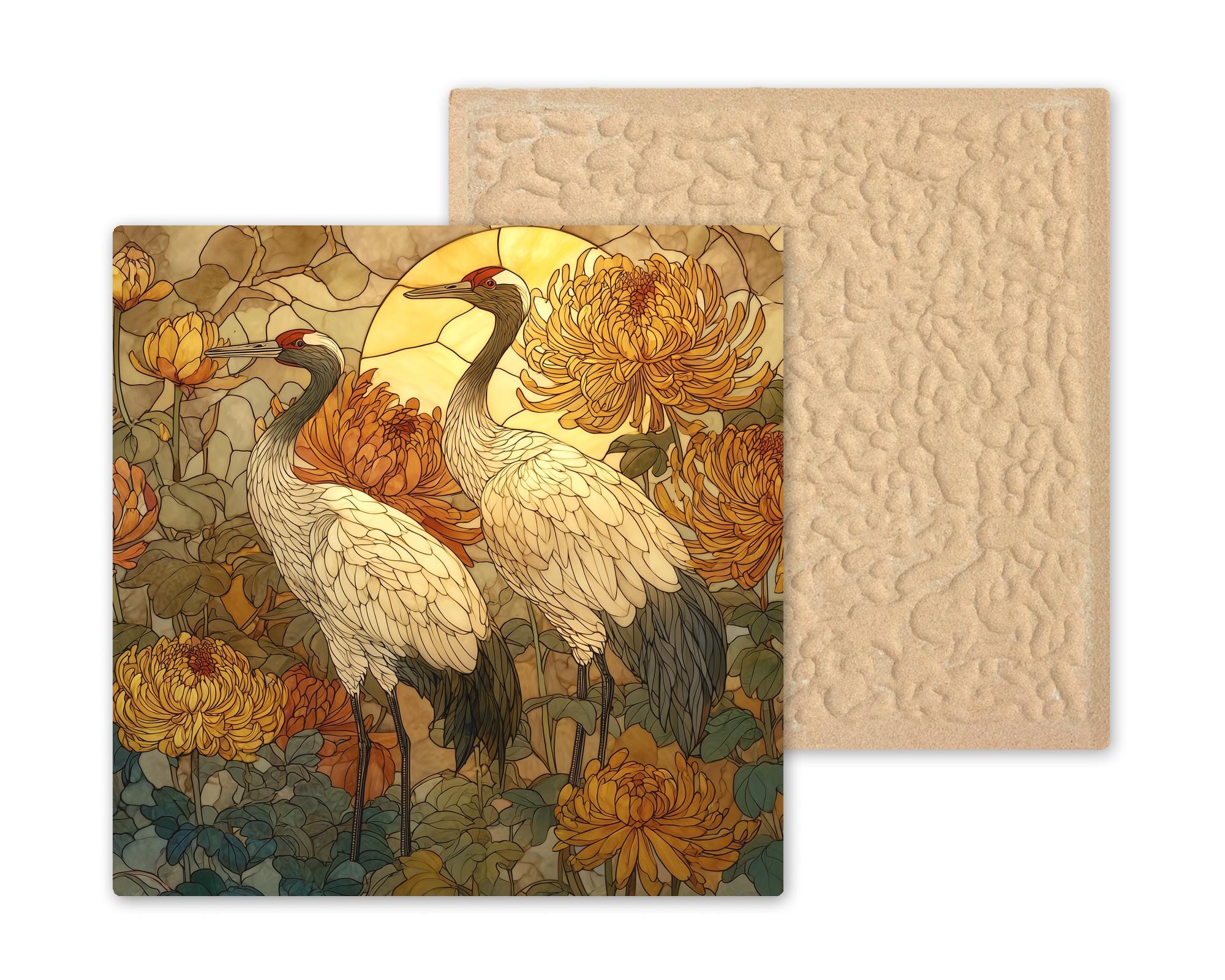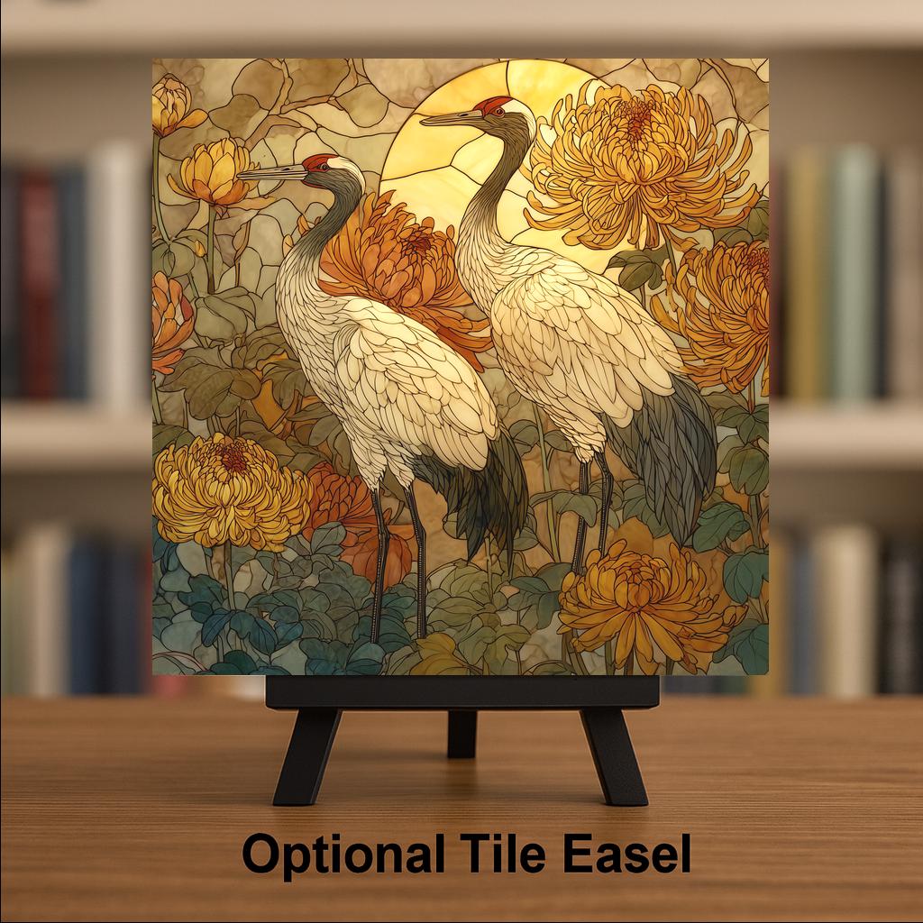 Bring the elegance of nature into your home with this stained glass-style Cranes and Chrysanthemums ceramic tile. Two graceful cranes stand among blooming golden chrysanthemums, bathed in the soft light of a glowing sun. The warm palette of gold, mocha, and sage creates an inviting composition that fits effortlessly into natural and earth-toned home decor.