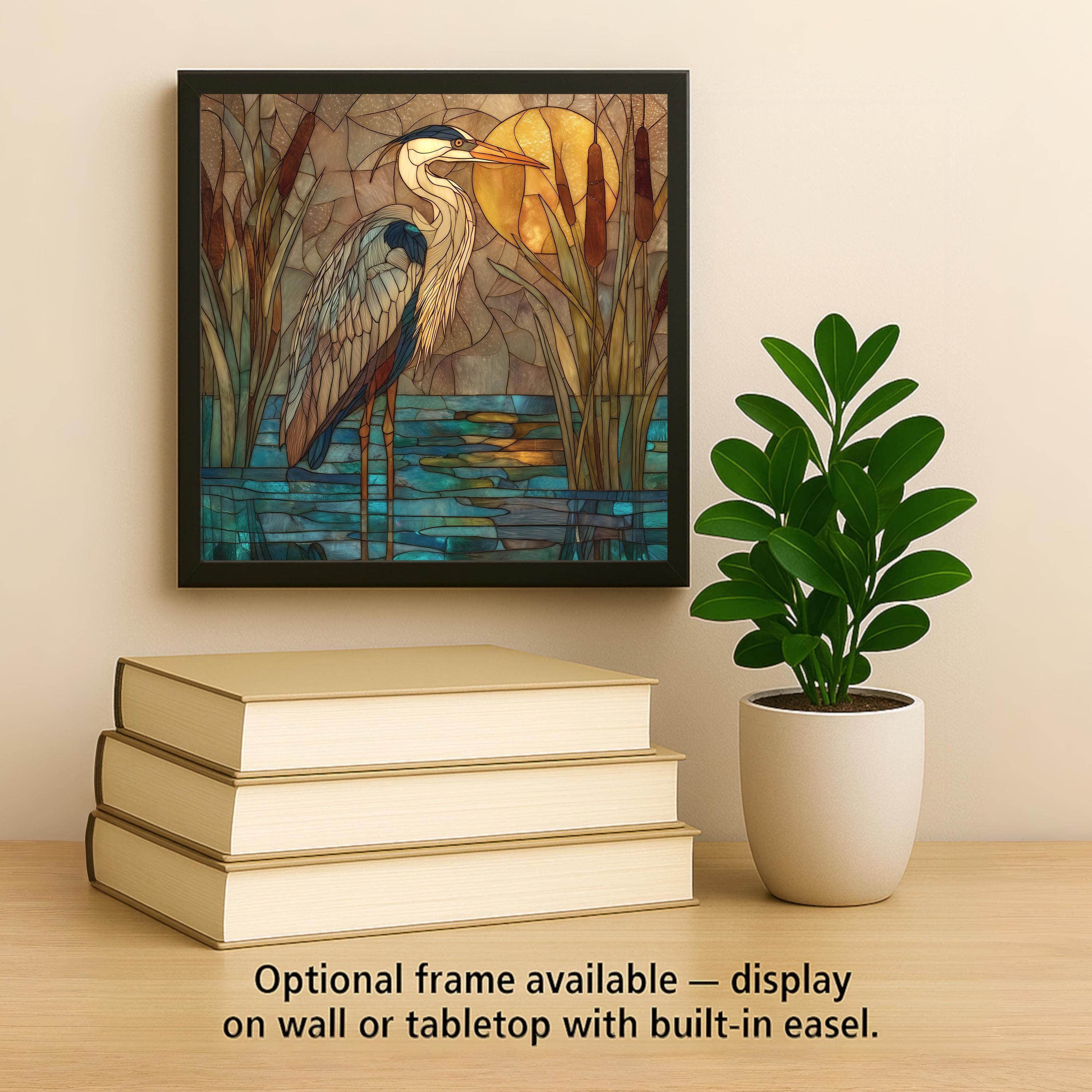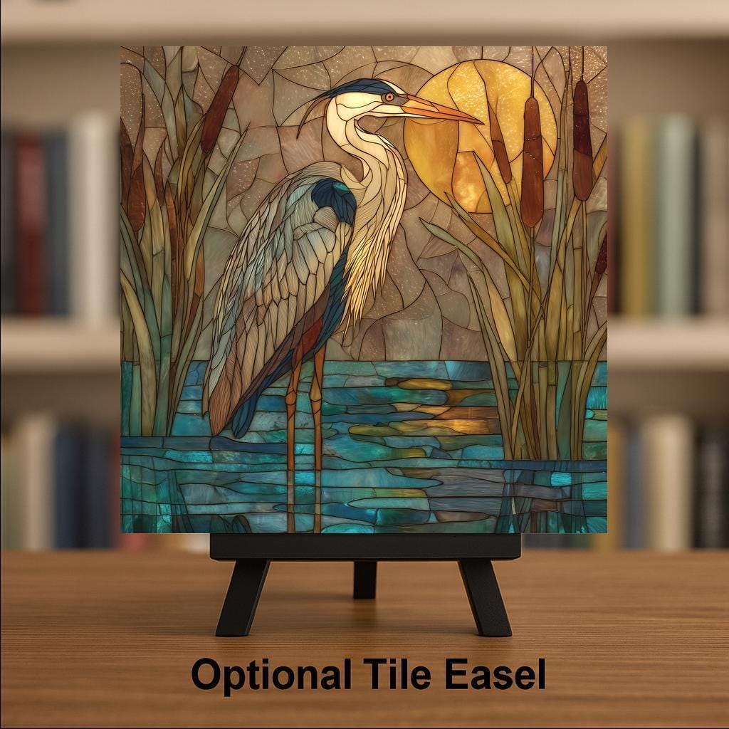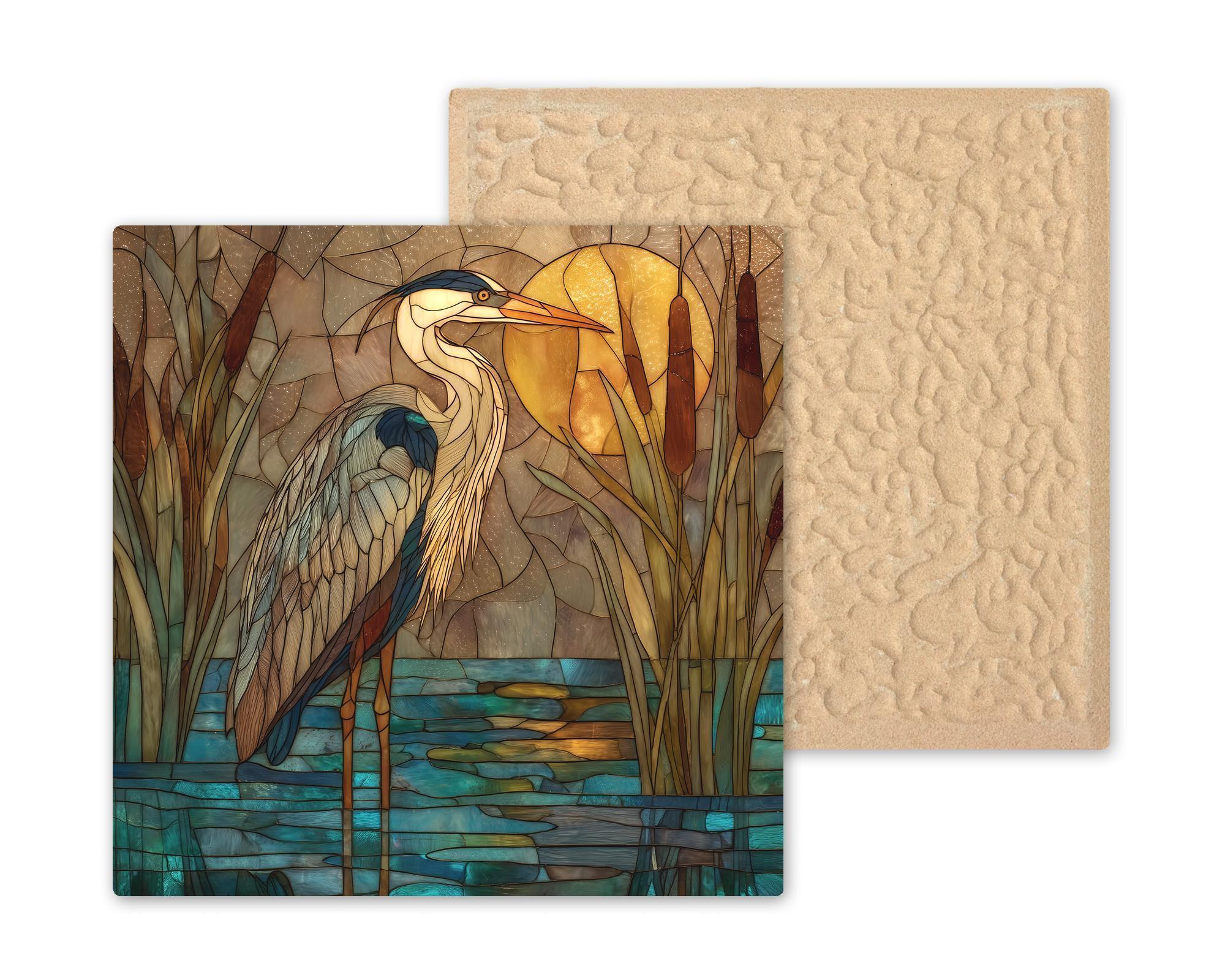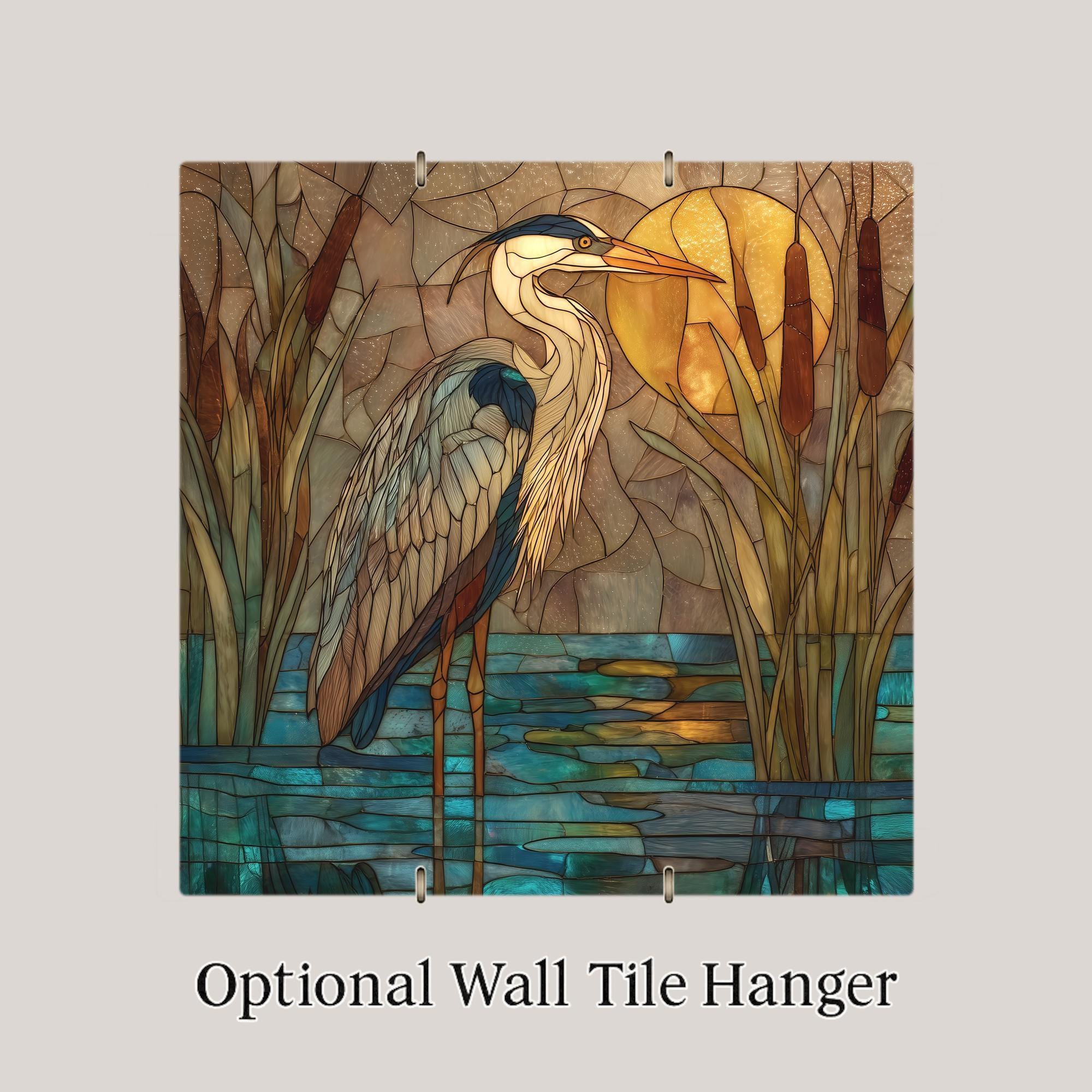 Capture the stillness and beauty of a golden evening with this stained glass-style Blue Heron at Sunset ceramic tile artwork. A graceful heron stands among cattails in warm amber light reflected on teal-blue water. The blend of earth tones and turquoise hues creates a peaceful balance that enhances any space as wall art, wall decor, or tranquil home decor.