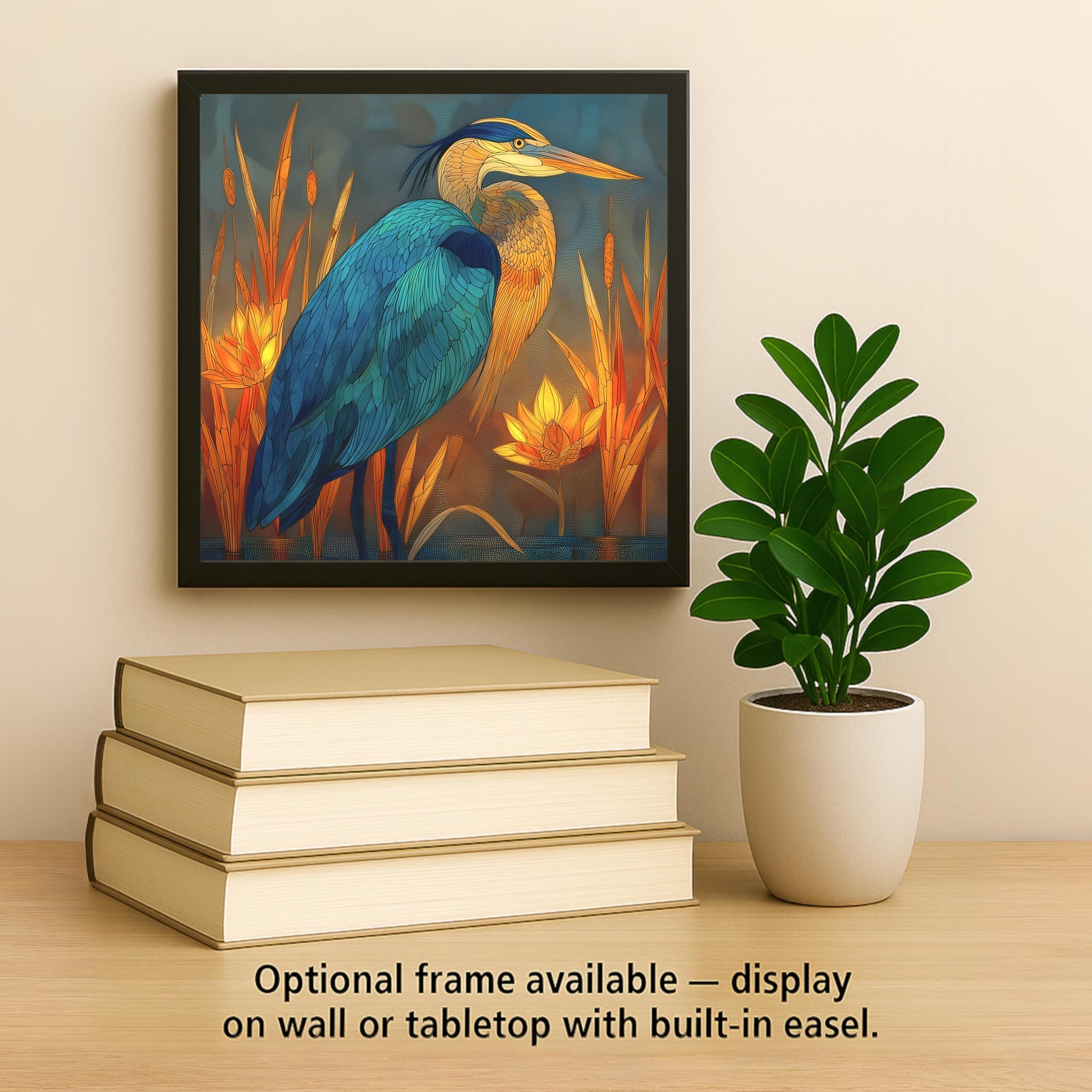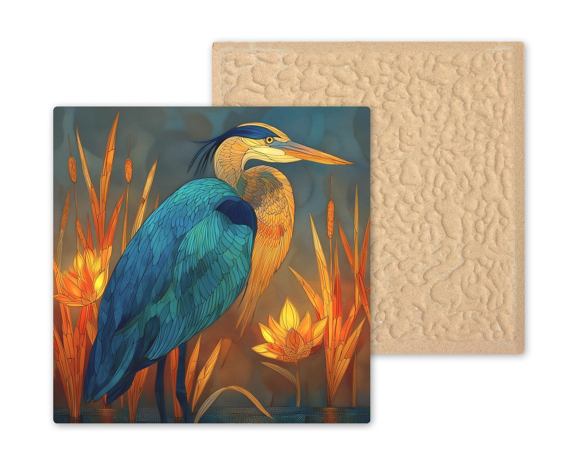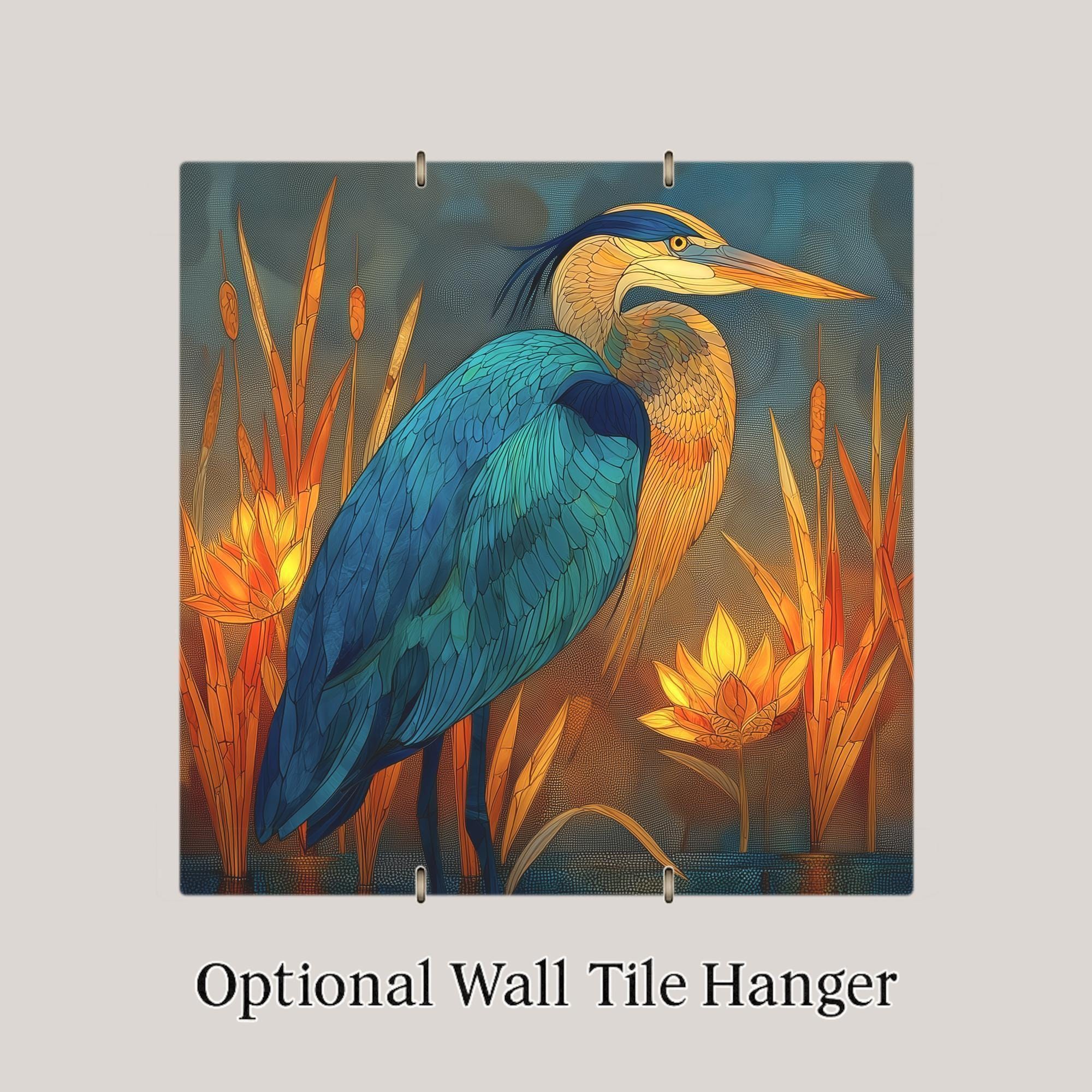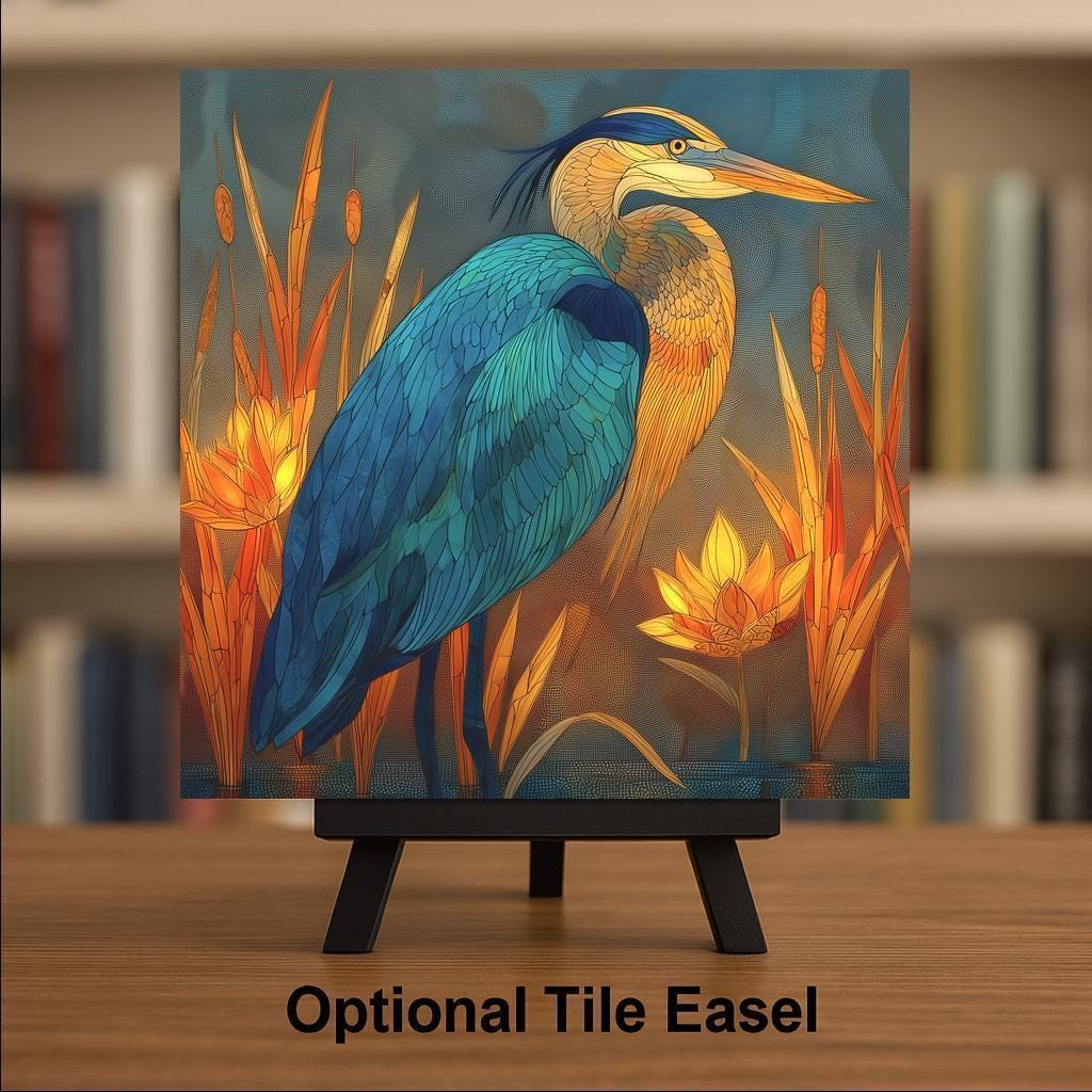 Bring the serenity of nature and the glow of evening light into your home with this stained glass-style Teal and Amber Heron ceramic tile artwork. The majestic heron stands peacefully among cattails and lotus flowers, surrounded by glowing gold and turquoise reflections. The result is a vibrant yet calming piece ideal for wall art, wall decor, or nature-inspired home decor.