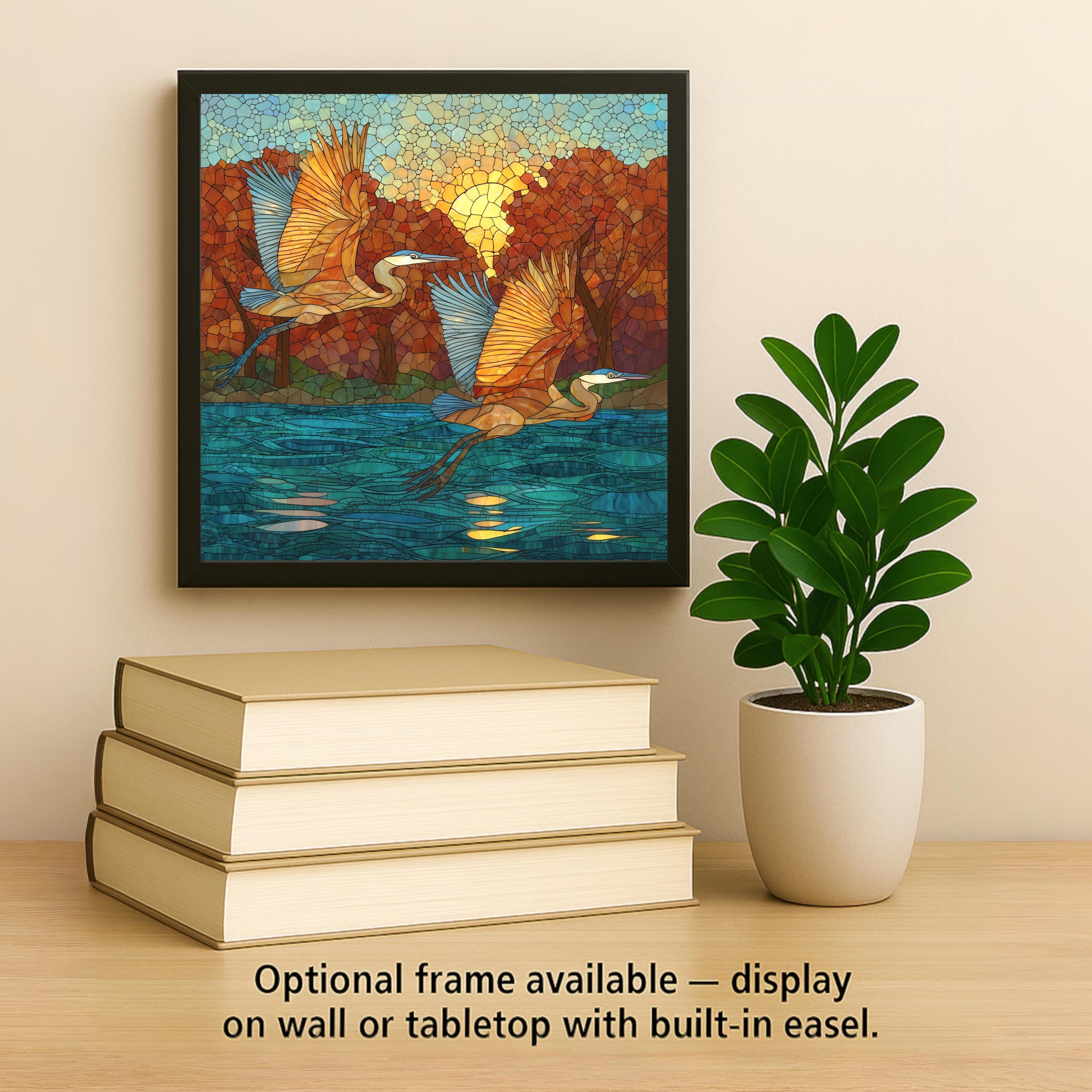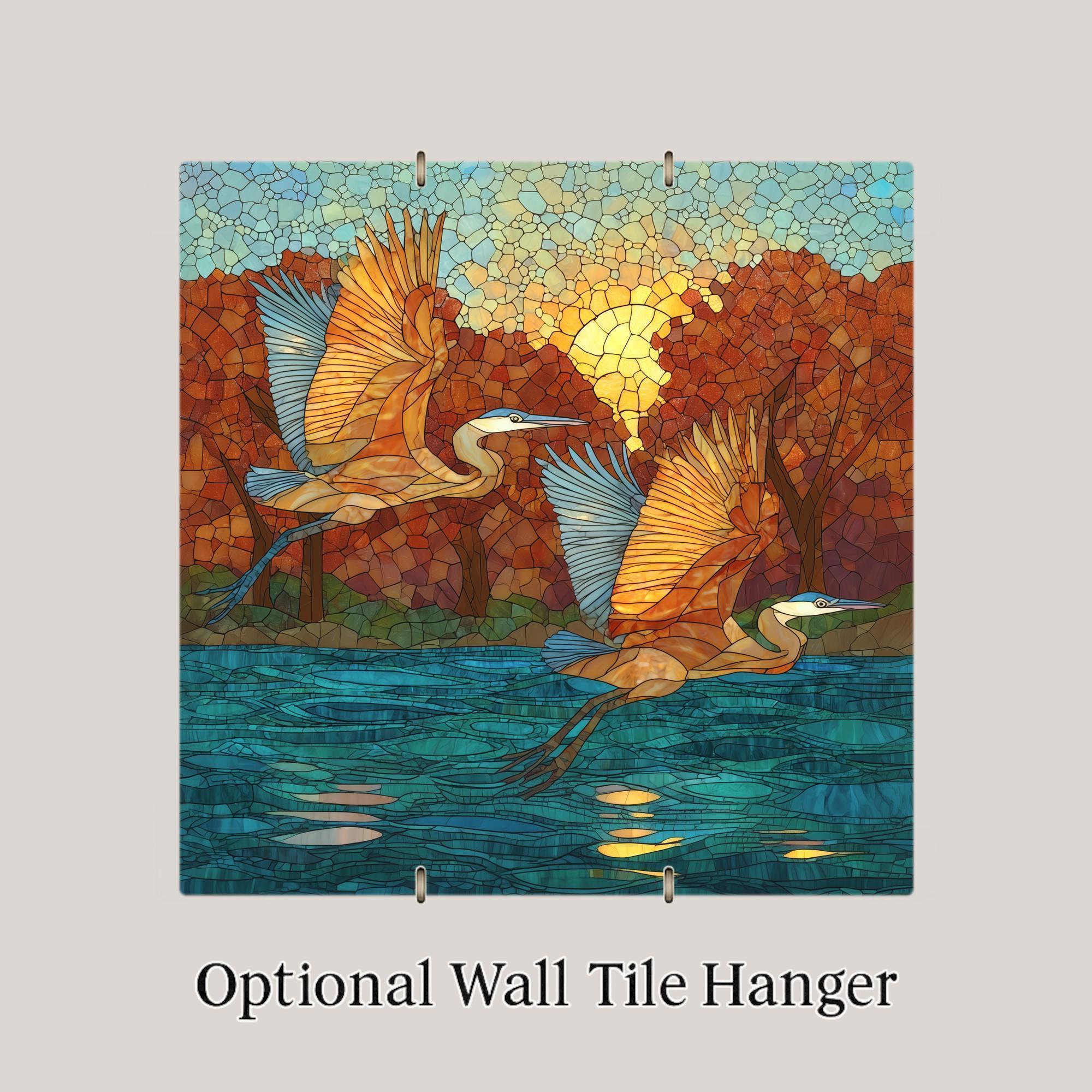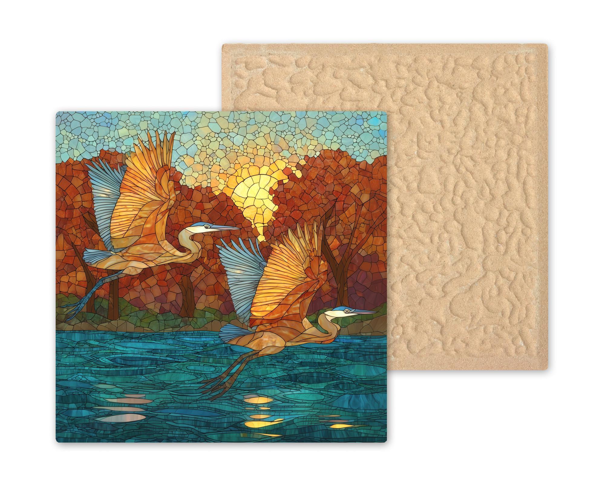 The cobalt, teal, and warm gold autumn palette gives this heron tile a warmth and season that pure field-guide renderings lack. It feels like an actual encounter rather than an illustration.