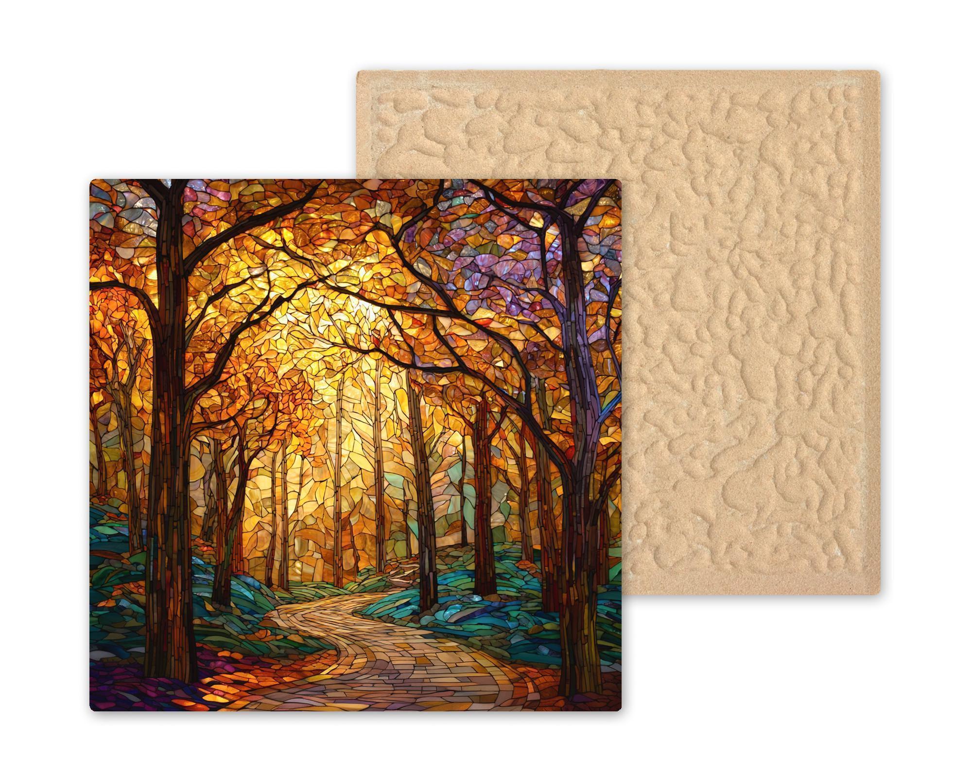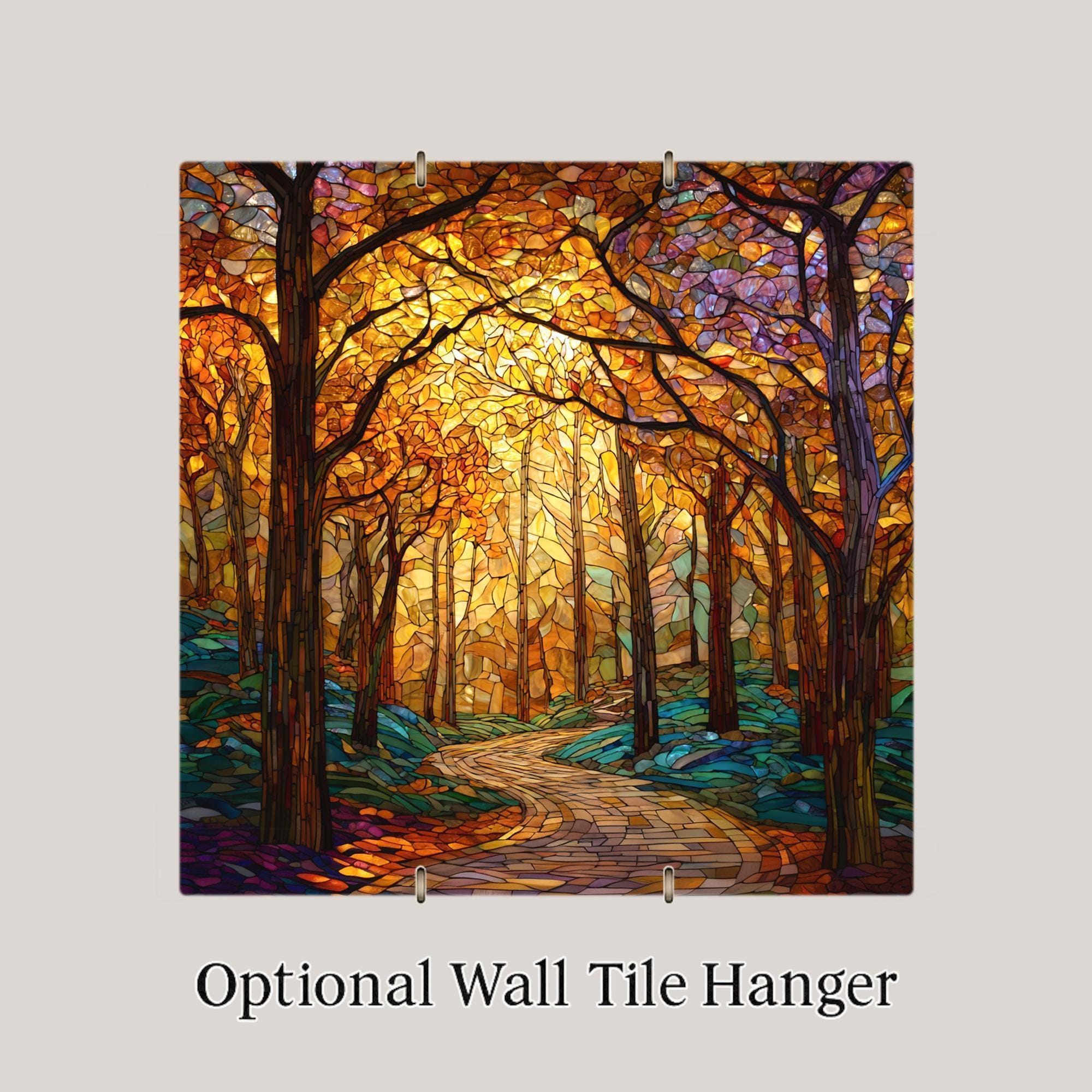 Bring the golden glow of autumn into your home with this Autumn Forest Path ceramic tile wall art. The detailed stained glass style design features warm orange and gold leaves illuminated by sunlight, contrasted by cool teal shadows and a winding path that draws you in. Every detail captures the peaceful balance of nature’s changing seasons.