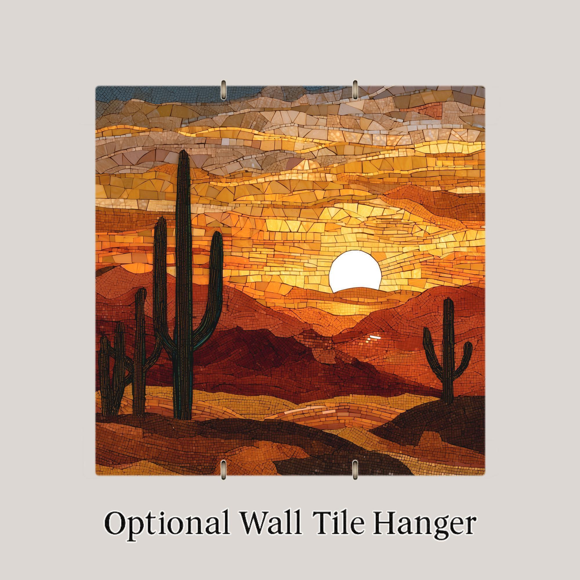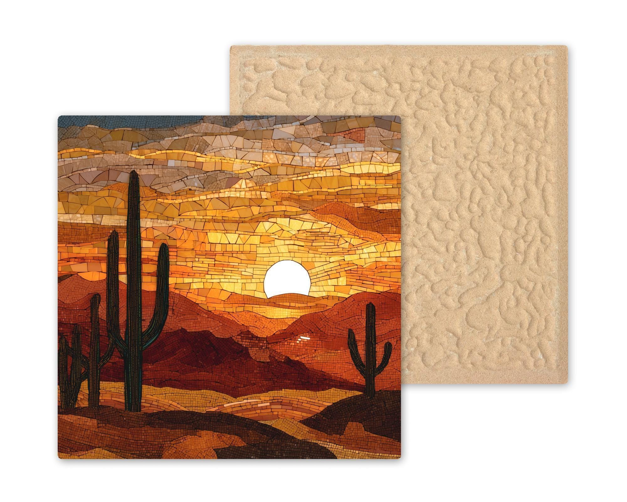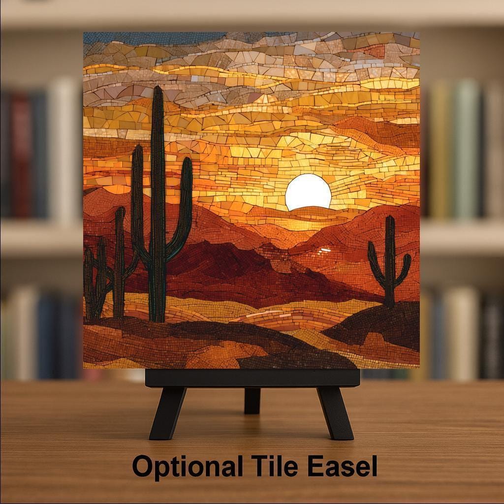 Bring the golden glow of the desert sunset into your home with this Desert Sunset ceramic tile wall art. Its vivid stained glass style design captures the stillness of cactus silhouettes against a sky of molten orange and deep amber. Each detail reflects the tranquility of evening light and the quiet beauty of the Southwest.