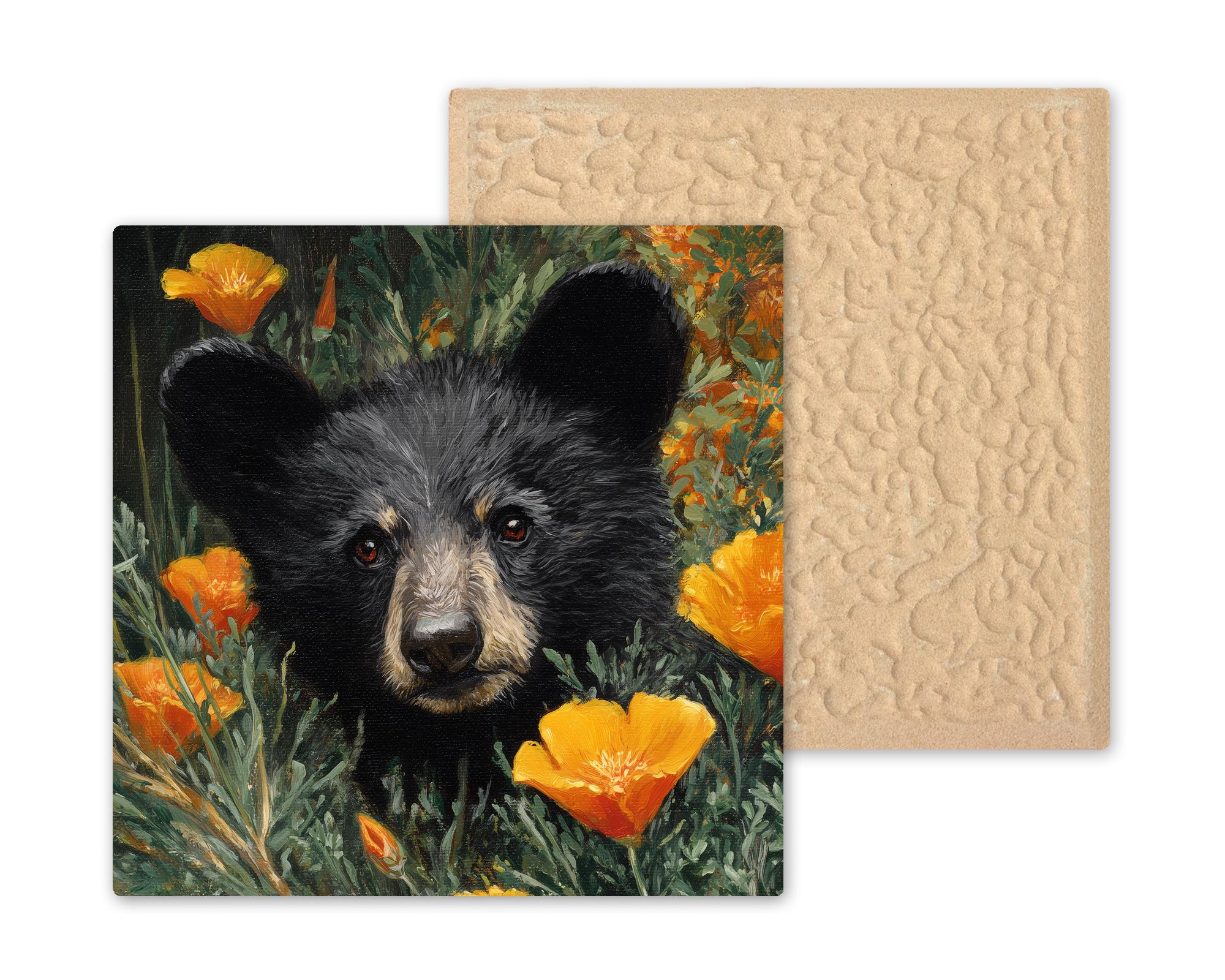This Black Bear Cub Ceramic Tile Wall Art offers a warm and whimsical moment of nature captured in a lasting, display-ready format. The adorable face of a young bear cub emerges from a bed of vivid orange California poppies, inviting curiosity, calm, and a connection to the wild. The artwork balances rustic forest charm with floral detail, creating a piece that is at once bold and gentle, earthy and vibrant.