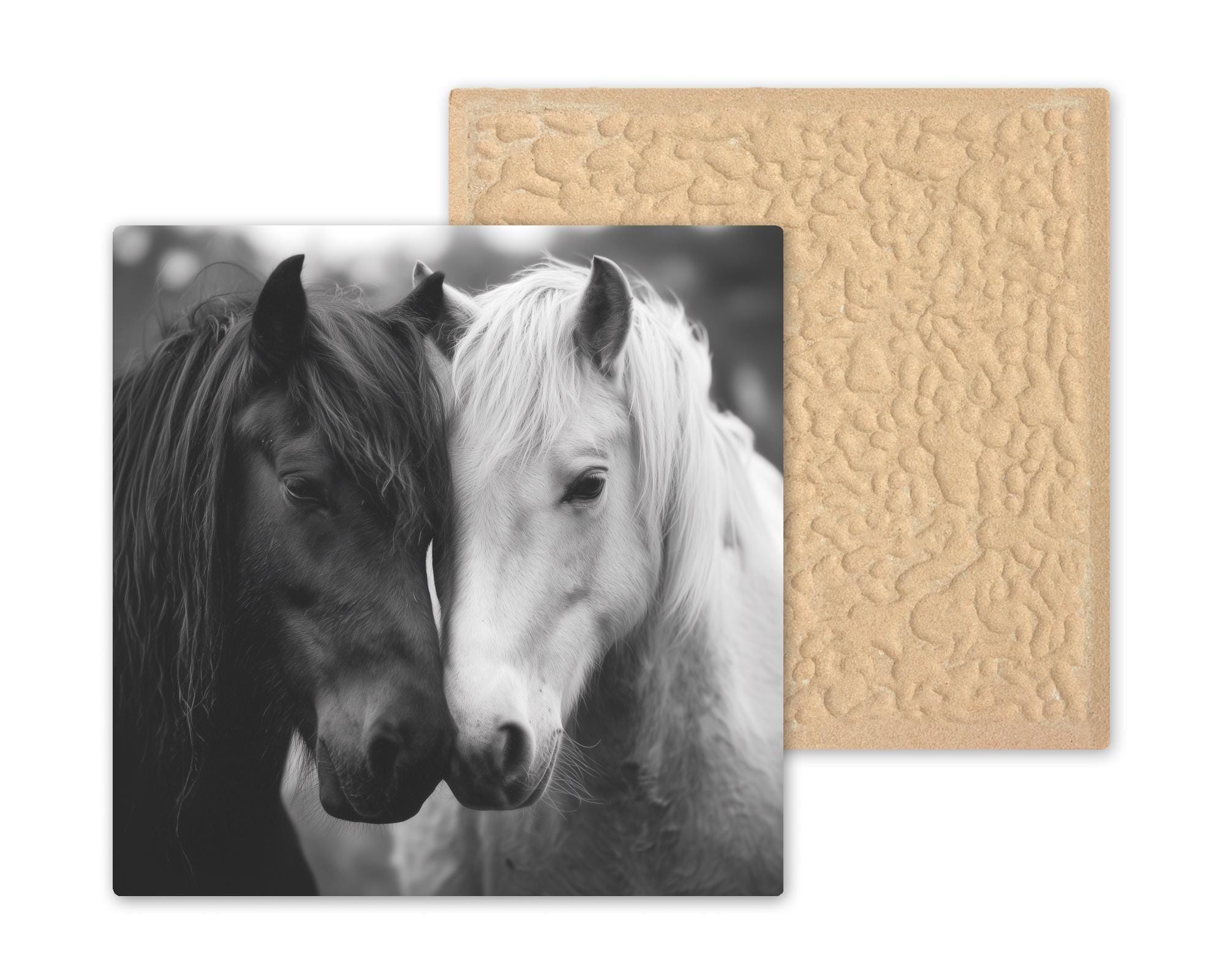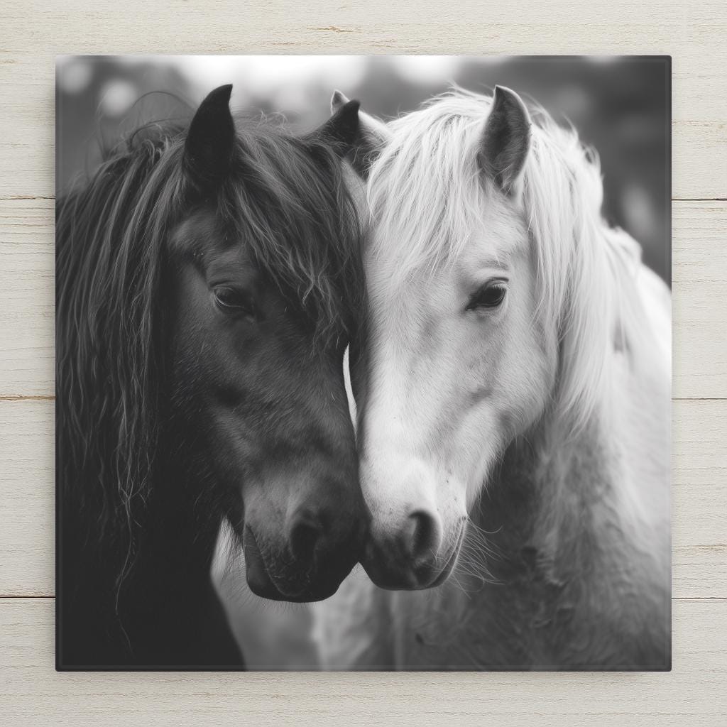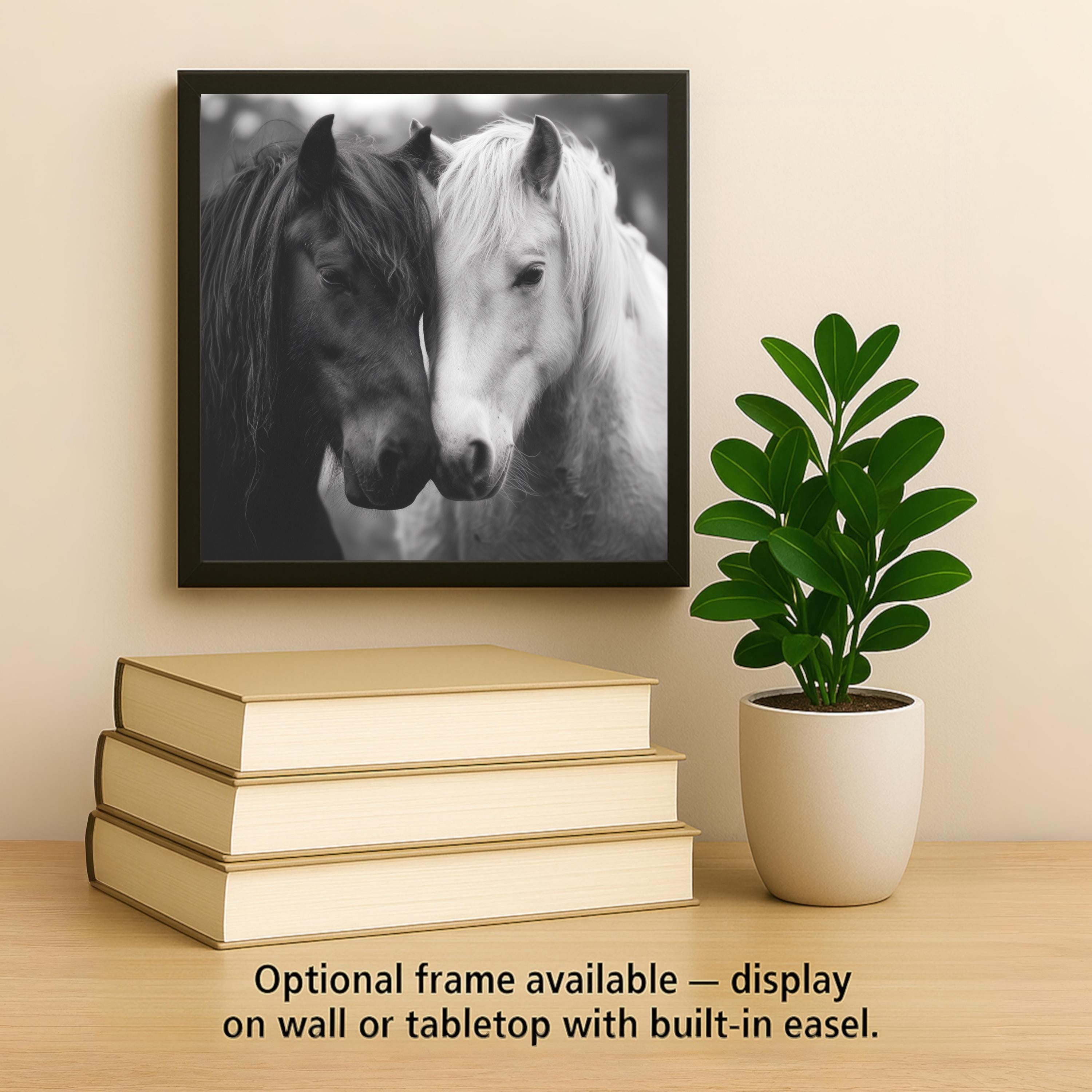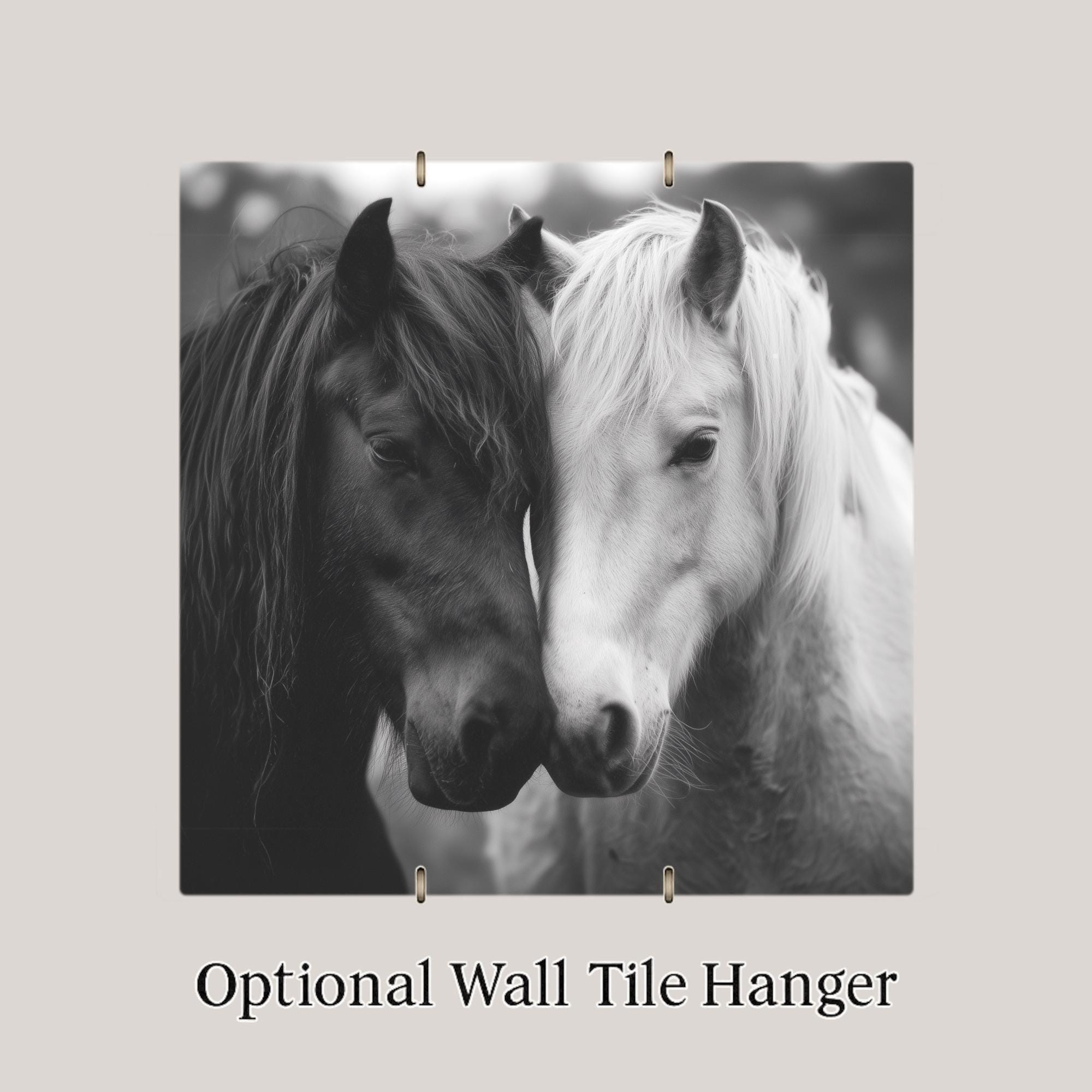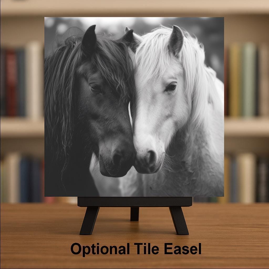 This Black and White Horses ceramic tile wall art captures a heartfelt moment of connection and grace. The image features two horses — one dark, one light — their foreheads gently touching, symbolizing unity and peace. The rich contrast and soft grayscale tones evoke both strength and tenderness, creating a piece that feels timeless and emotionally powerful.