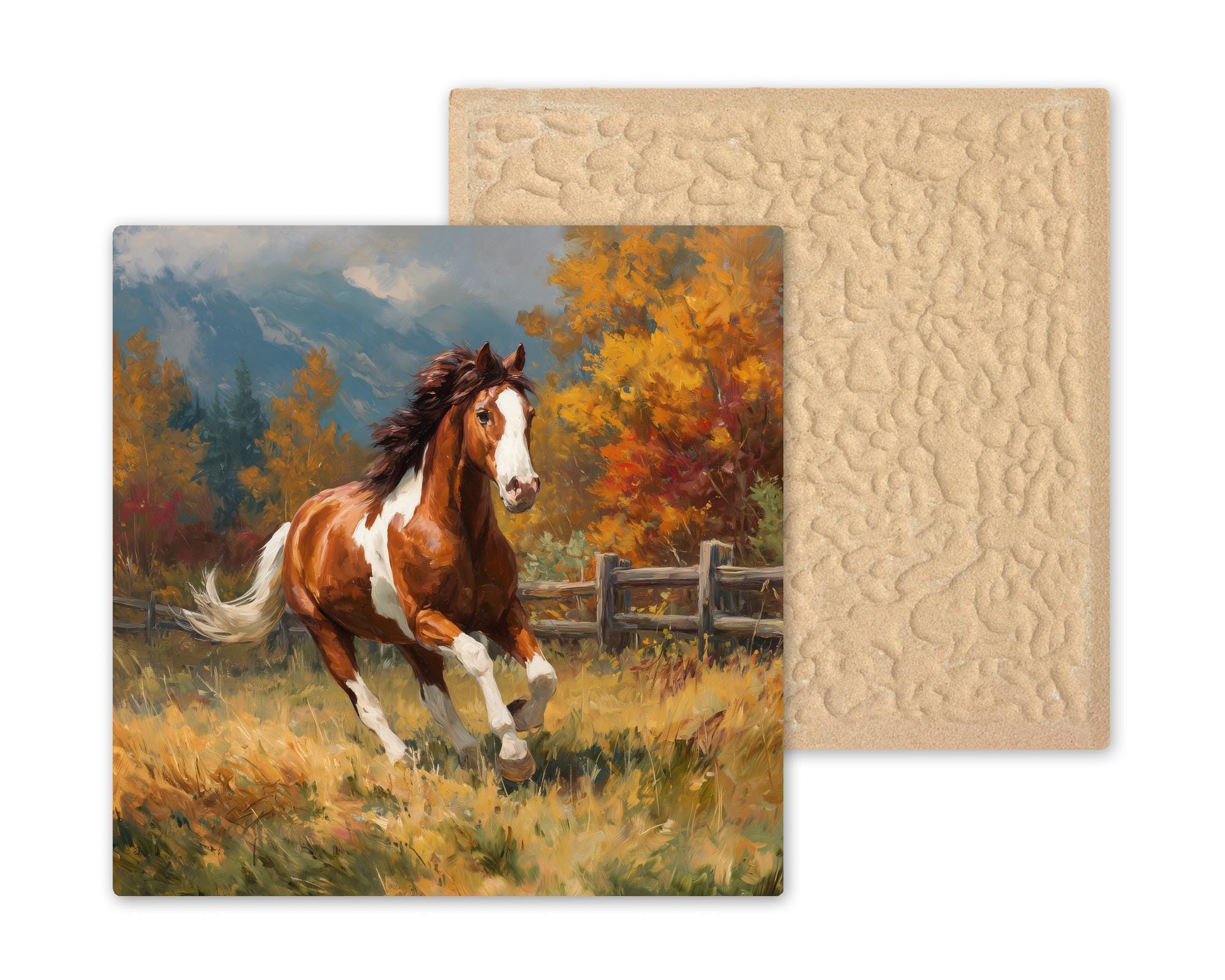 This beautiful tile combines the energy of the galloping horse with the warmth of autumn hues, bringing natural beauty and rustic sophistication to your home decor.