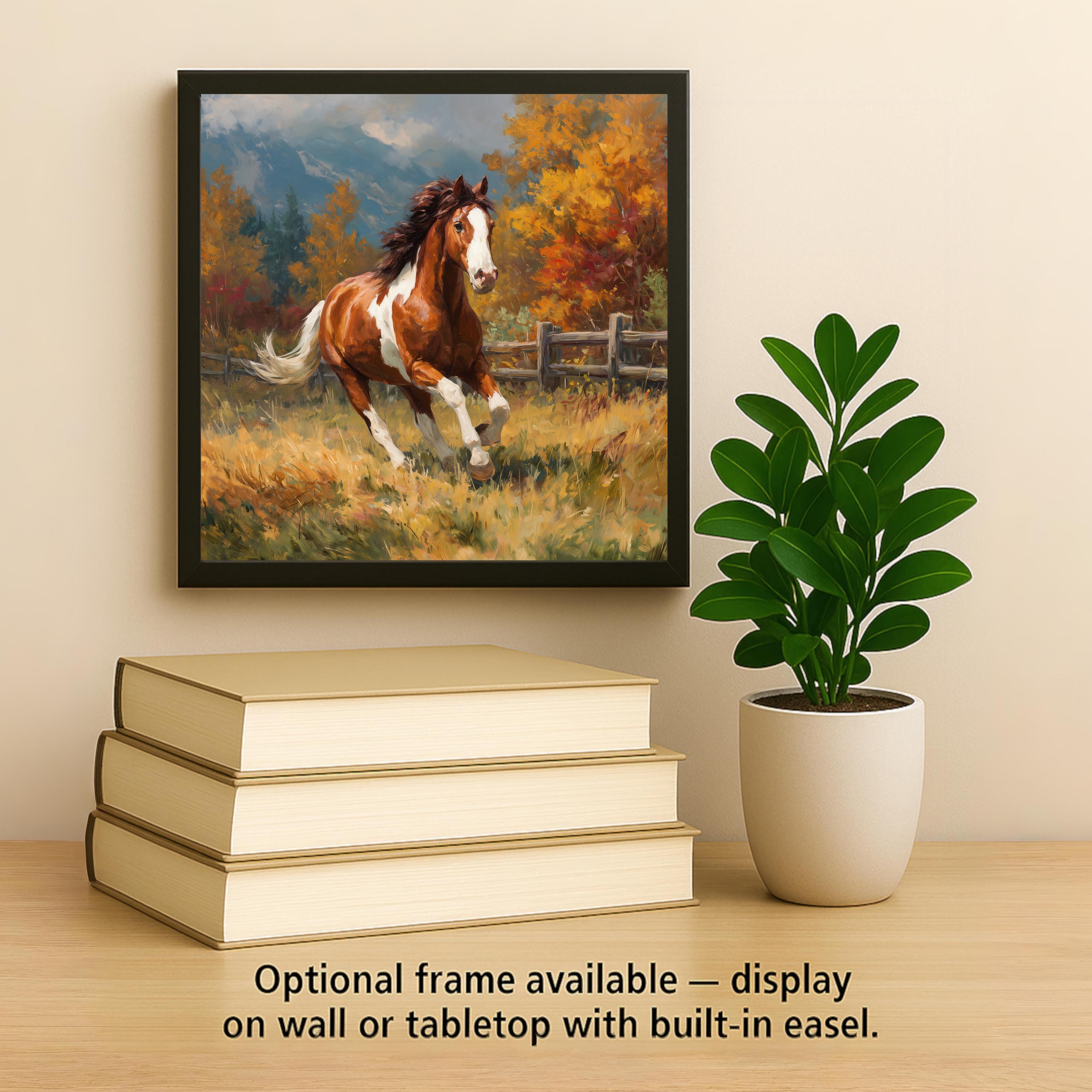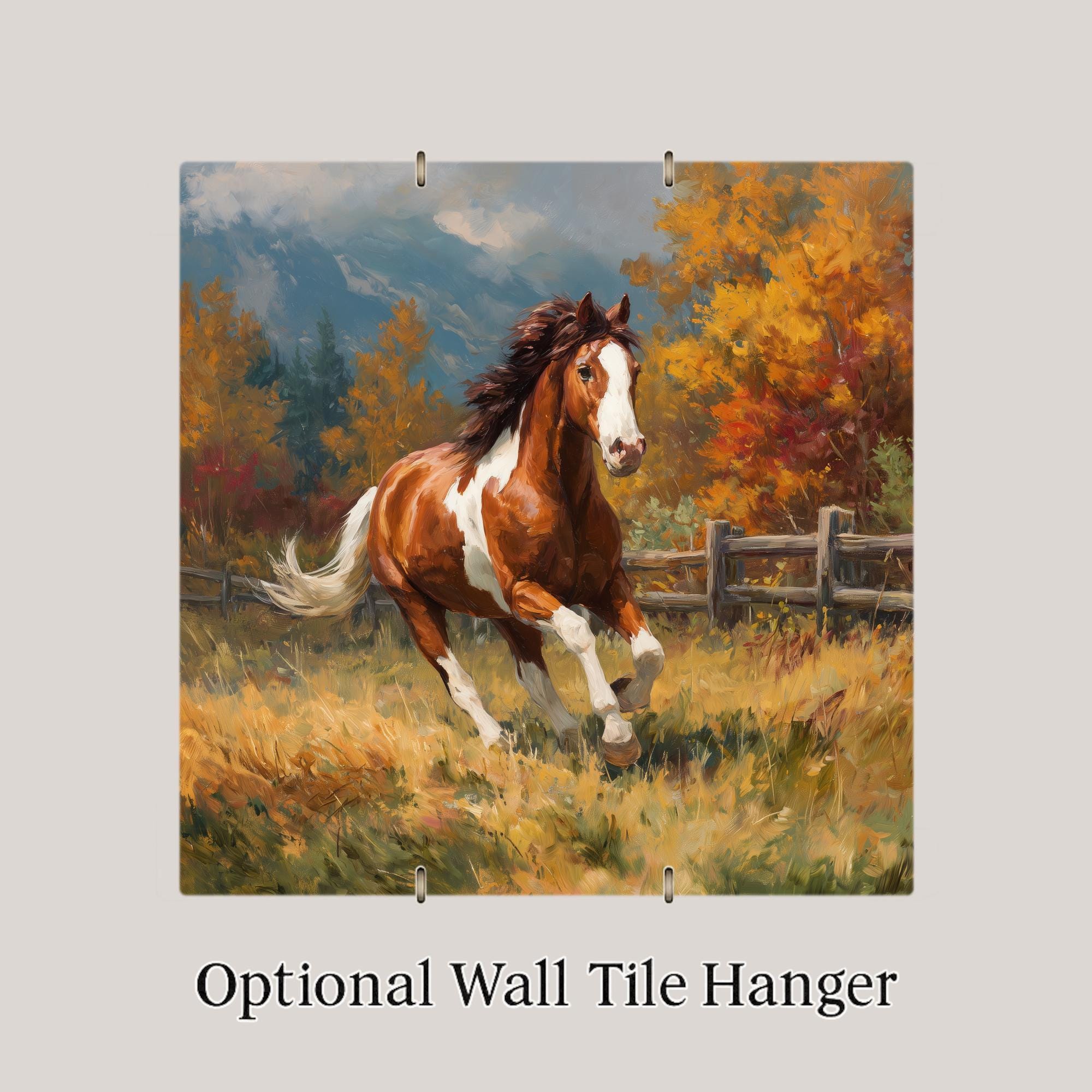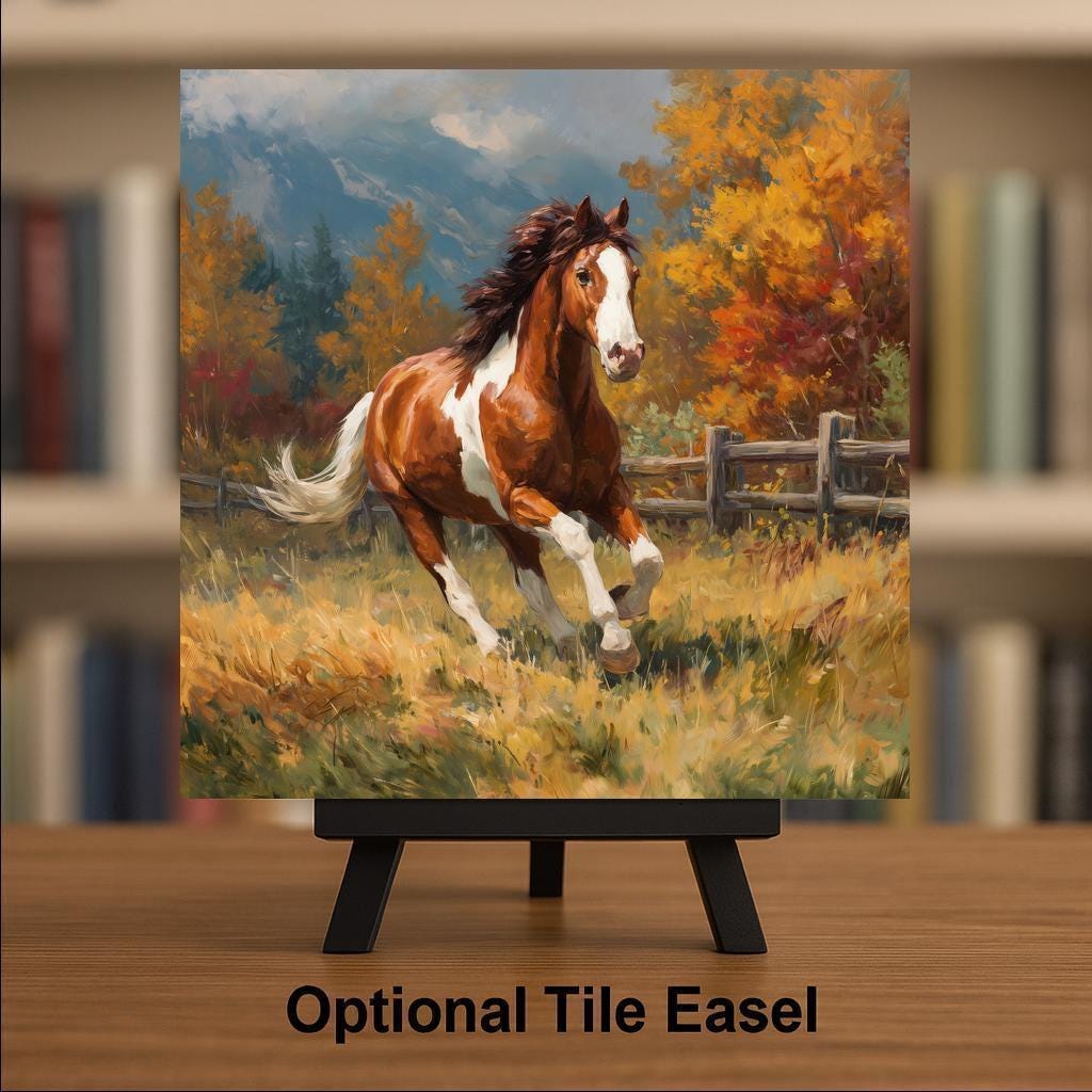 Bring the essence of open fields and golden sunsets into your home with this Galloping Horse ceramic tile wall art. Set against a stunning autumn backdrop, the horse’s chestnut coat and white markings gleam with life and motion. The artwork’s painterly style and bold color palette perfectly capture the spirit of fall and the rugged charm of country living.
