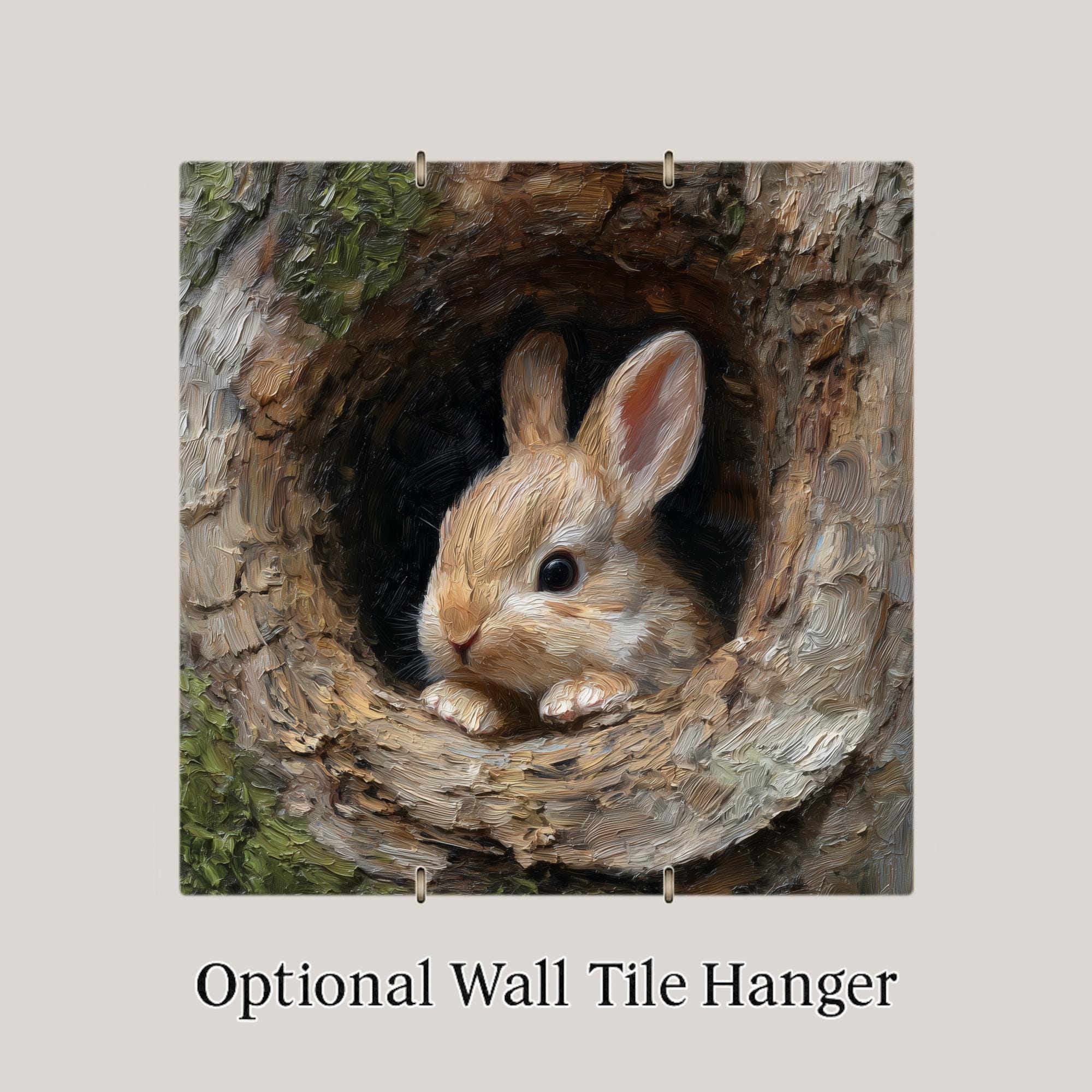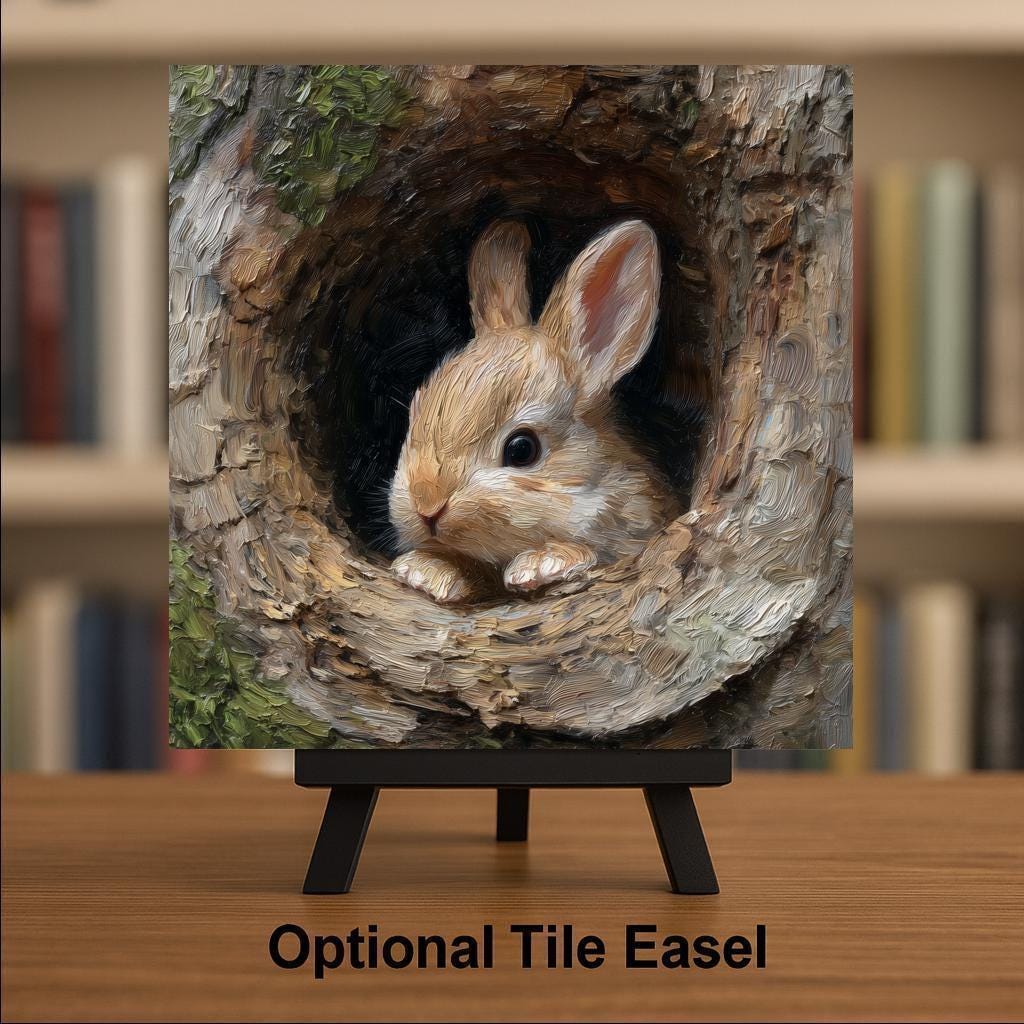 This sweet baby rabbit ceramic tile is designed to brighten any room with soft, peaceful woodland energy. The painting-style artwork shows a curious bunny resting in a tree hollow, surrounded by earthy textures and natural tones. The design feels cozy, gentle, and full of personality—perfect for anyone who loves forest creatures or rustic home décor.