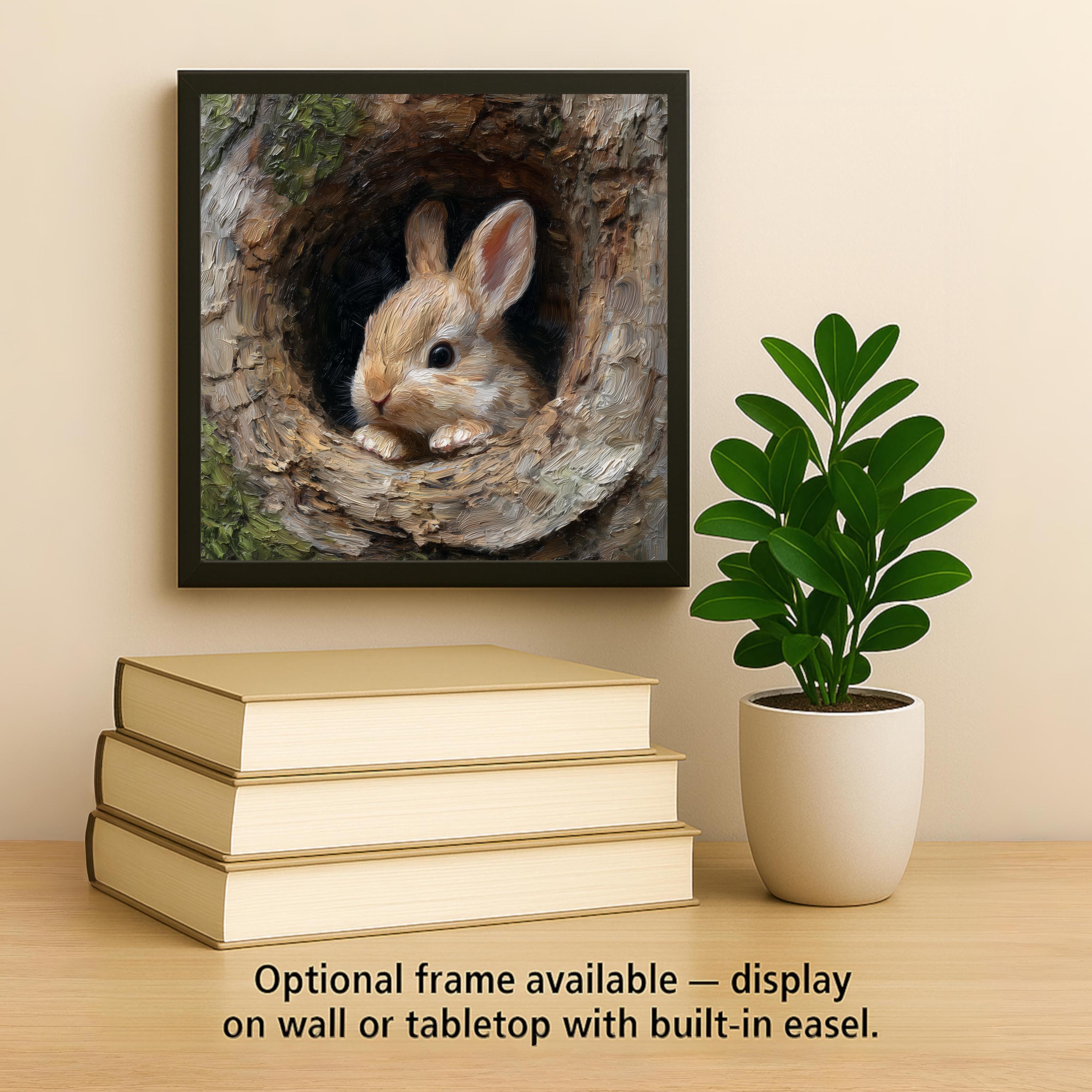 You can customize your display with optional add-ons such as a tile wall hanger, easel stand, or cork backing. Our premium frame is also available and can be used two ways—either hung on the wall or used as a tabletop stand. This gives you flexibility to place your bunny art wherever it looks best.