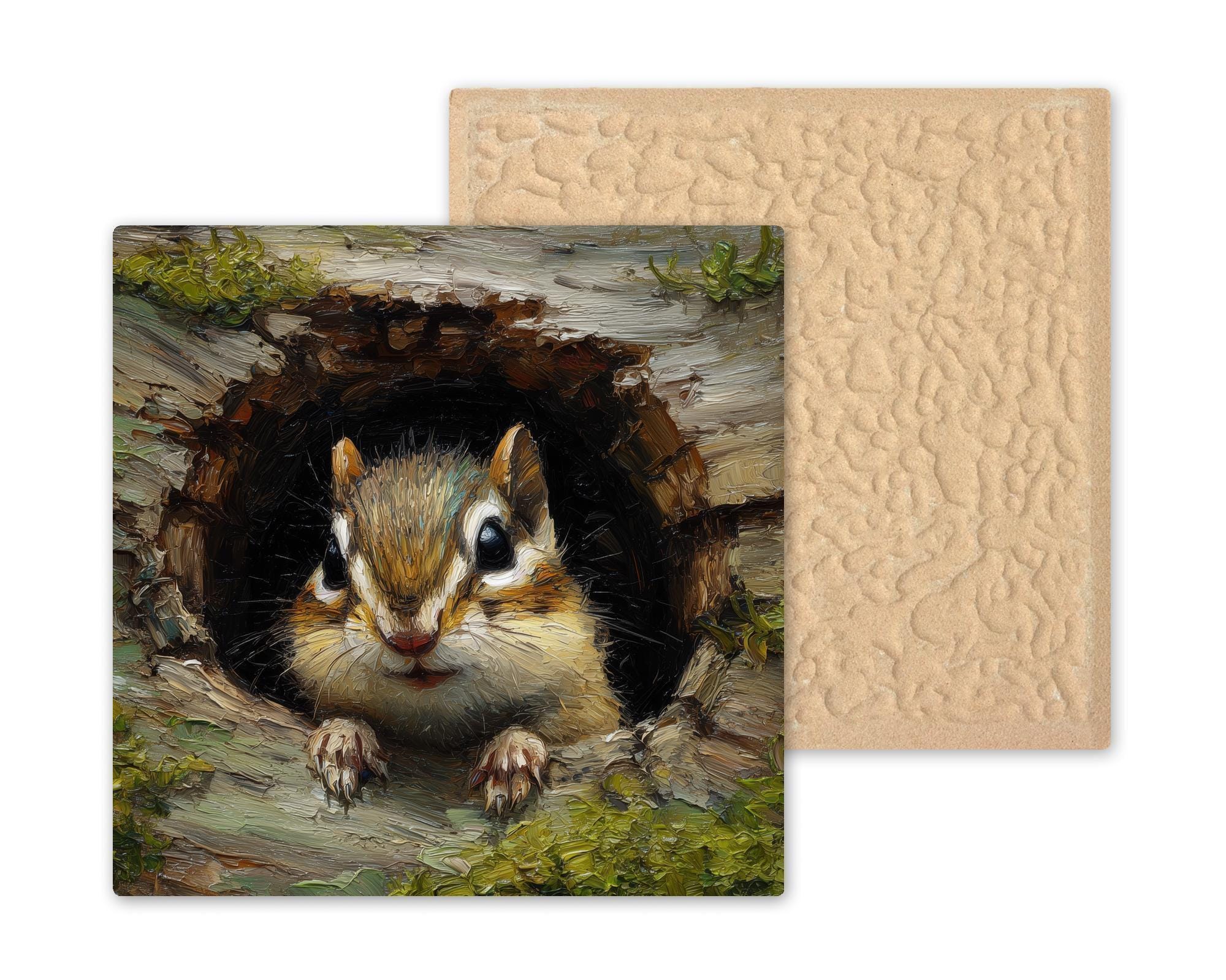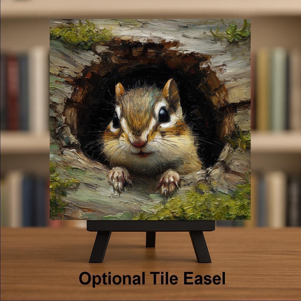 This woodland chipmunk ceramic tile captures the playful charm and bright-eyed spirit of one of the forest’s cutest little creatures. The artwork shows a chipmunk peeking from a tree hollow, surrounded by soft textures, detailed brush strokes, and warm natural colors. It brings an inviting rustic feel that works beautifully with woodland themes, cabin decor, farmhouse styles, or any home that celebrates nature.