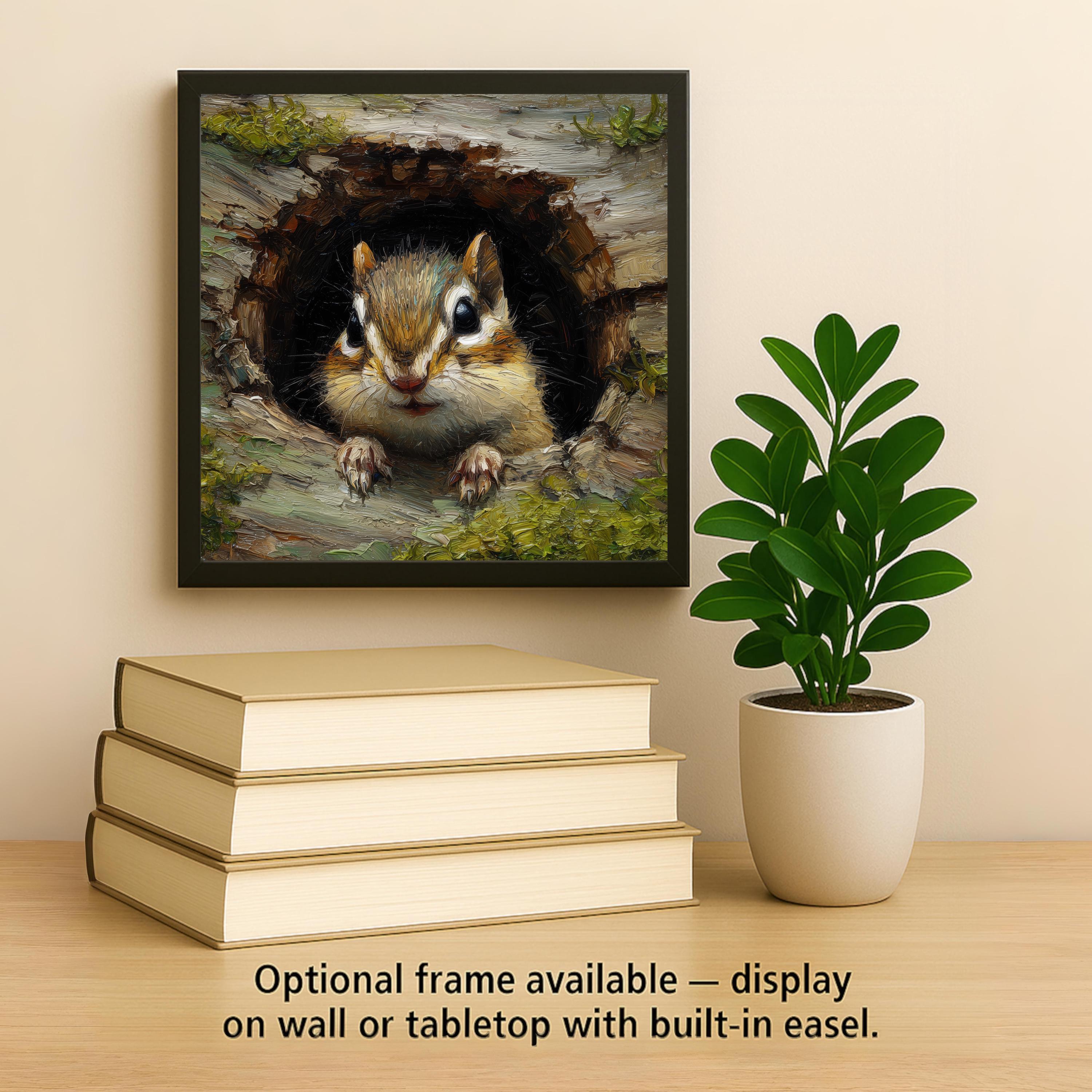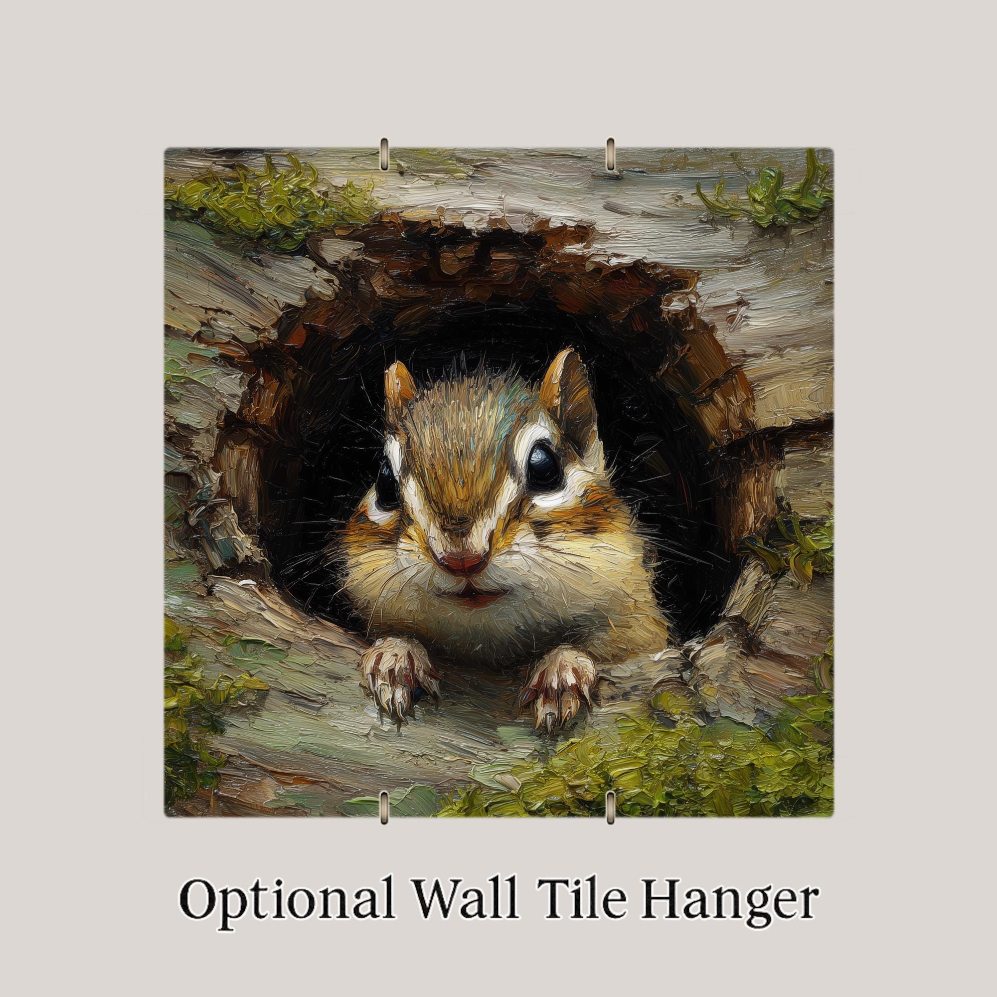 You can customize the display with an optional tile wall hanger, easel stand, or cork backing. Our premium frame gives even more flexibility—use it on a wall or as a stand for tabletop display. Whether you want a bold art piece or a simple woodland accent, the chipmunk tile adapts easily to your home decor style.