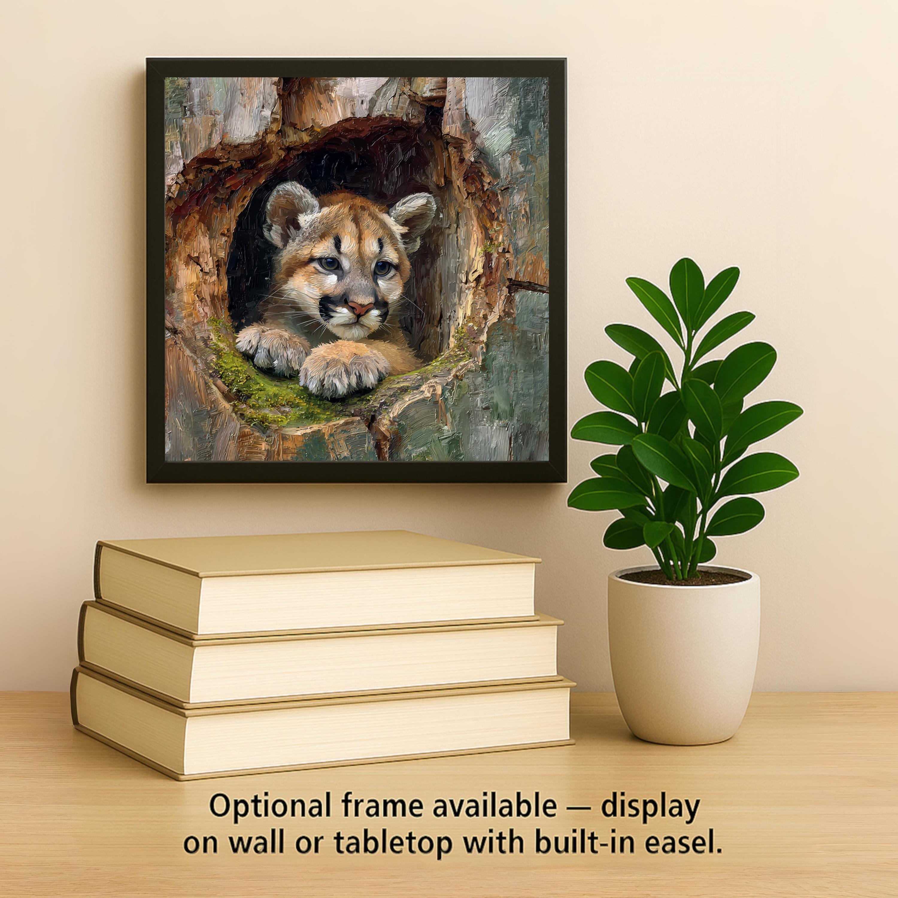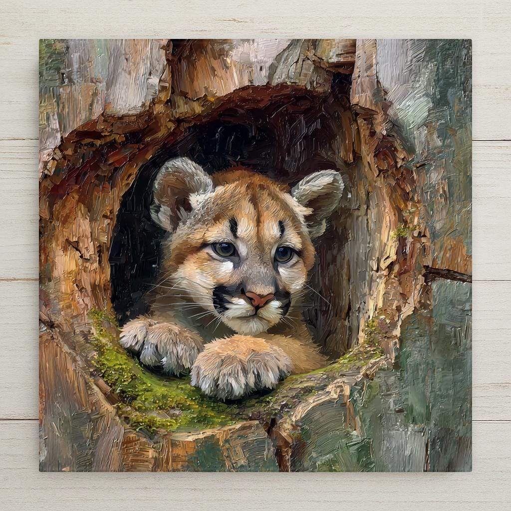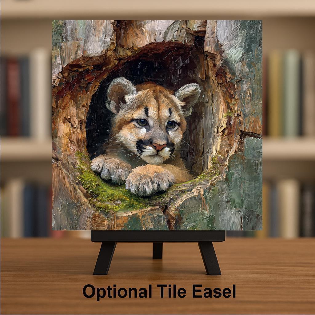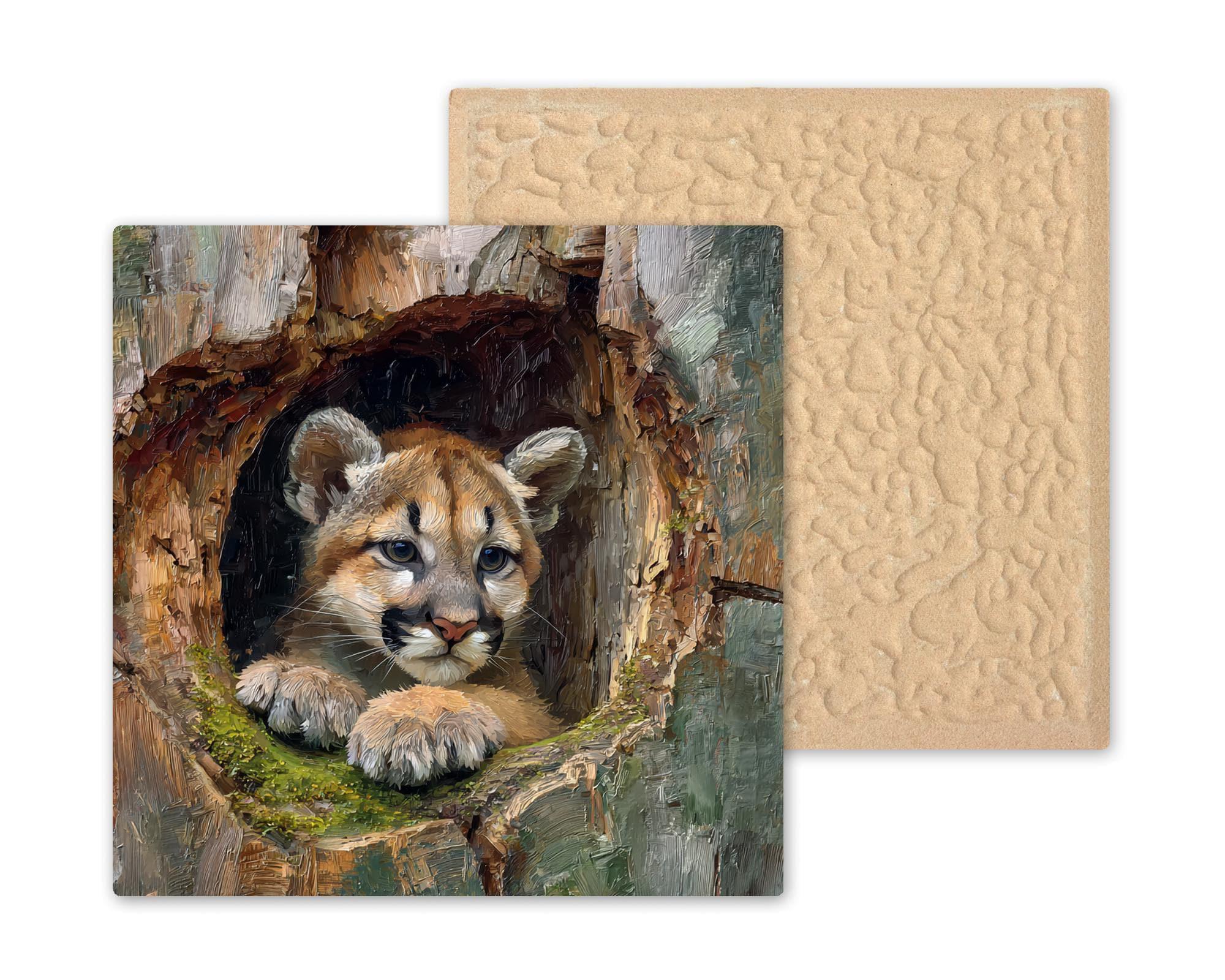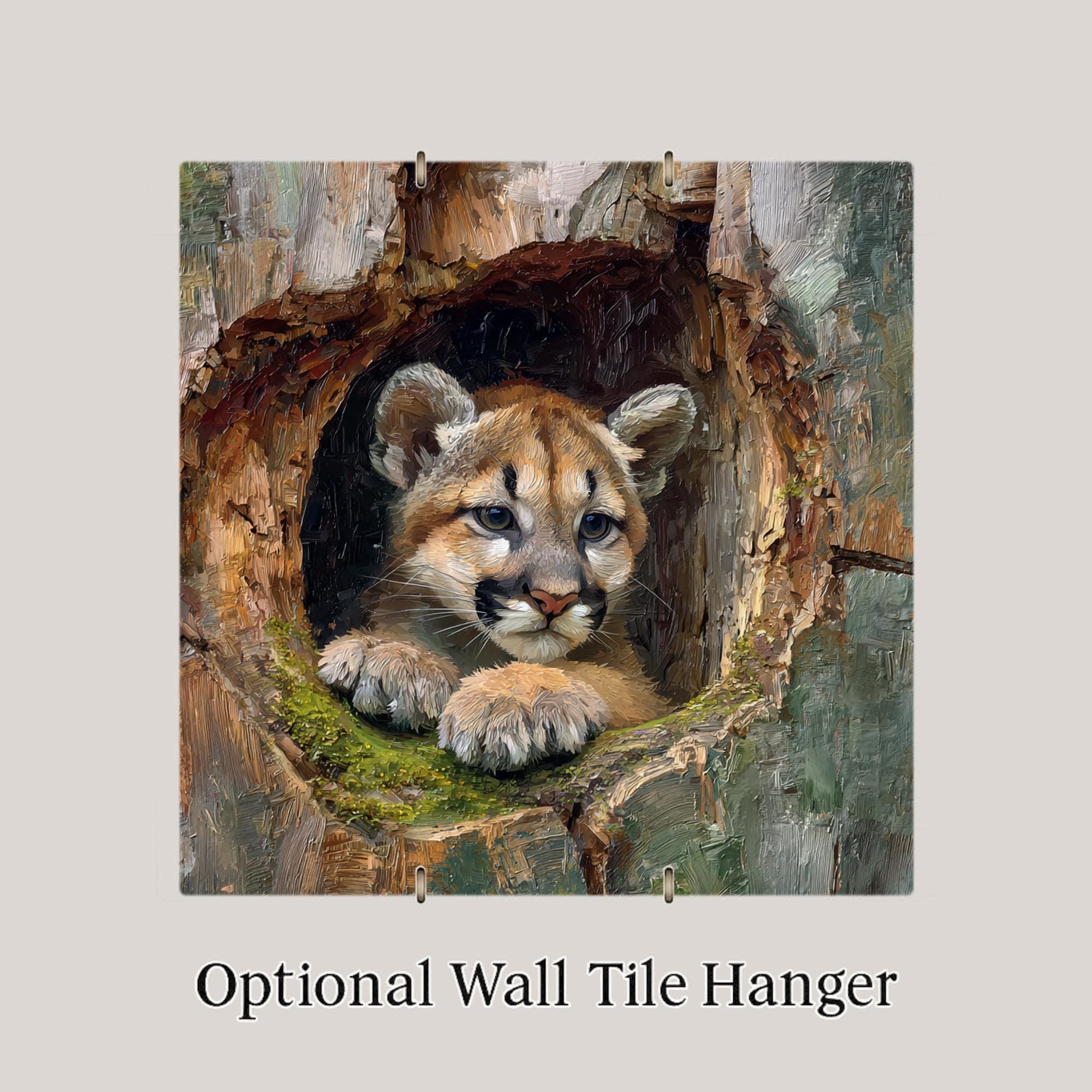 This baby mountain lion ceramic tile brings a gentle woodland feel to your home decor. The artwork shows the young cub resting inside a tree hollow, surrounded by warm bark textures and soft moss. The expression on the cub’s face adds sweetness and curiosity to the design. This tile works beautifully in rustic home decor, woodland nurseries, cabin wall decor, and nature-inspired rooms. The colors blend well with natural wood, warm lighting, and earthy tones. The artwork is permanently printed on durable ceramic, giving you rich detail and long-lasting color. It is easy to clean and perfect for everyday display.