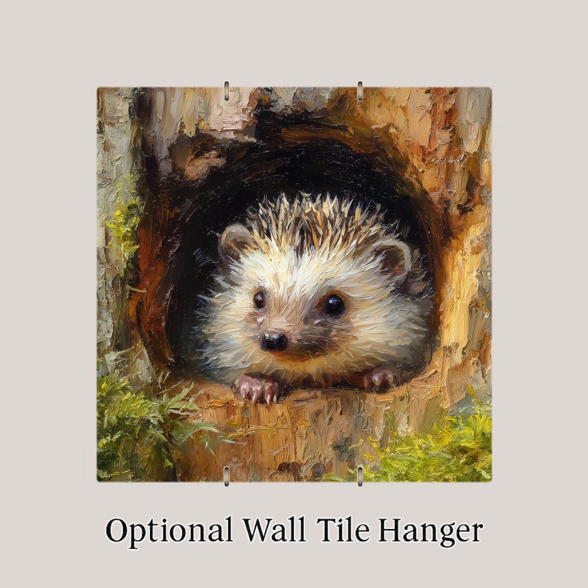 This woodland hedgehog ceramic tile wall art captures a sweet moment in nature that brings warmth to any room. The little hedgehog rests at the opening of a tree hollow, surrounded by moss, bark, and soft earthy tones. The artwork has the gentle look of hand-painted oil but is permanently printed onto the ceramic tile for lasting color and clarity. This makes the tile a great choice for nature-themed rooms, woodland nurseries, cozy reading nooks, rustic kitchens, offices, and calm meditation spaces. The colors pair beautifully with farmhouse décor, cabin décor, rustic wall art, and cottagecore-inspired interiors.