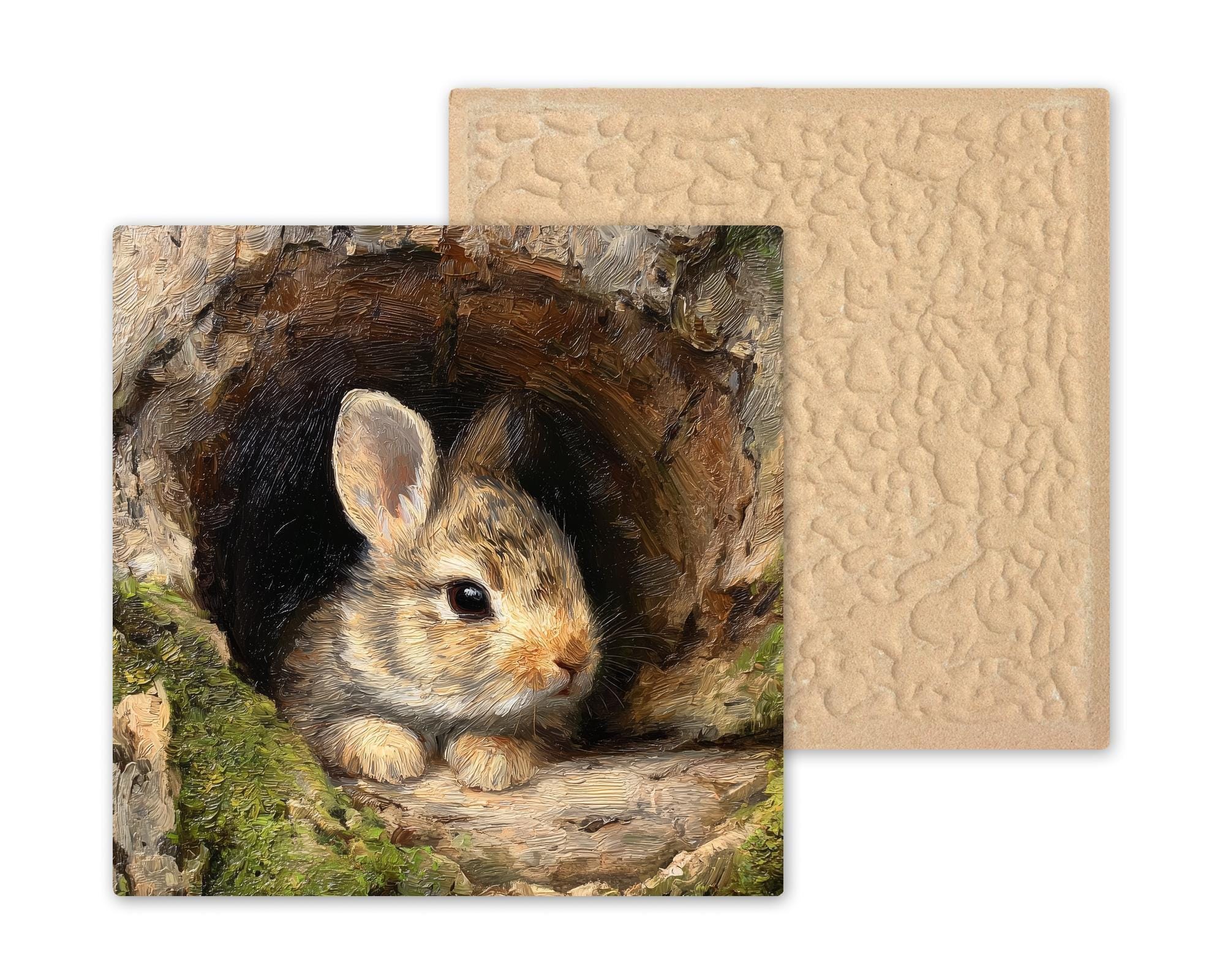 This adorable bunny ceramic tile wall art captures a peaceful moment in nature and brings it indoors. The little rabbit is tucked inside a round tree hollow, surrounded by mossy details and weathered bark textures that create a cozy woodland setting. The artwork has a gentle, painterly look with warm tones that make it perfect for rustic, farmhouse, cottage, and woodland-inspired decor. The design is printed permanently on the ceramic tile, giving you lasting color, clear detail, and a smooth finish that works beautifully as wall art.