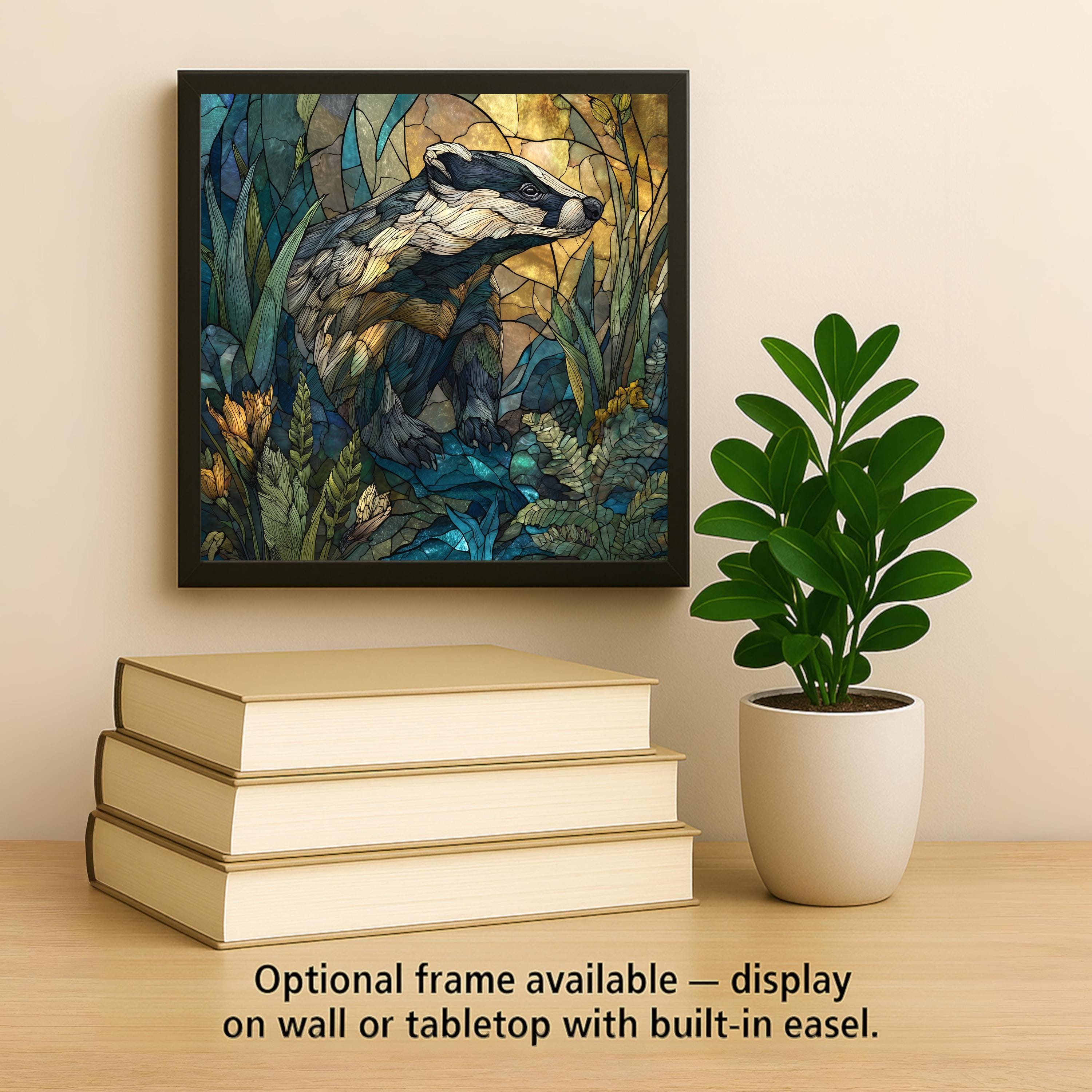 This stained-glass style badger ceramic tile is designed for anyone who loves woodland animals, rustic décor, or peaceful natural artwork. The design features deep blues, warm golds, and textured foliage that surrounds the badger as if it’s emerging from a glowing forest clearing. The colors pop in any room and create a relaxing, nature-inspired focal point.