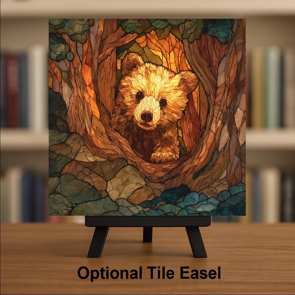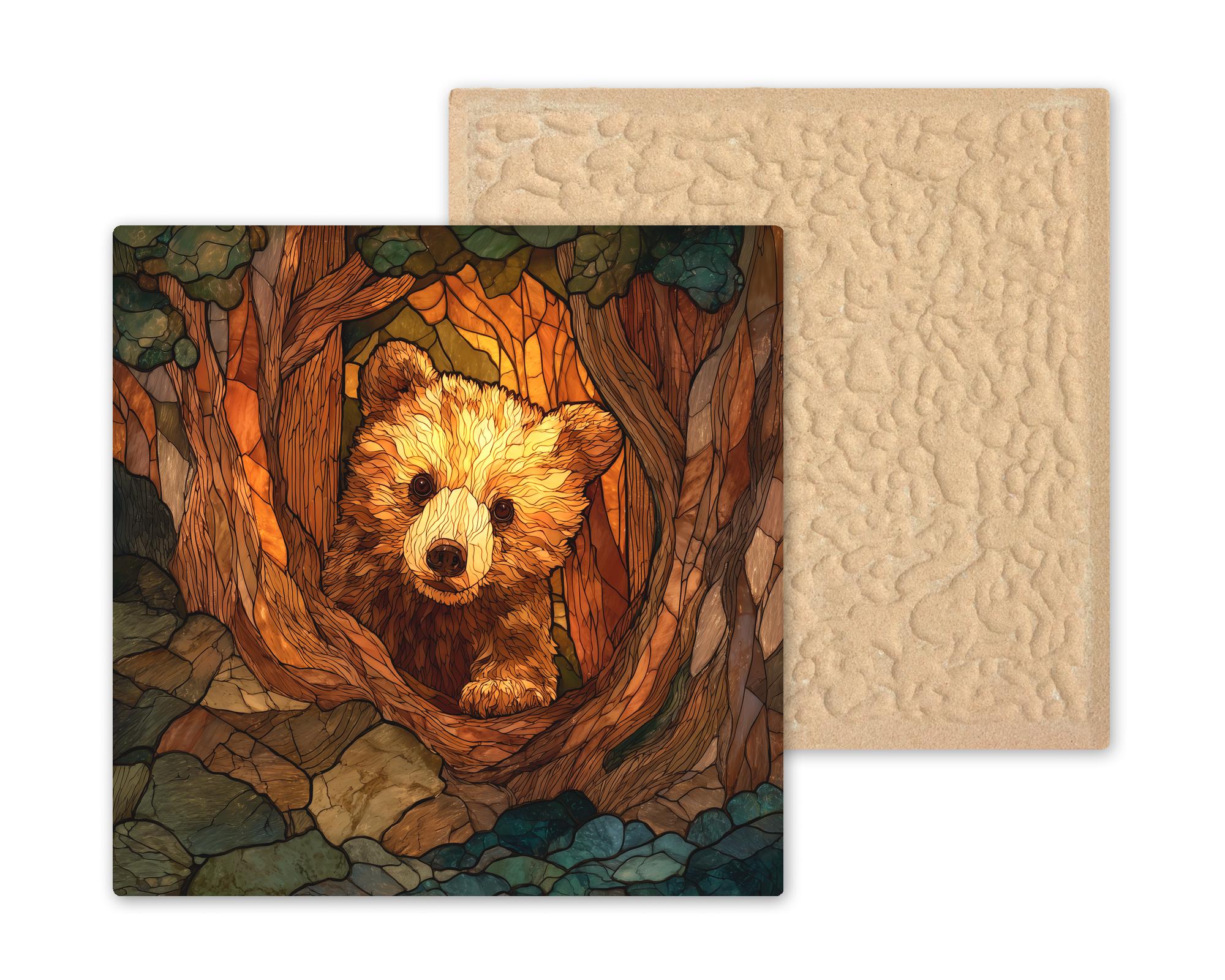 The print is professionally applied to a ceramic tile so it will not fade, peel, or wash off. Even though the artwork looks like stained glass or mosaic, it is not made of glass; it is a permanent print with a smooth finish that highlights every detail. The colors appear rich and luminous, bringing life to the cub, the tree bark, and the glowing forest around it.