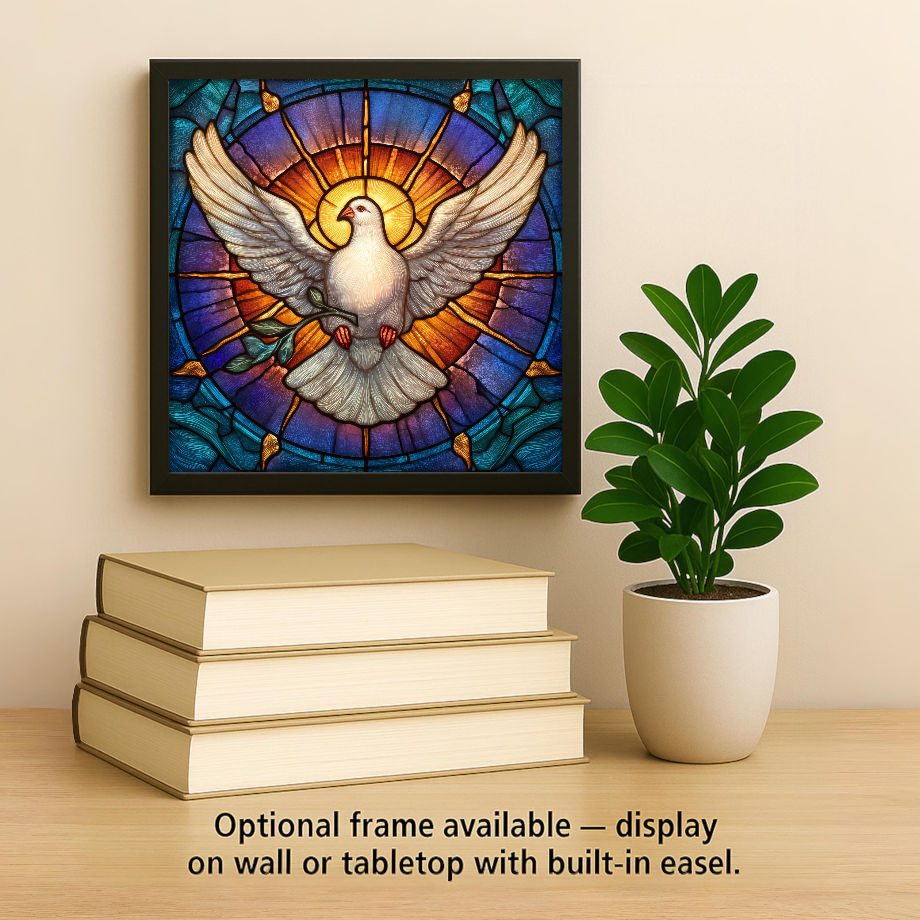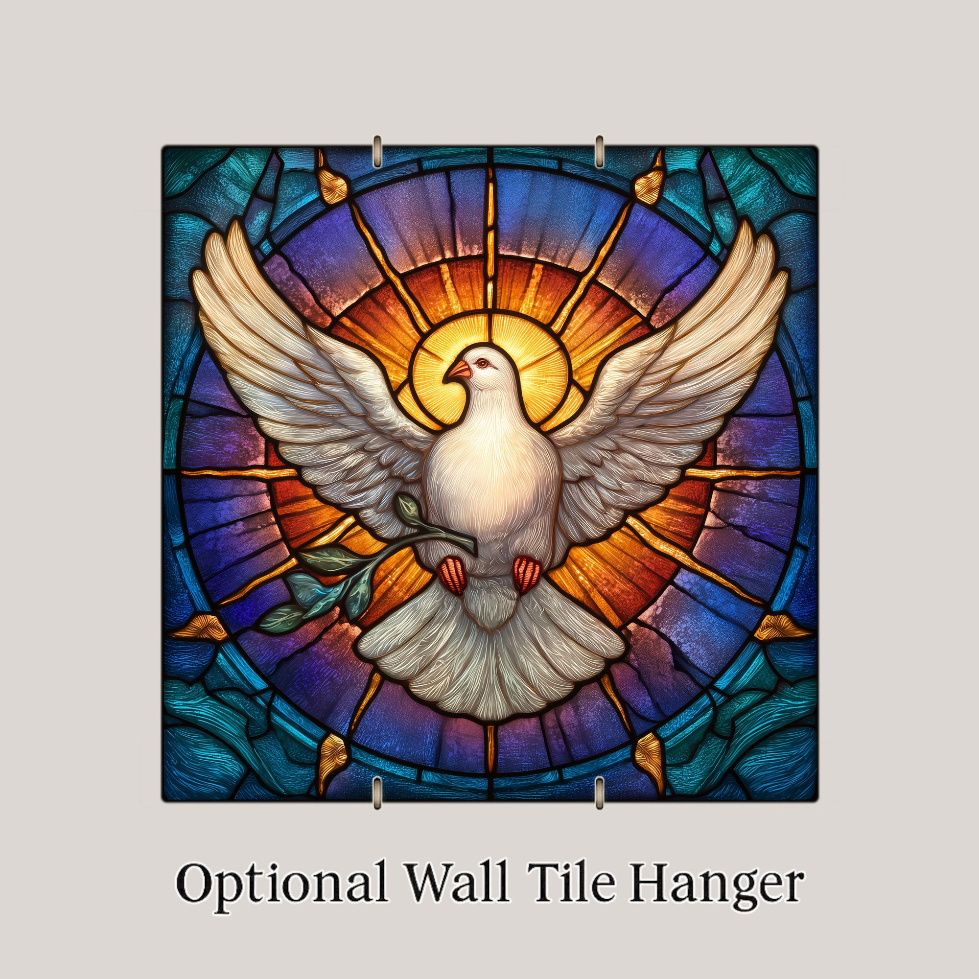 This stained-glass-style dove ceramic tile is designed to bring calm and comfort into your home. The artwork features a glowing white dove holding an olive branch, surrounded by rich blues, warm yellows, and bright rays of light. The design feels spiritual, peaceful, and inspiring, making it perfect for anyone who loves uplifting decor or symbolic imagery. Whether you display it in a bedroom, hallway, meditation space, or living room, it adds brightness and meaning to your home decor.