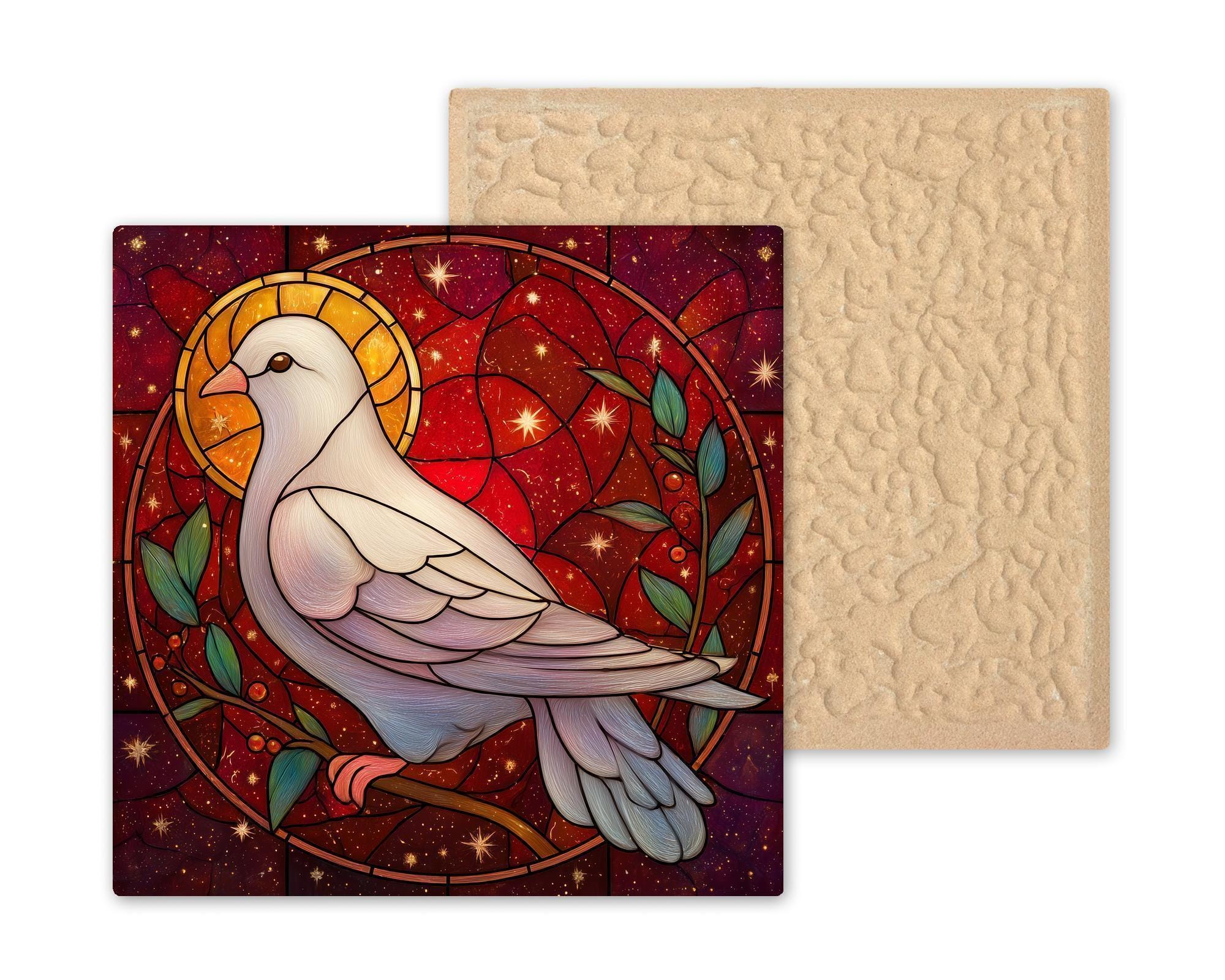 This ceramic tile features a modern stained glass–inspired illustration of a white dove, symbolizing peace and renewal. The warm golds, soft neutrals, and subtle texturing create a gentle glow that’s easy to style in both contemporary and traditional home decor. Many customers choose designs like this for entryways, living rooms, memorial corners, meditation spaces, and faith-based décor collections. It also makes a thoughtful sympathy or housewarming gift.