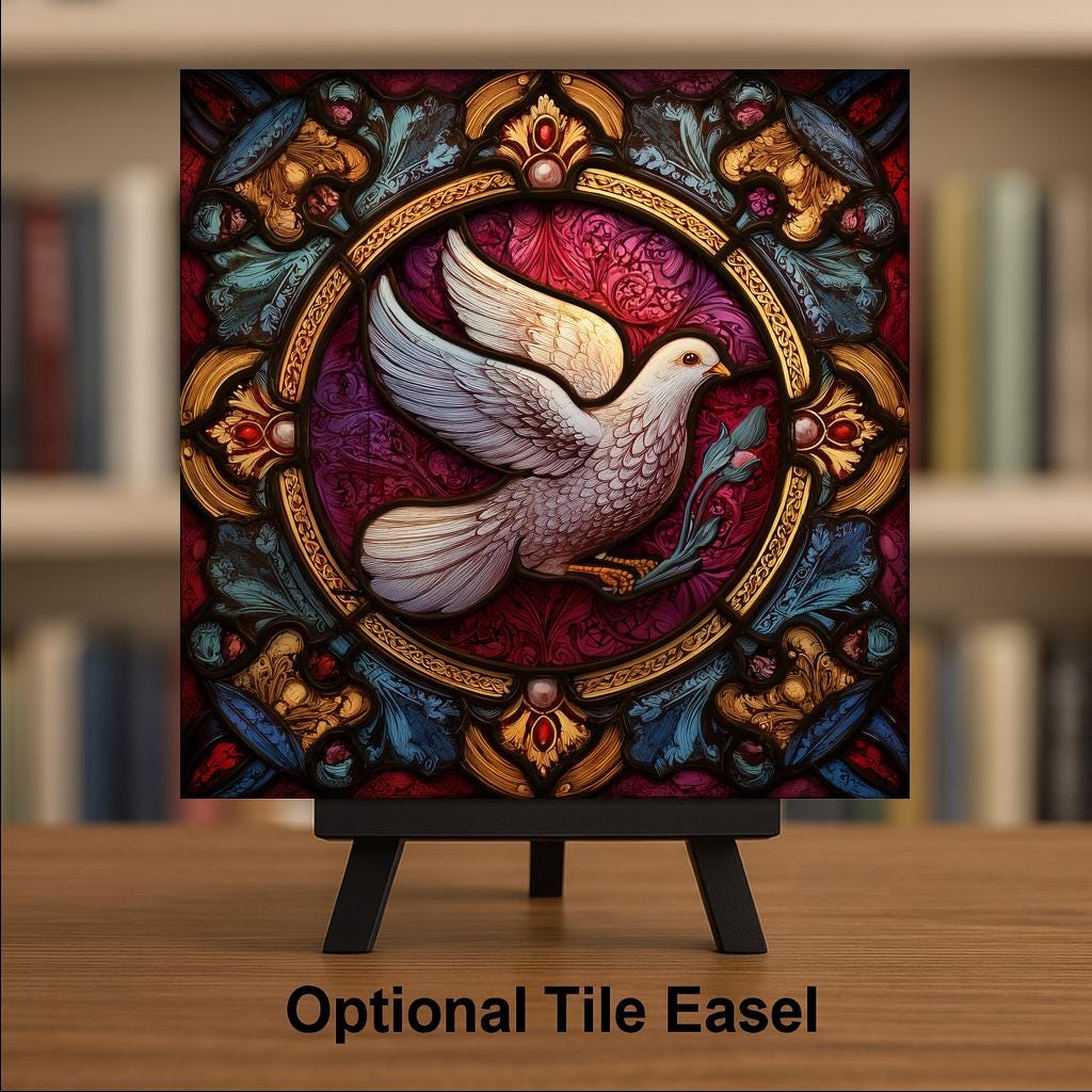 Customers enjoy this tile because it blends classic stained-glass artistry with modern durability. The colors stay bright and crisp indoors, and the texture of the design gives the piece a premium look. It fits well in homes that already feature Christian decor, inspirational artwork, farmhouse styles, vintage pieces, or warm natural colors. Many shoppers choose this tile for gifts during Christmas, Easter, weddings, baptisms, memorials, or any moment when a symbol of peace and hope is meaningful.
