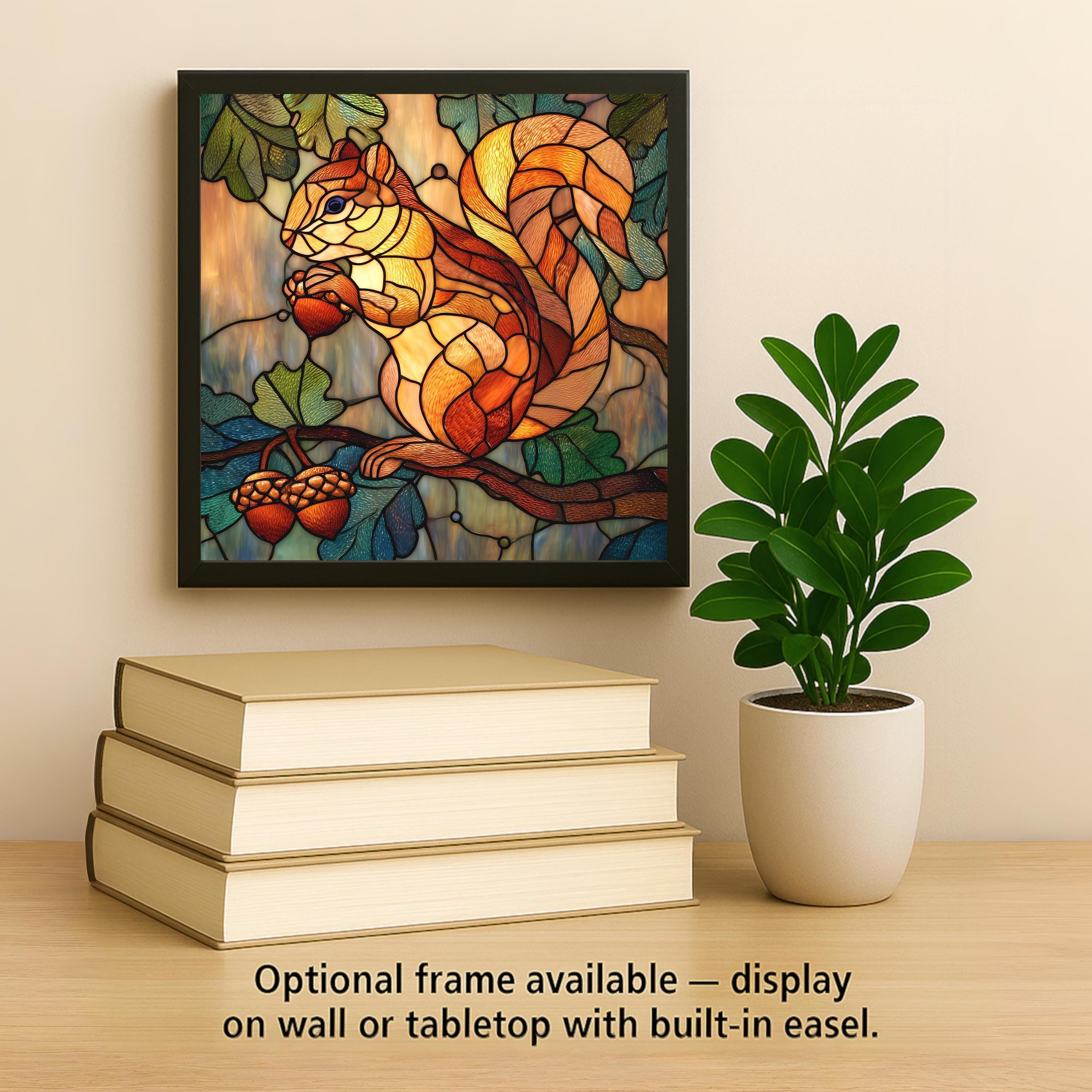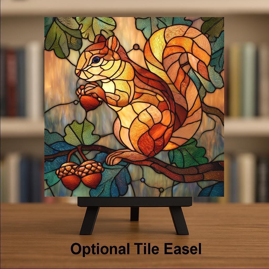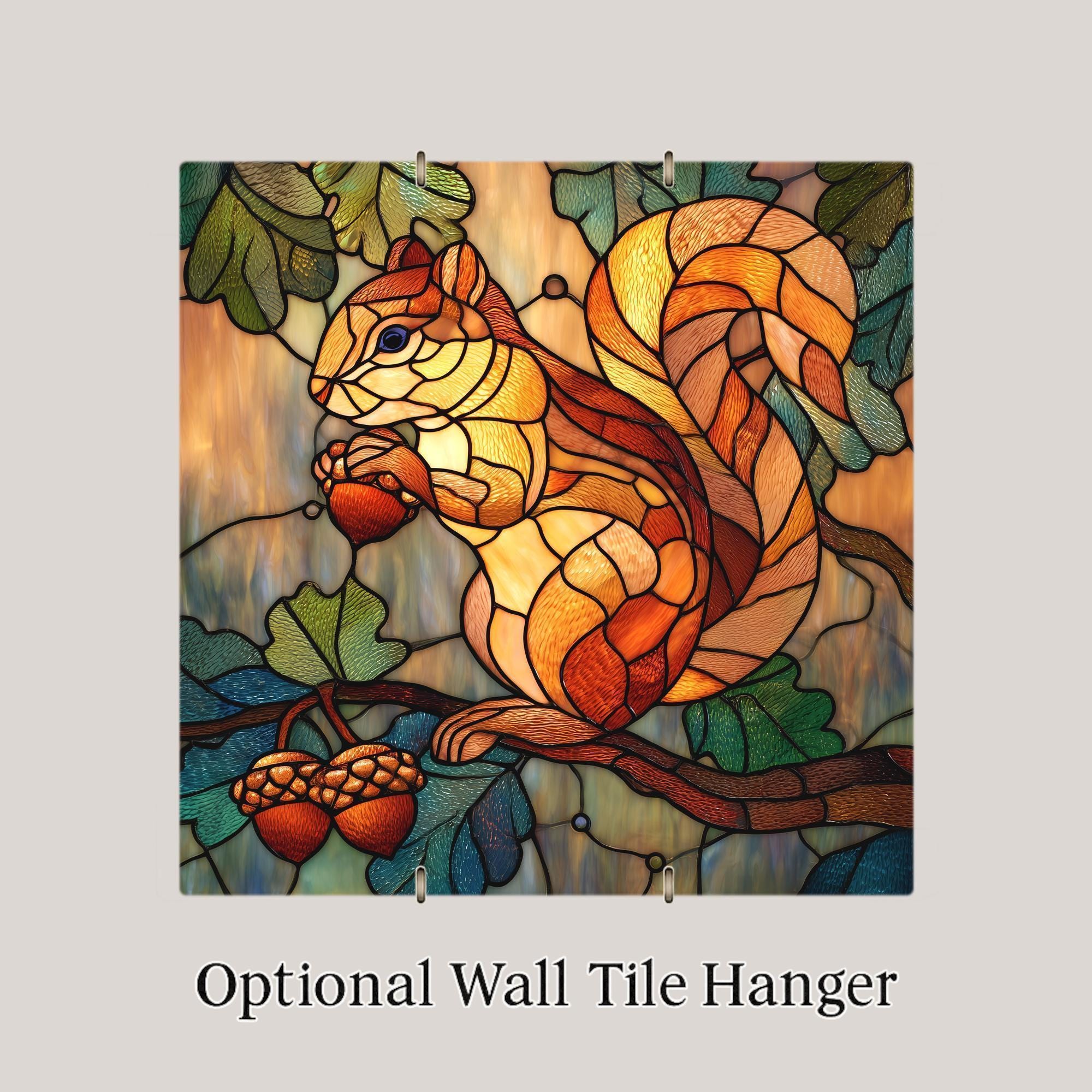 Bring a touch of woodland wonder to your home with this stained glass–style squirrel ceramic tile wall art. The rich colors, warm glow, and detailed design make this piece perfect for nature lovers or anyone decorating in a rustic, fall, cabin, or forest theme. The squirrel and acorn artwork is vibrant, textured, and eye-catching, giving you the look of stained glass art without the fragility. This tile adds depth and charm to any wall, shelf, or display area, making it a great fit for bedrooms, entryways, living rooms, offices, and gift-giving occasions.